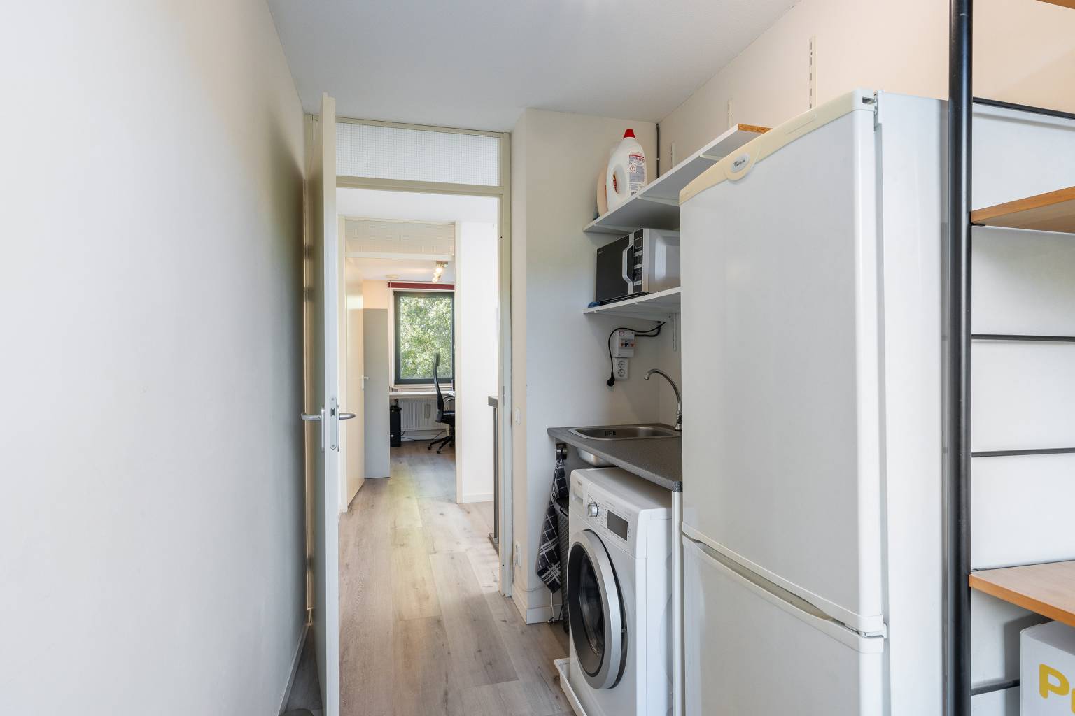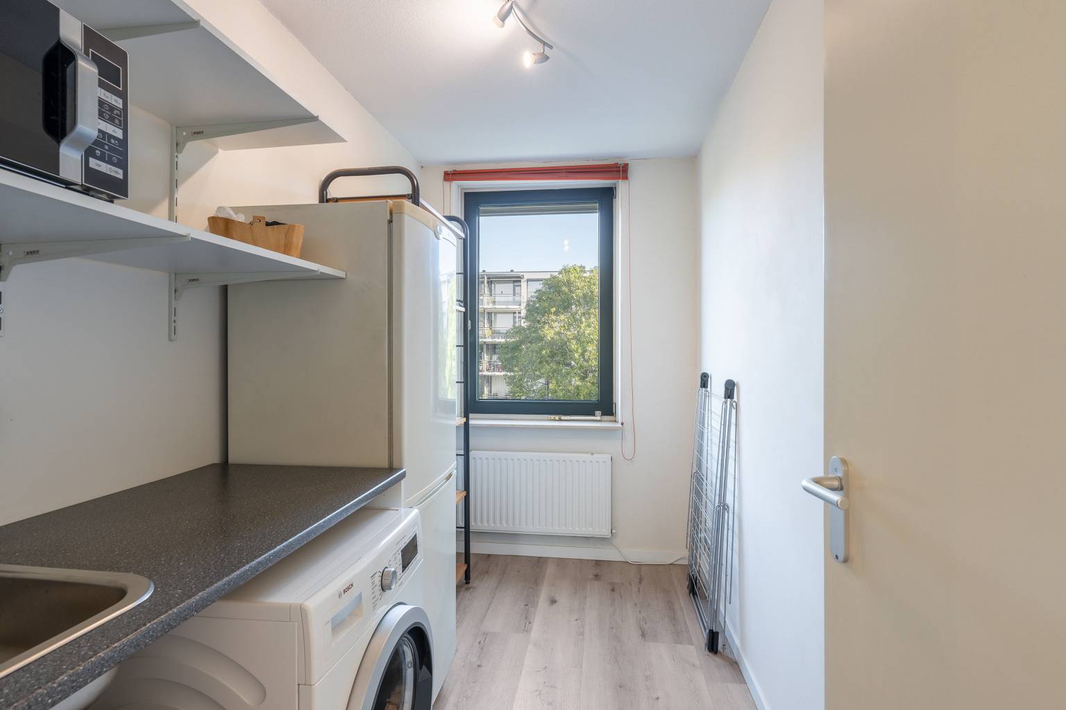 De wasruimte is een fijne aparte ruimte die genoeg ruimte biedt aan een werkblad met een spoelbak. Hieronder bevindt zich de aansluiting voor de wasmachine en daarnaast is er nog genoeg ruimte voor een andere spullen, zoals een droogrek of een strijkplank.
