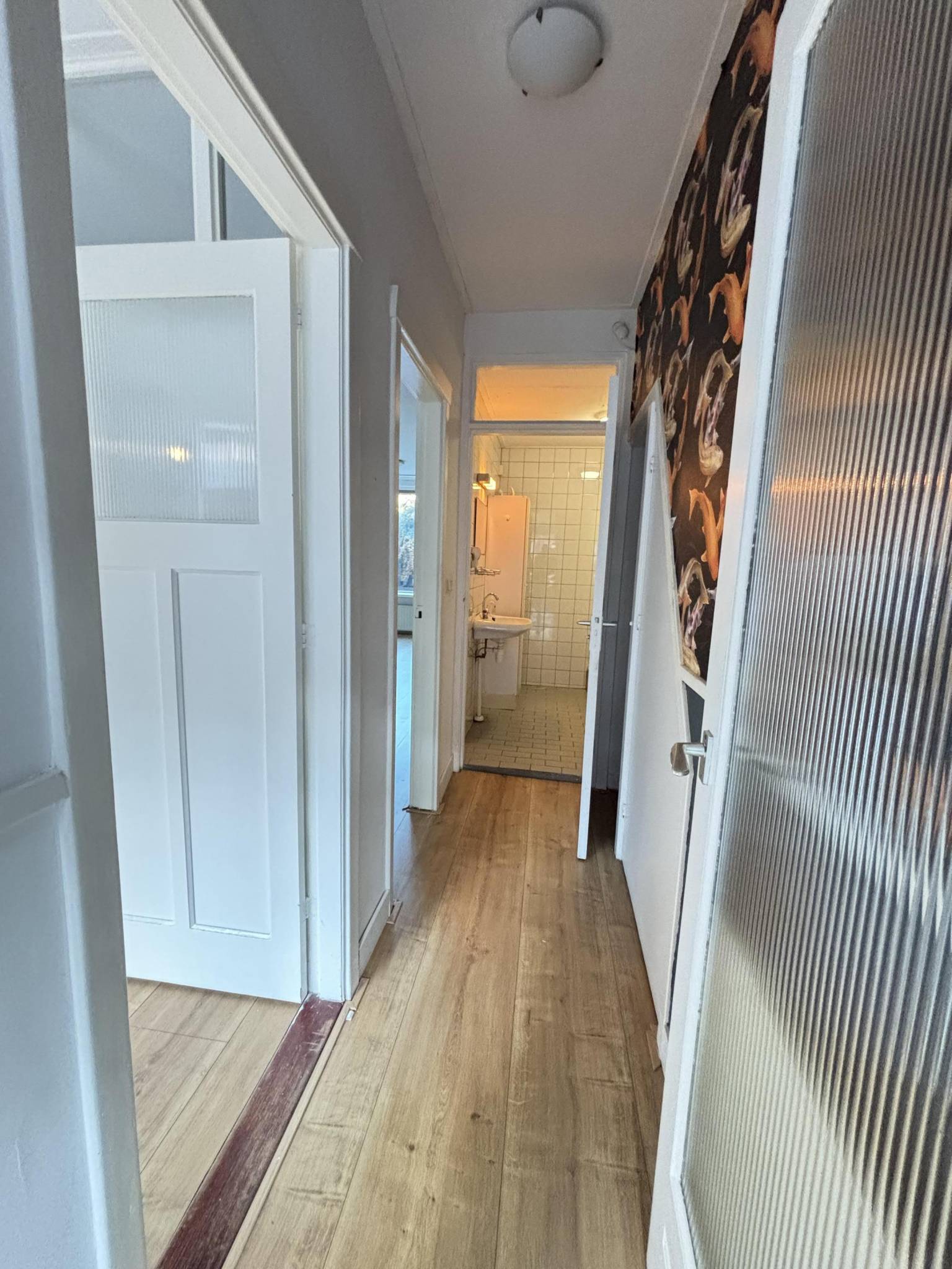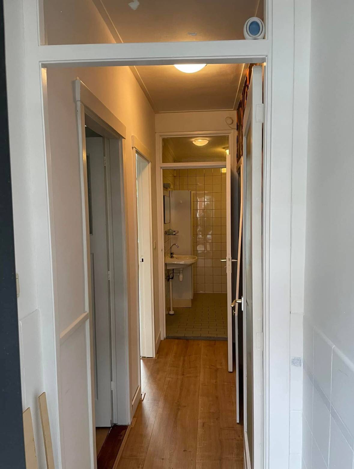 Bij binnenkomst in de tochthal komt u via de tussendeur uit in de gang die toegang geeft tot elke ruimte van de benedenwoning, namelijk: