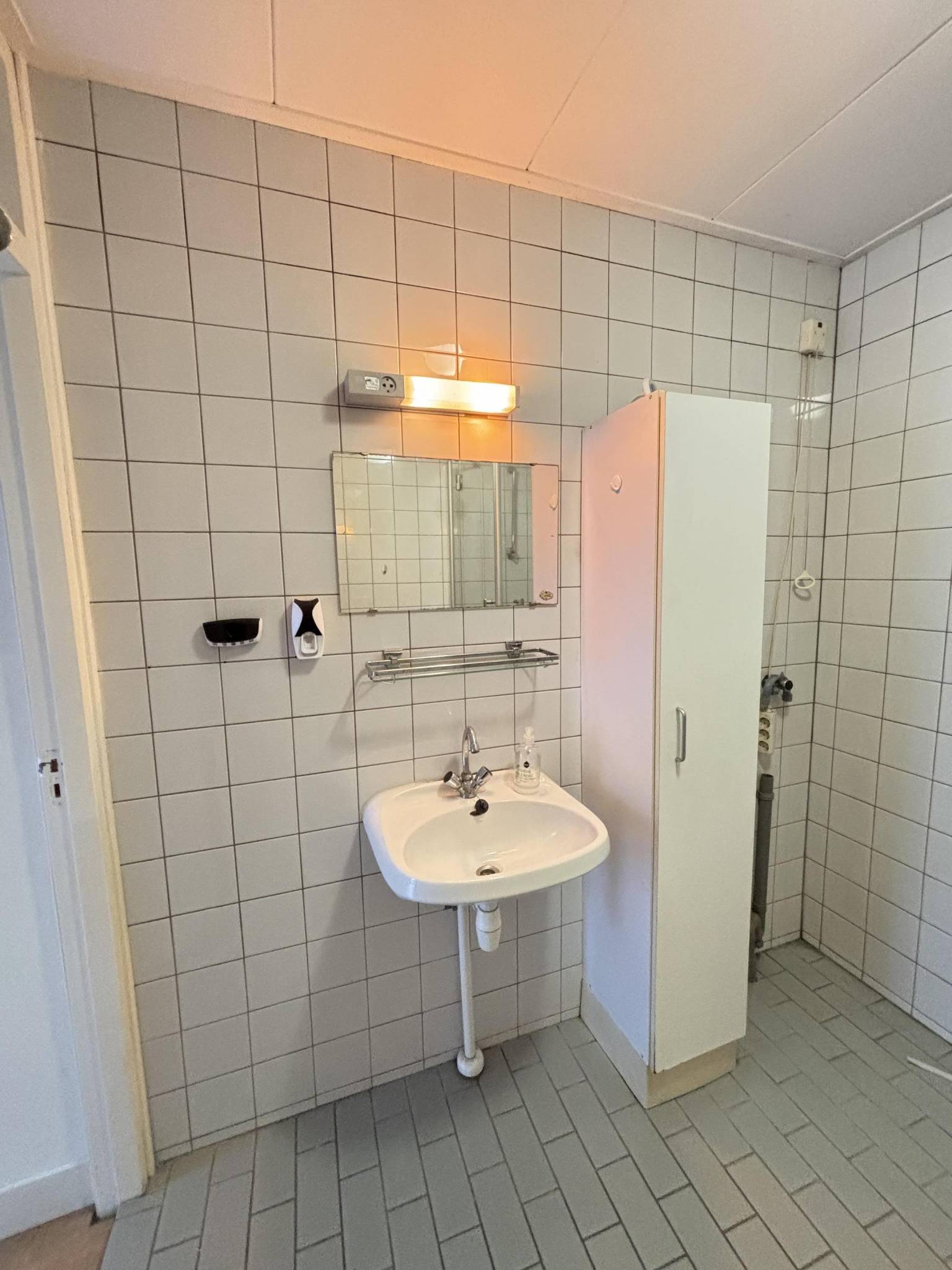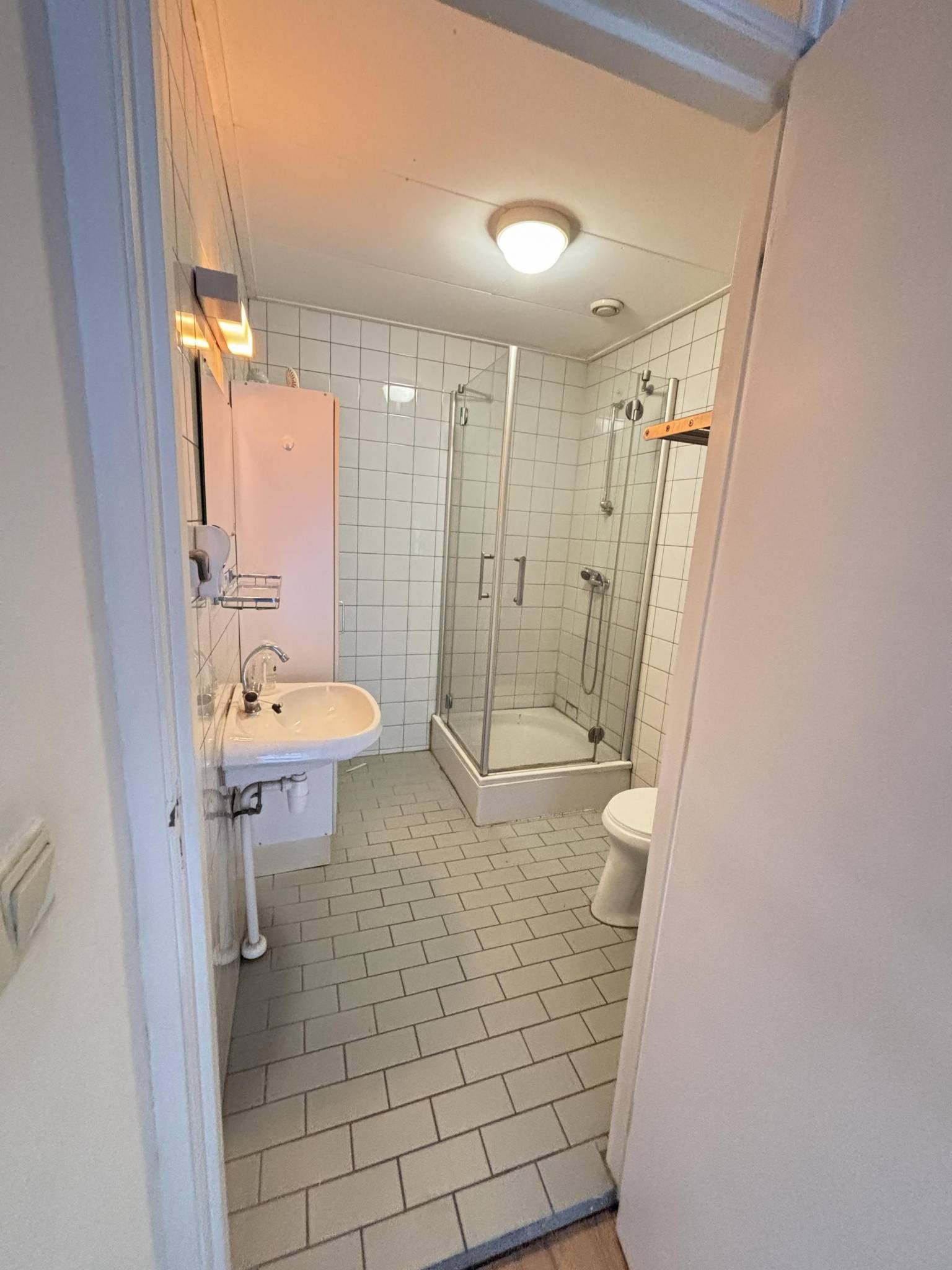 • Betegelde badkamer met douche, wastafel en toiletruimte met staand closet