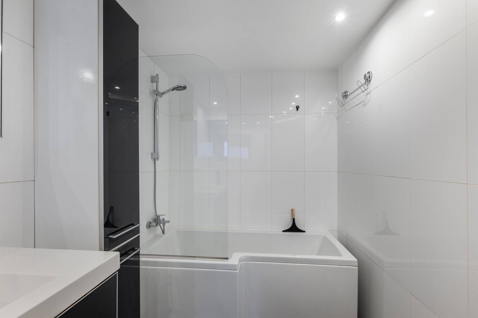 De moderne badkamer is volledig betegeld en uitgerust met een ligbad met douche, een wastafelmeubel, een zwevend toilet en een designradiator. Het plafond is glad afgewerkt en voorzien van inbouw spots.