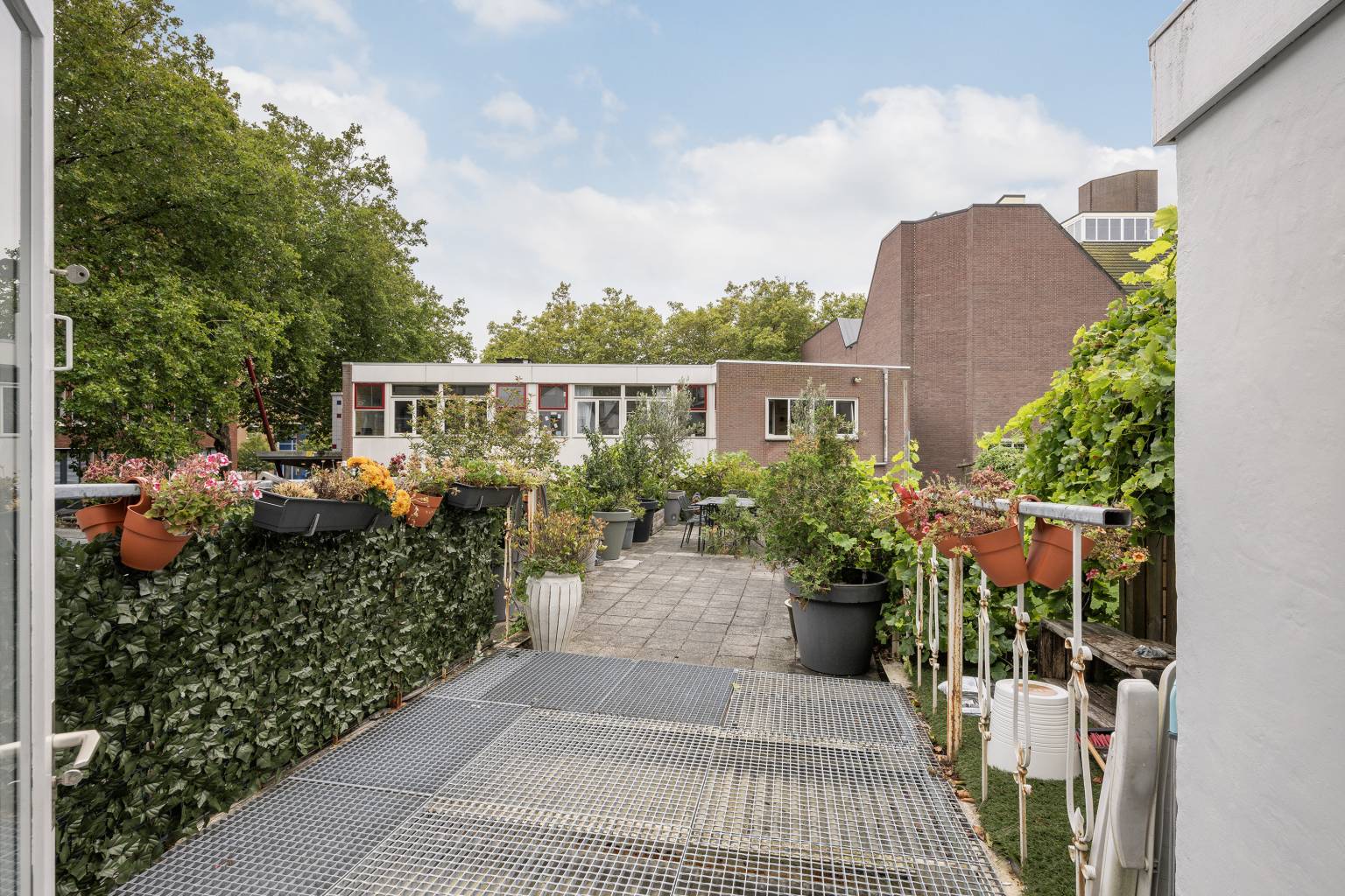 Vanuit de overloop stap je direct het riante dakterras op. Deze onderhoudsvriendelijke buitenruimte is gelegen op het zuiden en biedt veel privacy en zonuren.