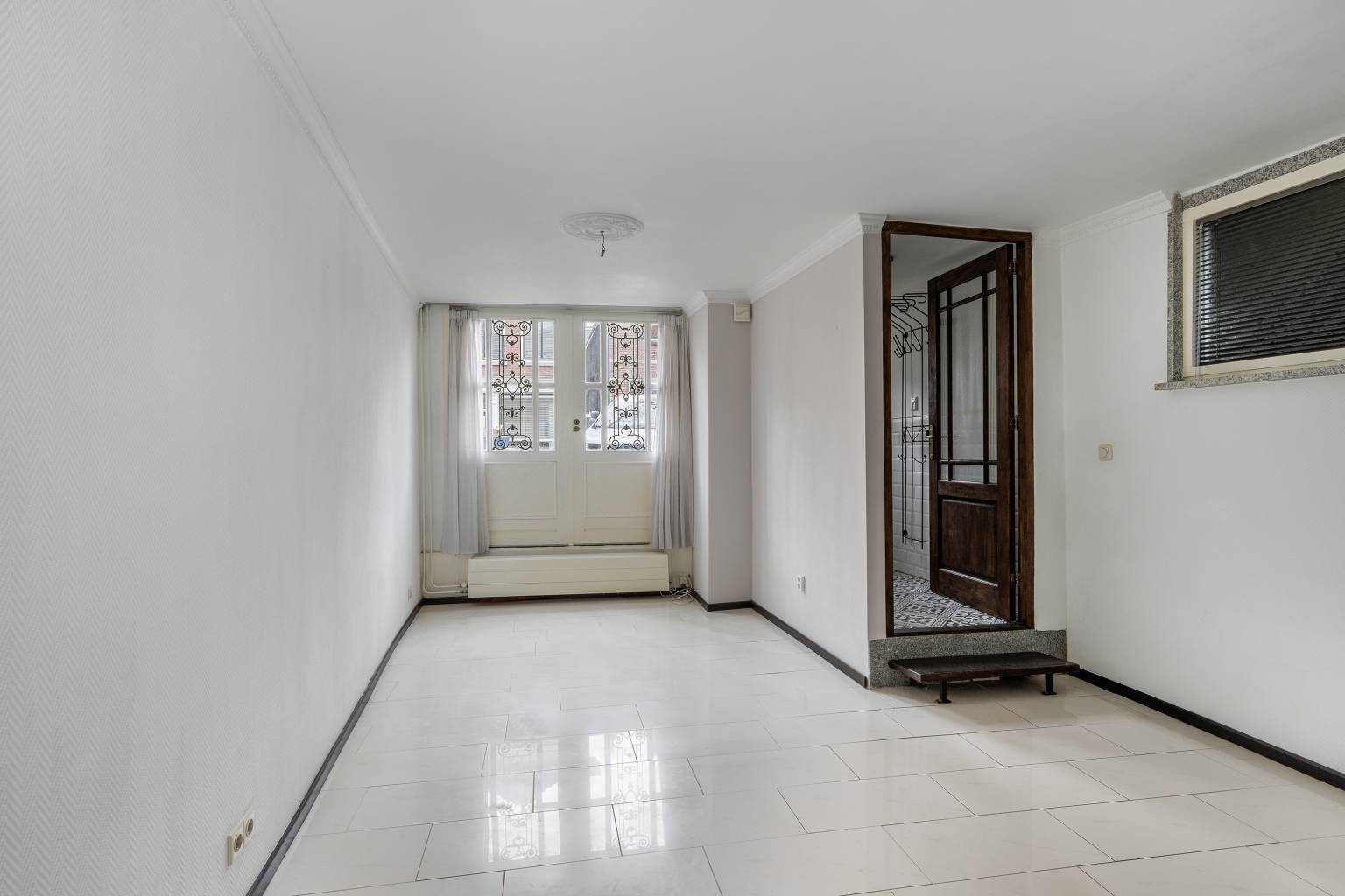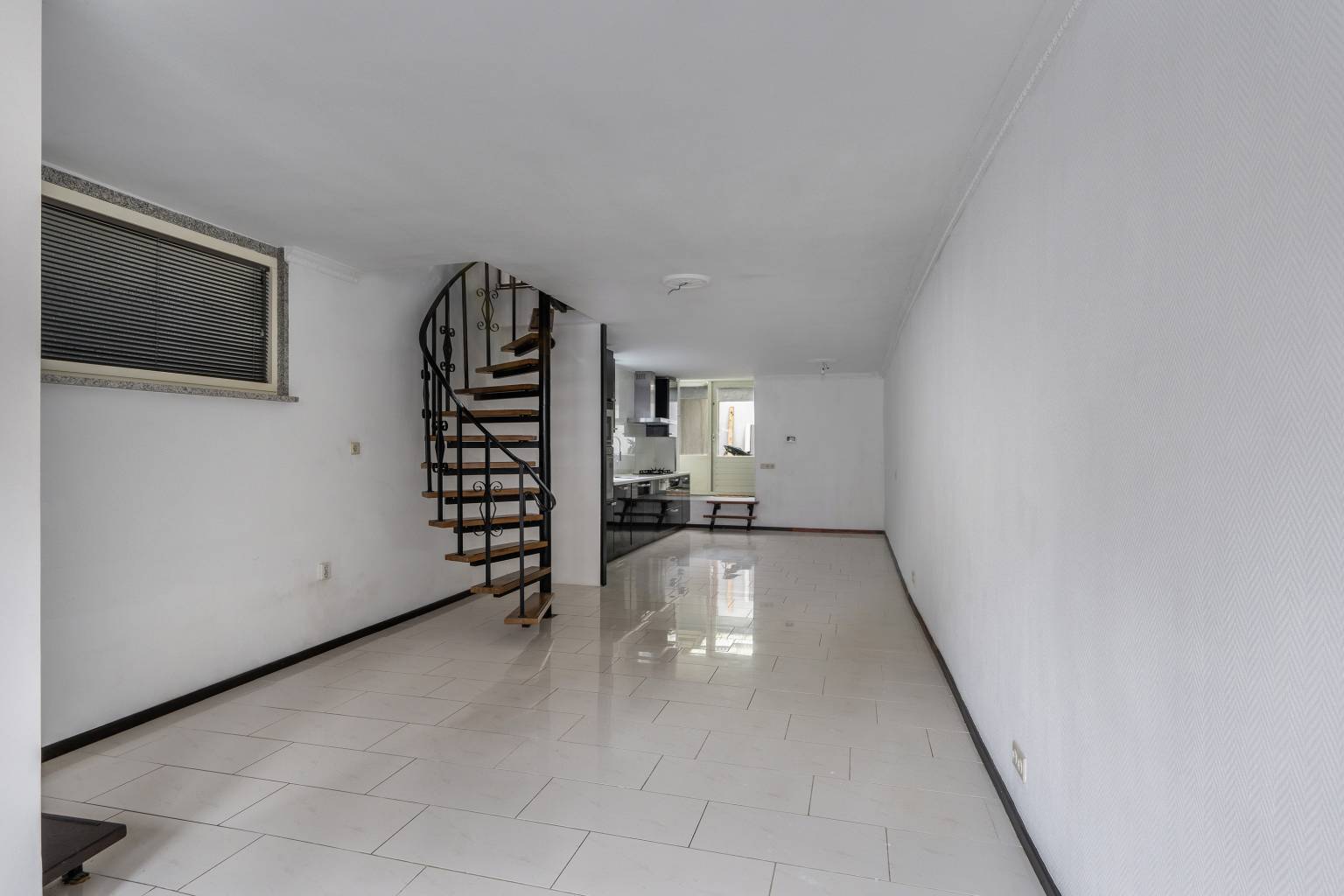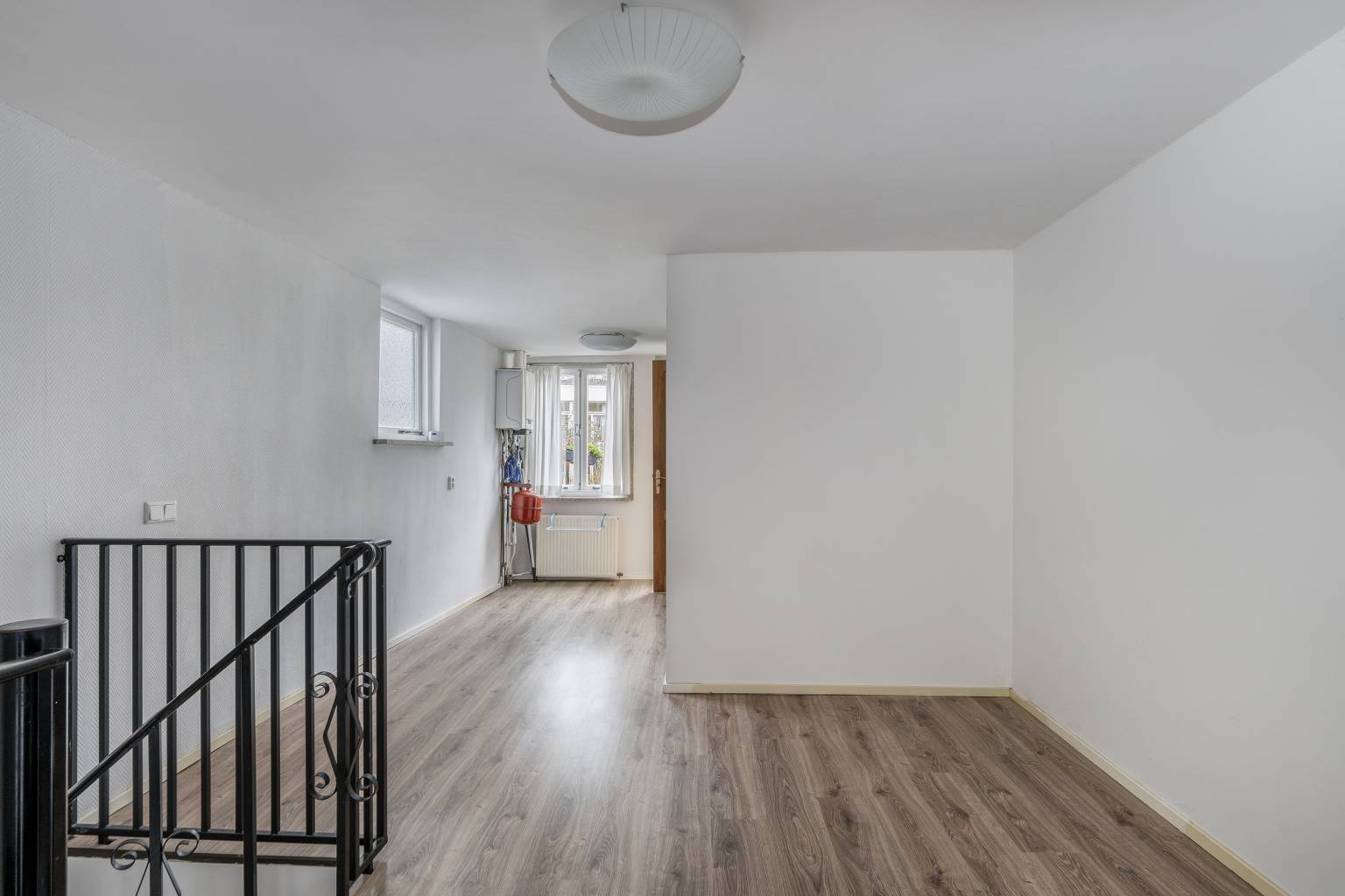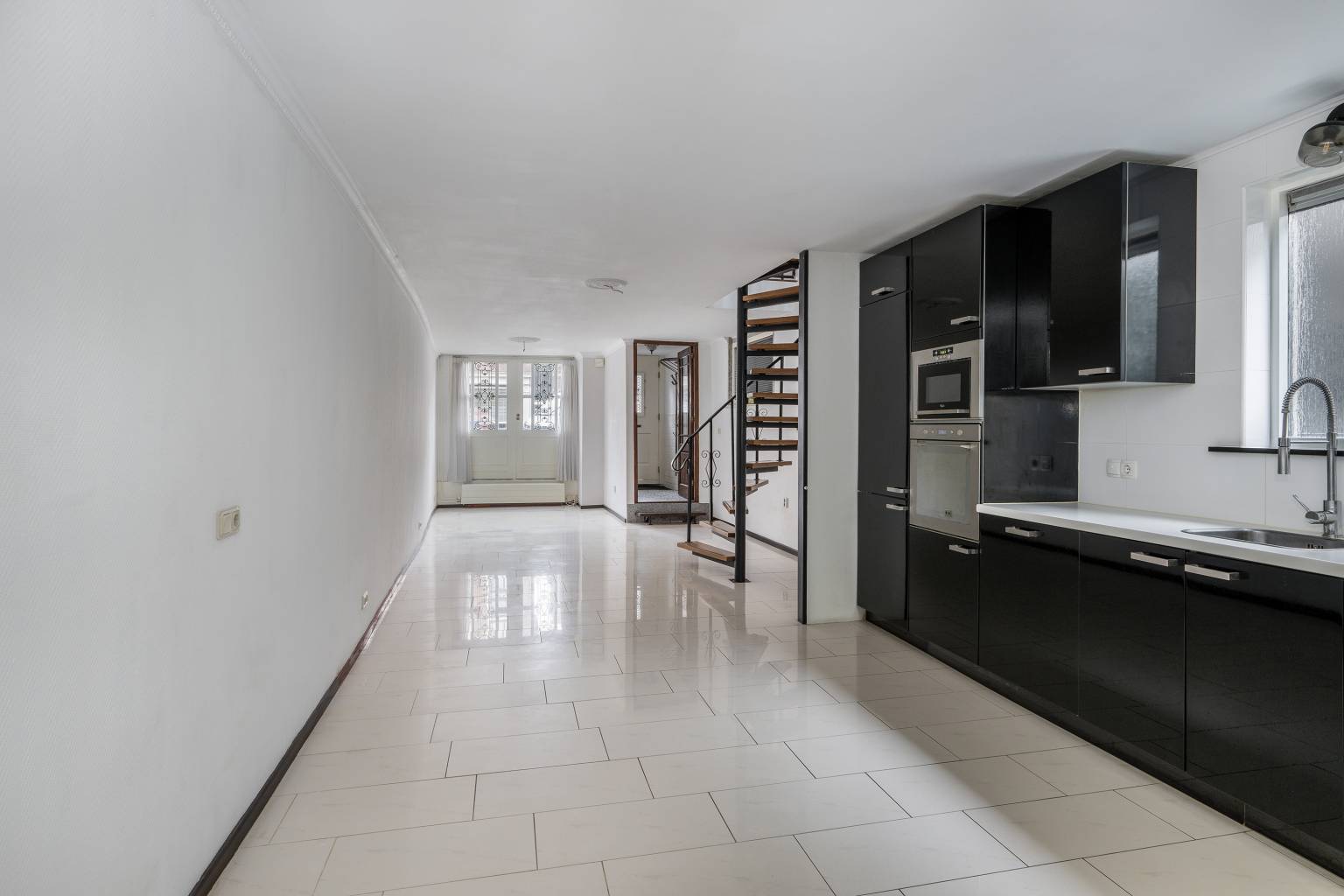 De woonkamer heeft aan de voorzijde een gezellige zithoek met originele openslaande deuren richting de straat. De vloer is voorzien van lichte tegels met vloerverwarming en de wanden zijn afgewerkt met glasvliesbehang. In het midden van de ruimte bevindt zich de spiltrap naar de eerste verdieping.