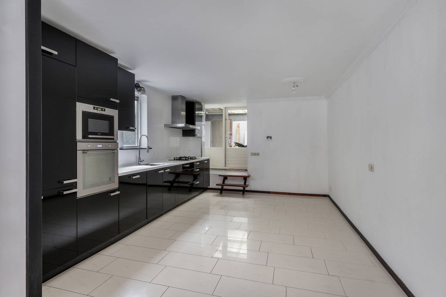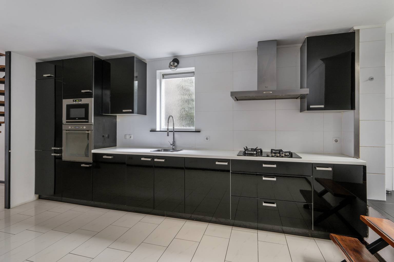 In het verlengde van de woonkamer ligt de open keuken met ruimte voor een eethoek. De keuken is uitgevoerd in een rechte opstelling en voorzien van een koel-vriescombinatie, oven, magnetron, vaatwasser, gaskookplaat en afzuigkap. Bovenkasten en een betegelde achterwand maken het geheel compleet.