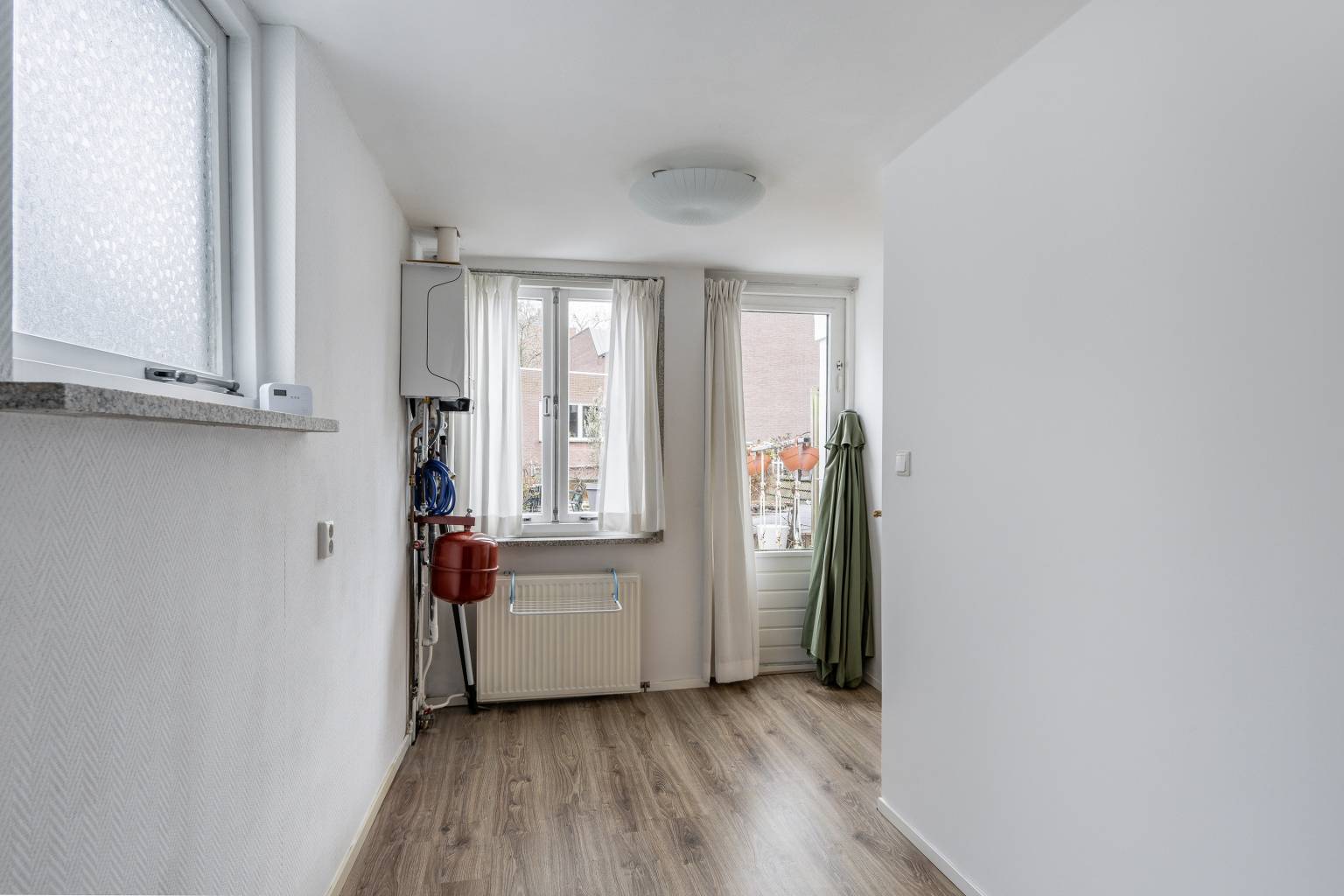 Aan de achterzijde bevindt zich een overkapping die op meerdere manieren te gebruiken is. Deze ruimte is ideaal als overdekte stalling voor fietsen, een scooter of motor, maar kan net zo goed worden ingericht als een beschut terras. Aansluitend ligt de royale berging met toegang vanaf het achterpad. Deze ruimte leent zich uitstekend als hobbyruimte, werkplaats of atelier en beschikt over aansluitingen voor wasmachine en droger.
