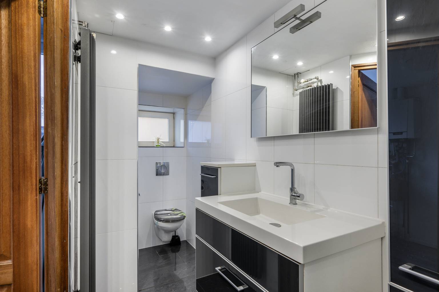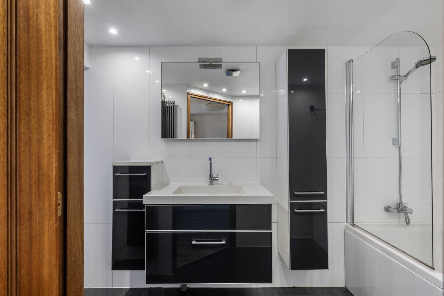 De moderne badkamer is ruim opgezet en voorzien van een ligbad met douche, wastafelmeubel, zwevend toilet en designradiator. Het plafond is glad afgewerkt en voorzien van inbouwspots.