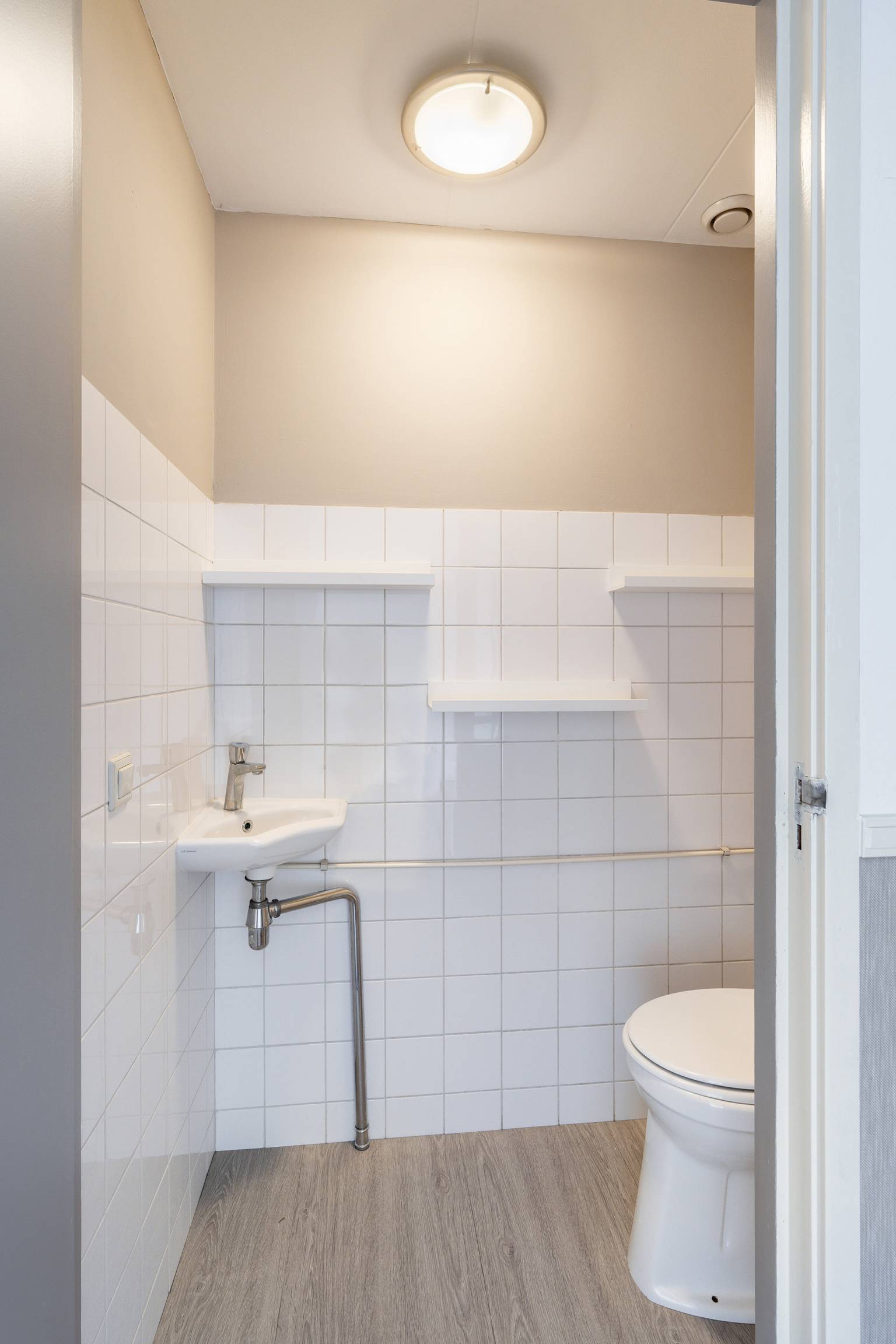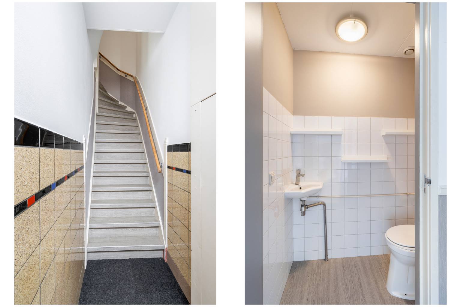 Na de trapopgang is de overloop bereikbaar. Deze is voorzien van laminaat en behang lambrisering. Vanaf de overloop is er een trap naar de 2e verdieping, die eveneens is voorzien van overzettreden, en zijn de woonkamer en het toilet toegankelijk. Het gedeeltelijk betegelde toilet heeft een staande toiletpot, een fonteintje en een afzuigpunt.