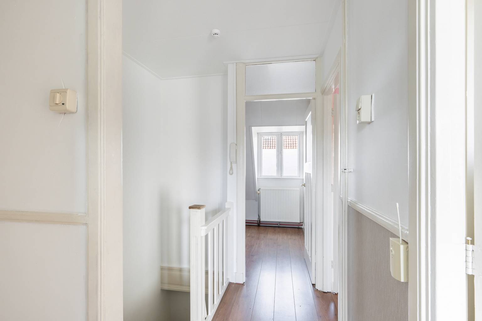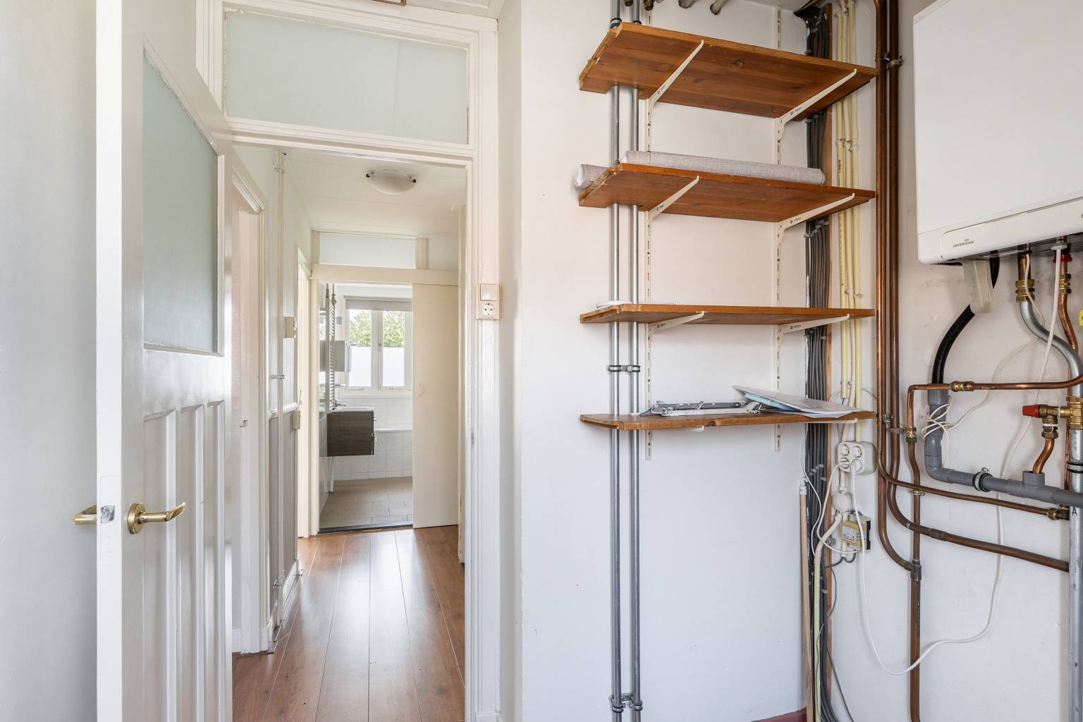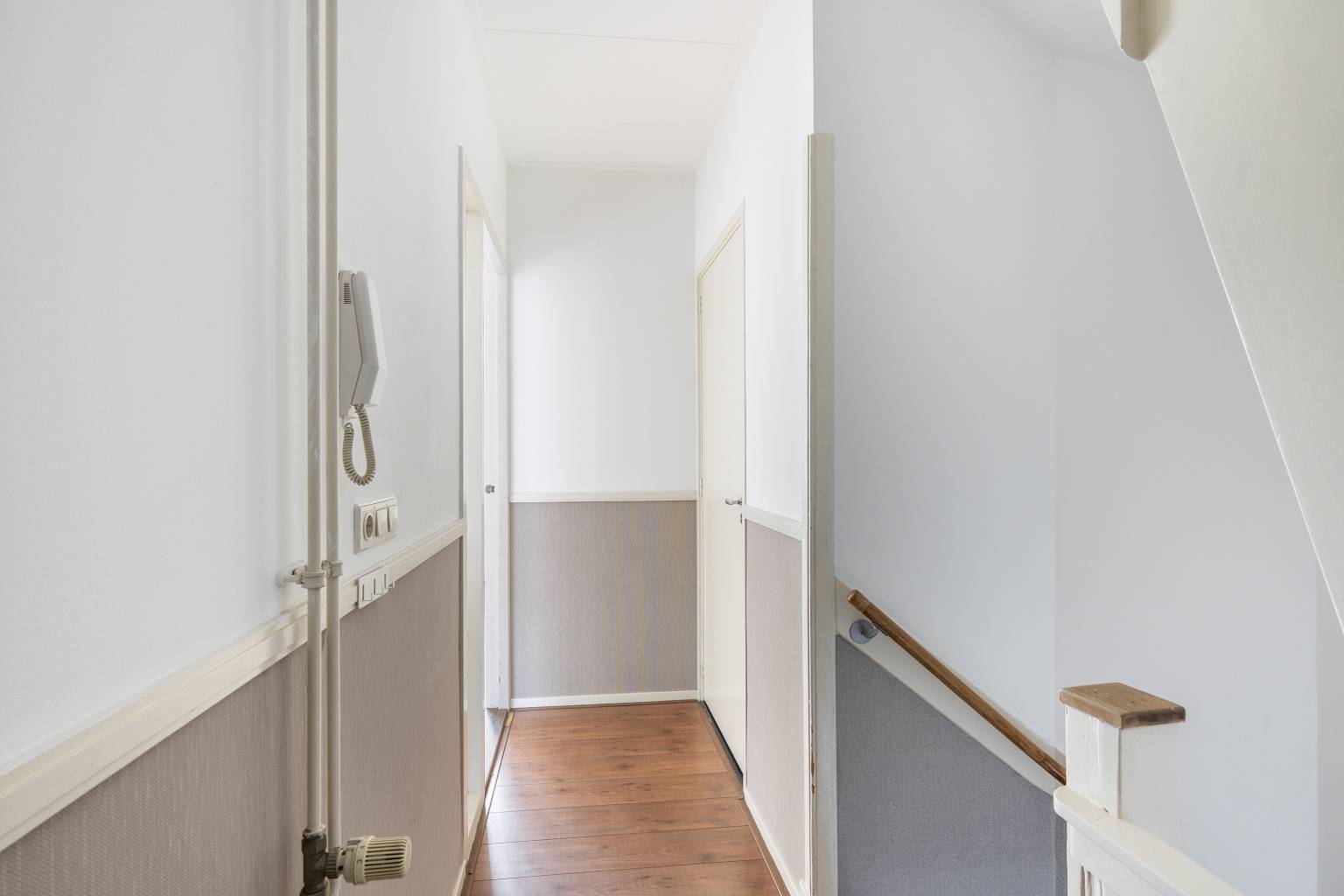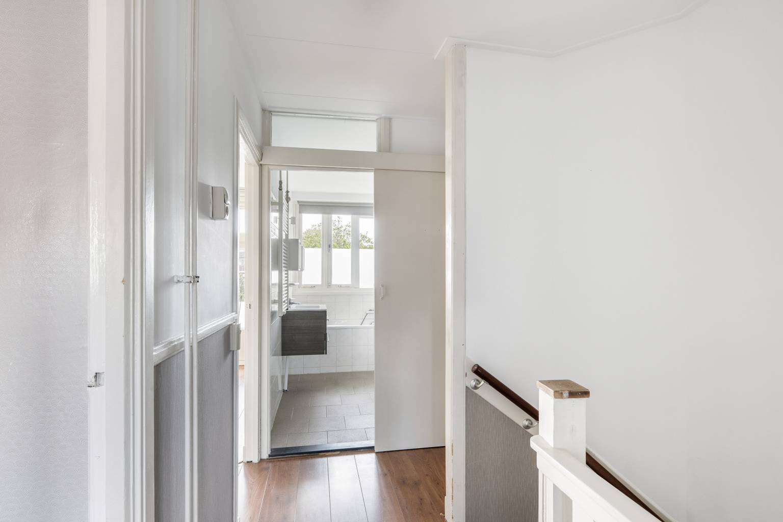 De overloop is eveneens voorzien van laminaat dat is doorgetrokken over de gehele verdieping en ook hier is behang lambrisering aanwezig. Om de hoek naast het trapgat bevindt zich de aansluiting voor de wasmachine en vanaf de overloop is er toegang tot nog twee slaapkamers, de badkamer en een werk-/hobbykamer met daarin de opstelling van de Cv-ketel en het luik naar de vliering.