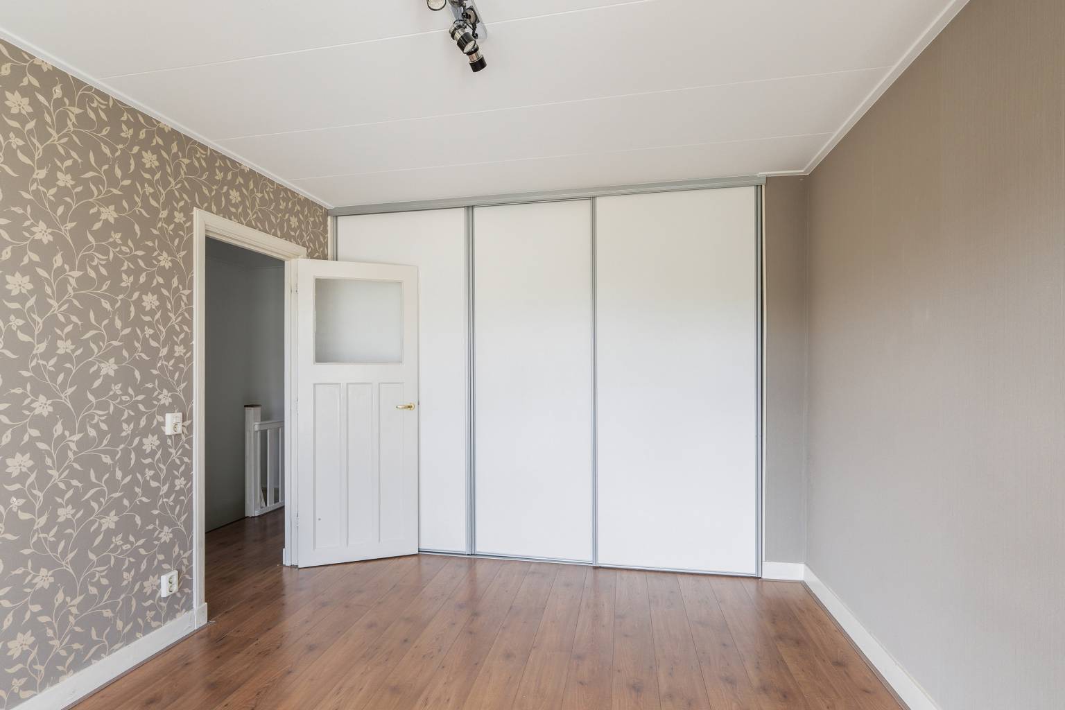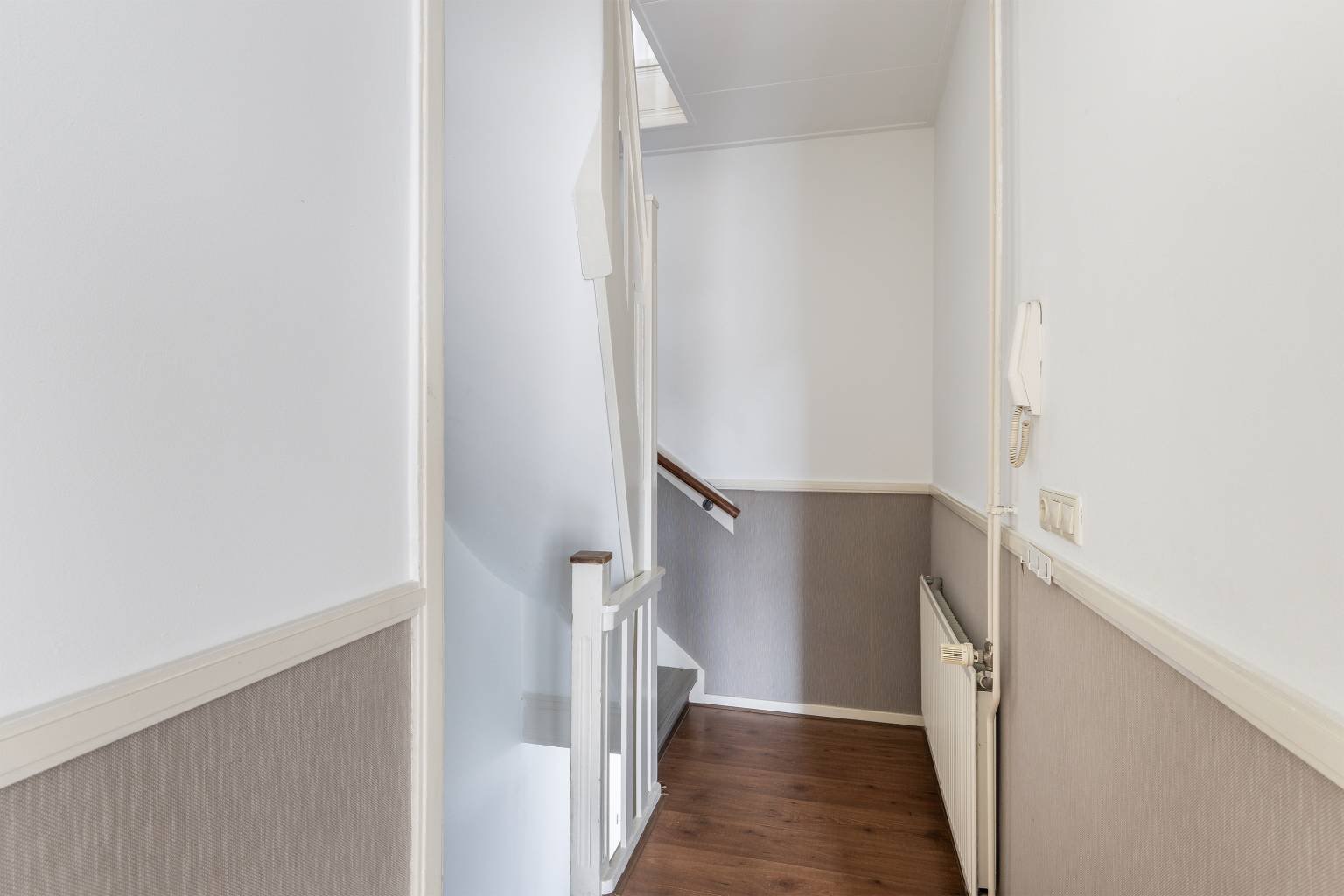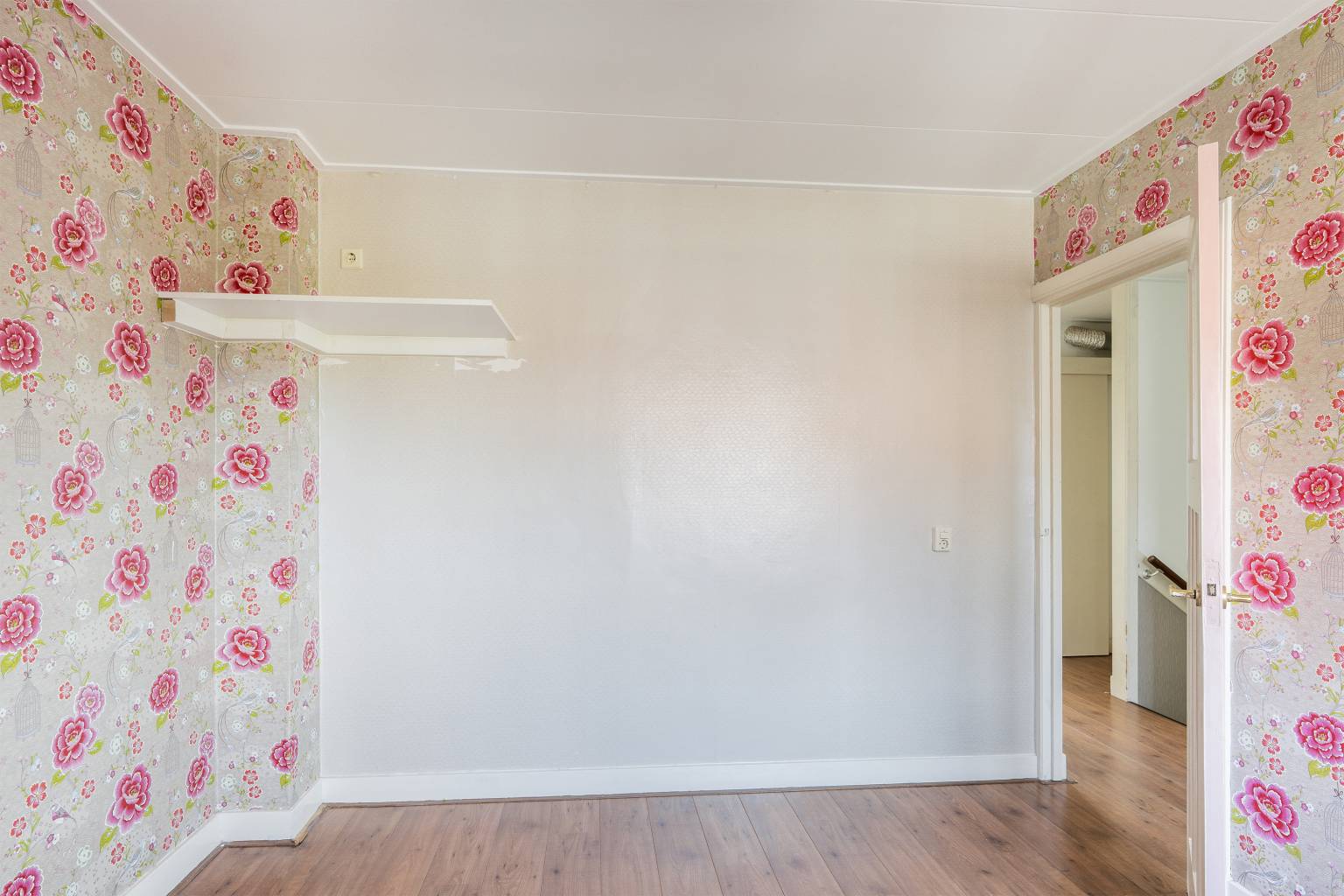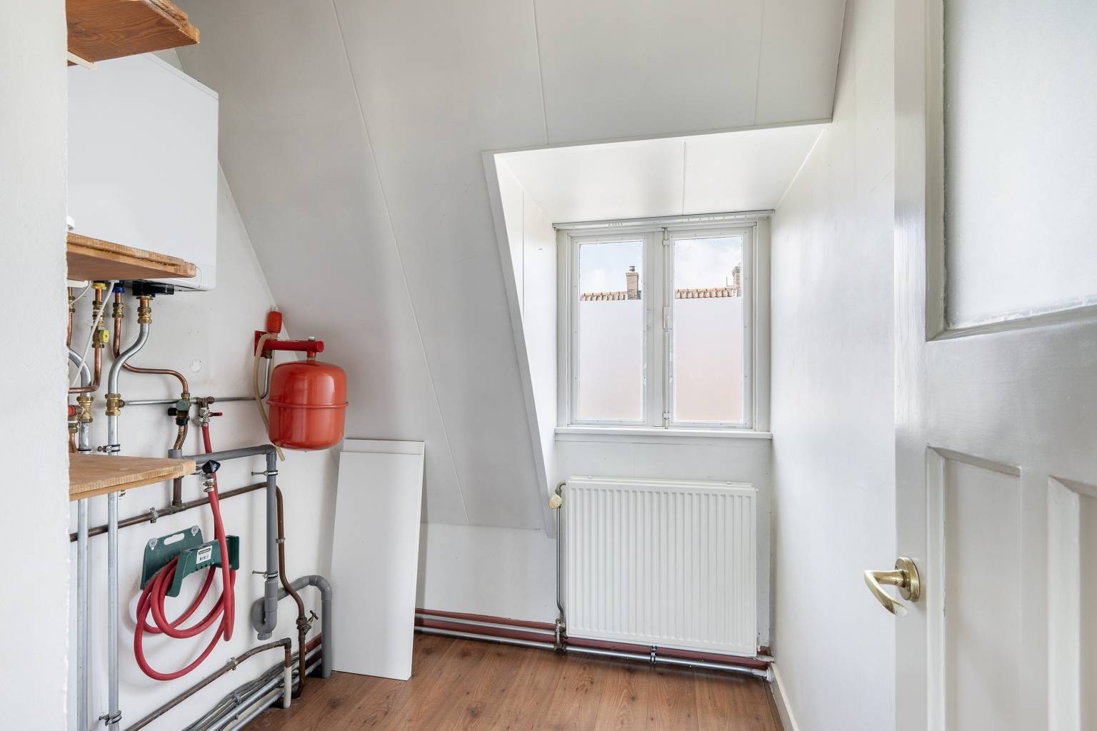 De overloop is eveneens voorzien van laminaat dat is doorgetrokken over de gehele verdieping en ook hier is behang lambrisering aanwezig. Om de hoek naast het trapgat bevindt zich de aansluiting voor de wasmachine en vanaf de overloop is er toegang tot nog twee slaapkamers, de badkamer en een werk-/hobbykamer met daarin de opstelling van de Cv-ketel en het luik naar de vliering.
