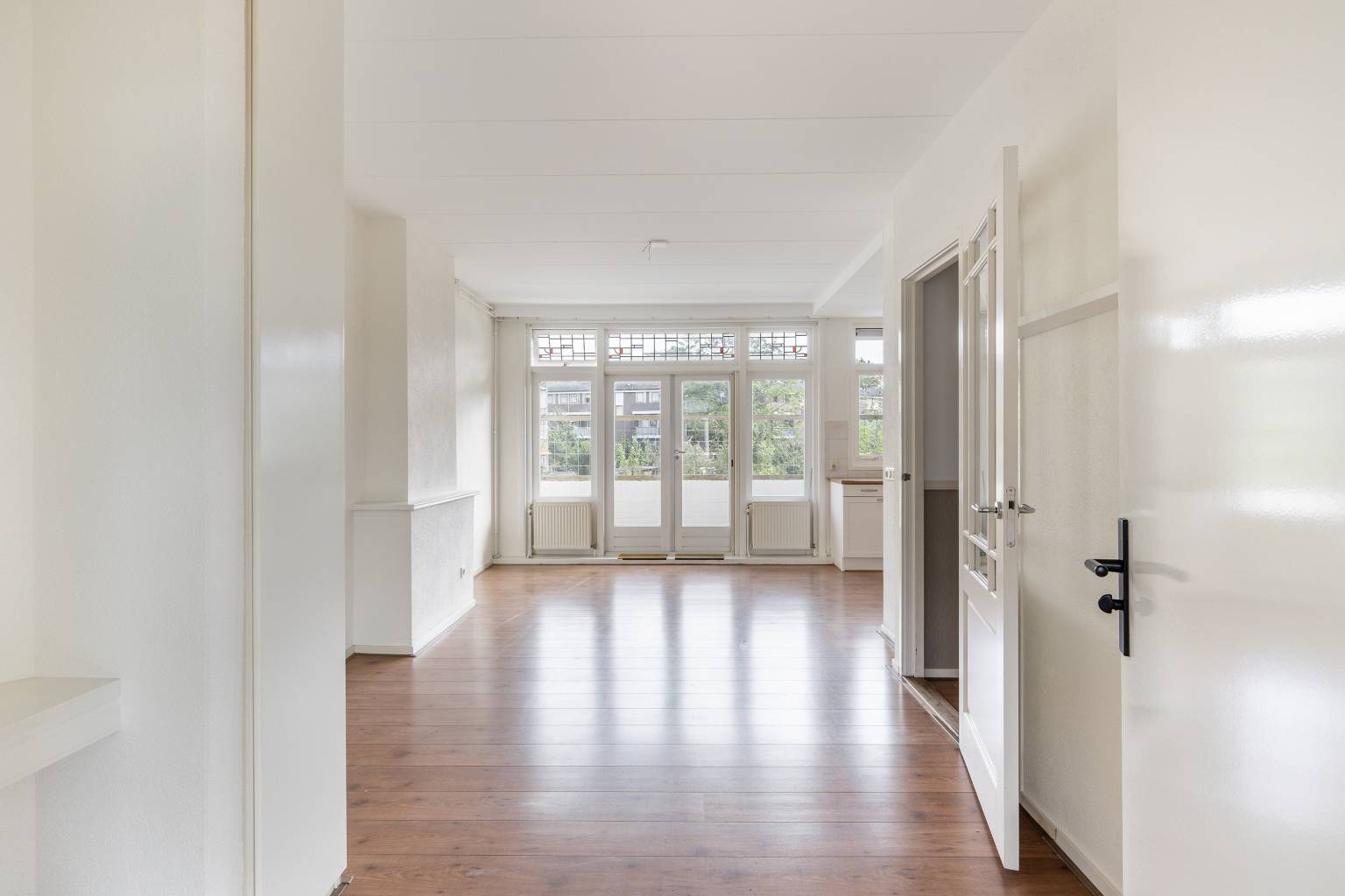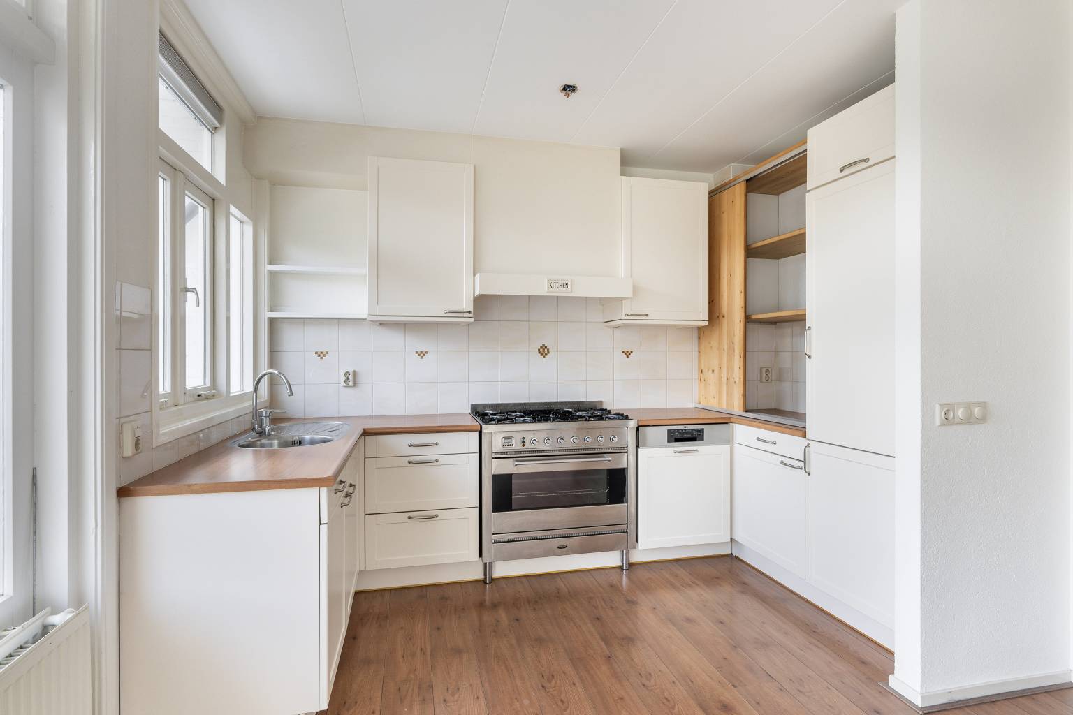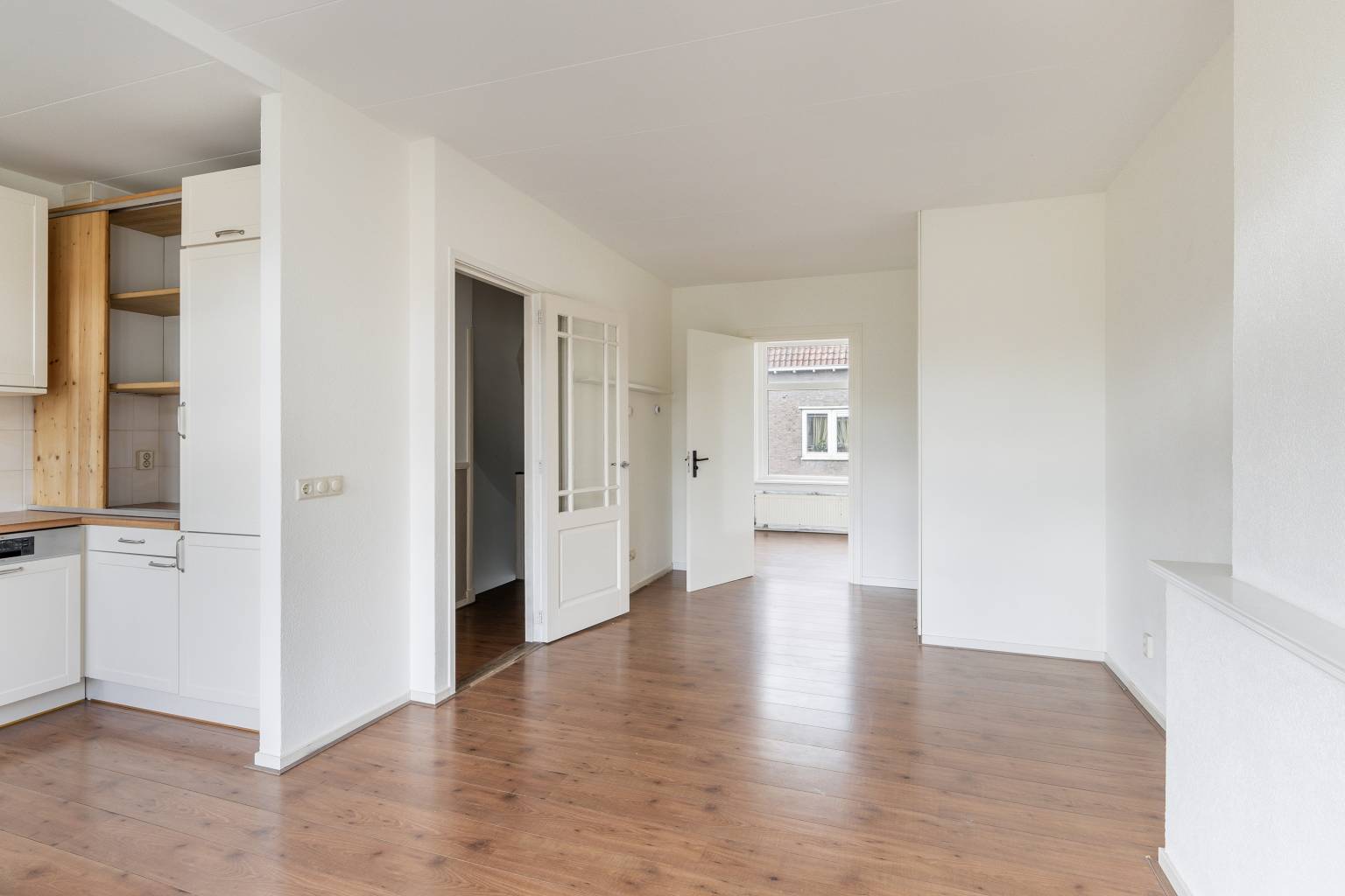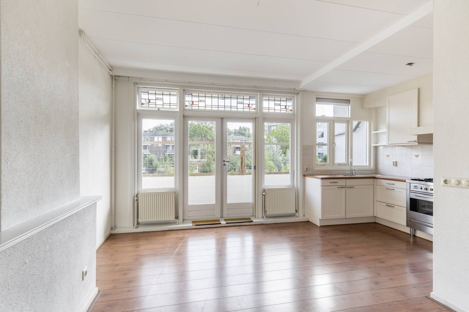 De woonkamer is gesitueerd aan de achterzijde en is ruim van afmeting. De originele schouw is nog aanwezig, maar dichtgezet en er is een vaste kast aanwezig. Er is een deur naar de aangrenzende slaapkamer en de openslaande deuren, met glas-in-lood bovenlichting, geven toegang tot het balkon. Op de vloer ligt laminaat en de wanden zijn glad afgewerkt. In de breedte van de woonkamer is de open keuken in een U-vorm geplaatst. Deze is uitgevoerd in een lichte teint met een houtlook aanrechtblad. De bovenkasten zorgen voor extra opbergmogelijkheden en de achterwand is handig betegeld. Temidden van het aanrechtblad bevindt zich een groot gasfornuis met een oven en daarboven is er een afzuigkap geplaatst. Daarnaast is er nog een vaatwasser, een koelkast en een vriezer aanwezig.