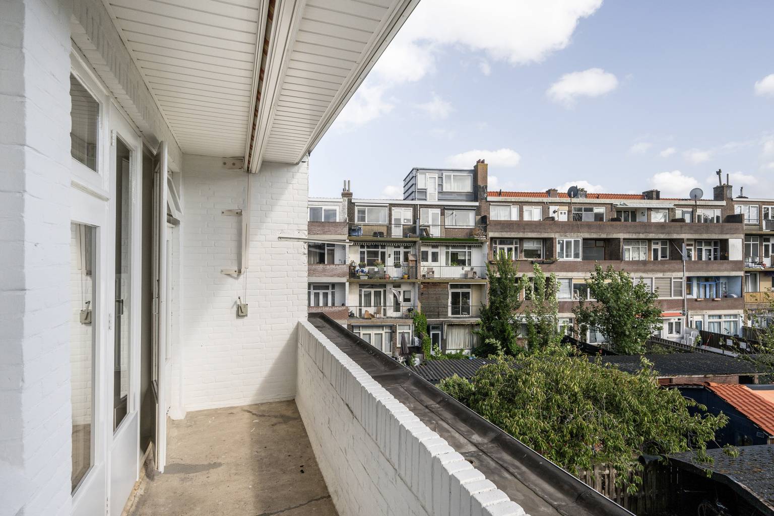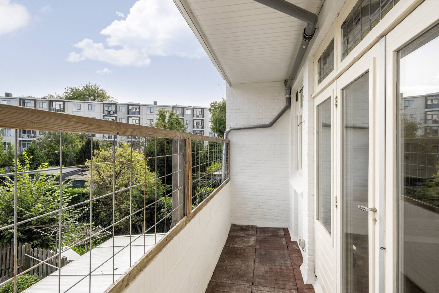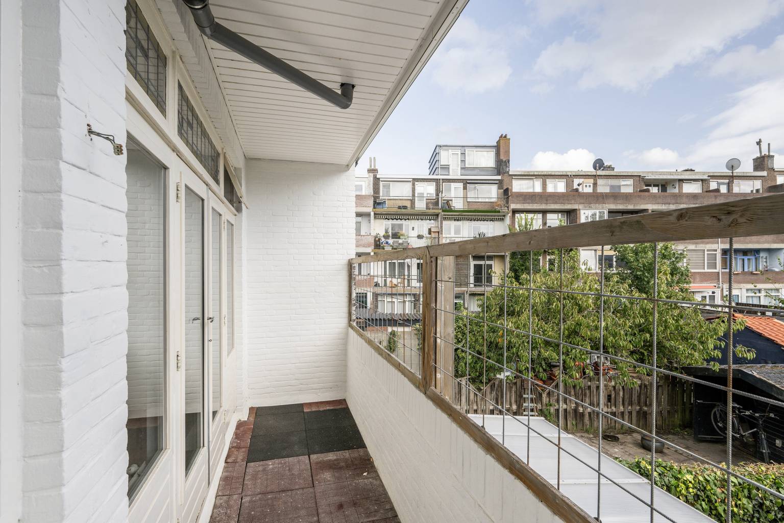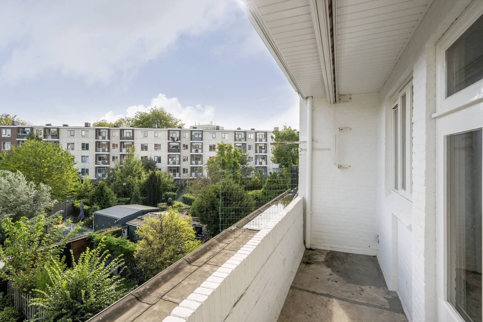 Het balkon is gelegen over de gehele breedte van de woning en is fijn overdekt. De stenen balustrade is bovenop voorzien van een gaaspanelen en de vloer is bedekt met rubberen tegels.