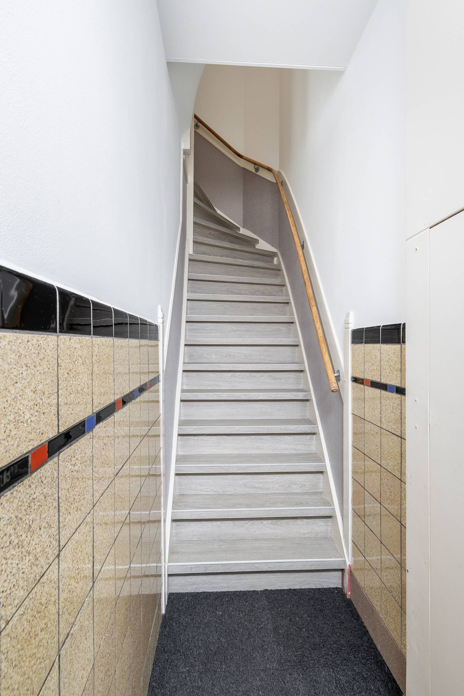 Na de voordeur is er toegang tot de entreehal die is voorzien van vloerbedekking en authentieke tegeltjes, die zich halfhoog tegen de wanden bevinden. De trap naar de verdieping is voorzien van overzettreden en naast de voordeur bevindt zich de meterkast.