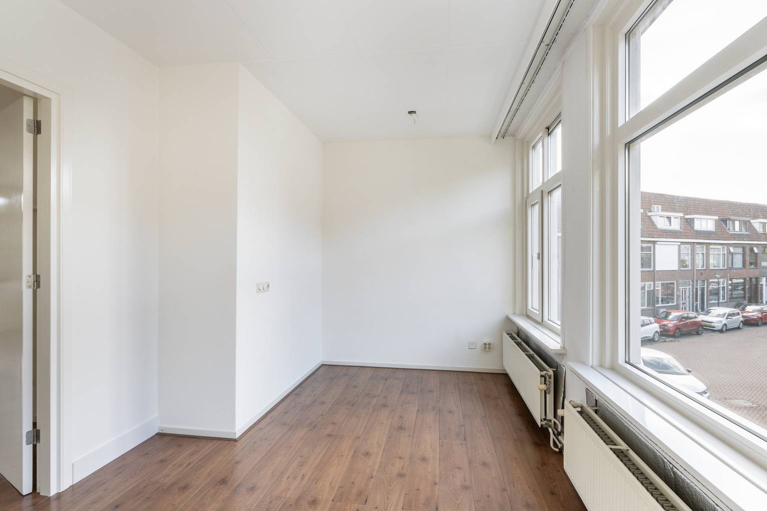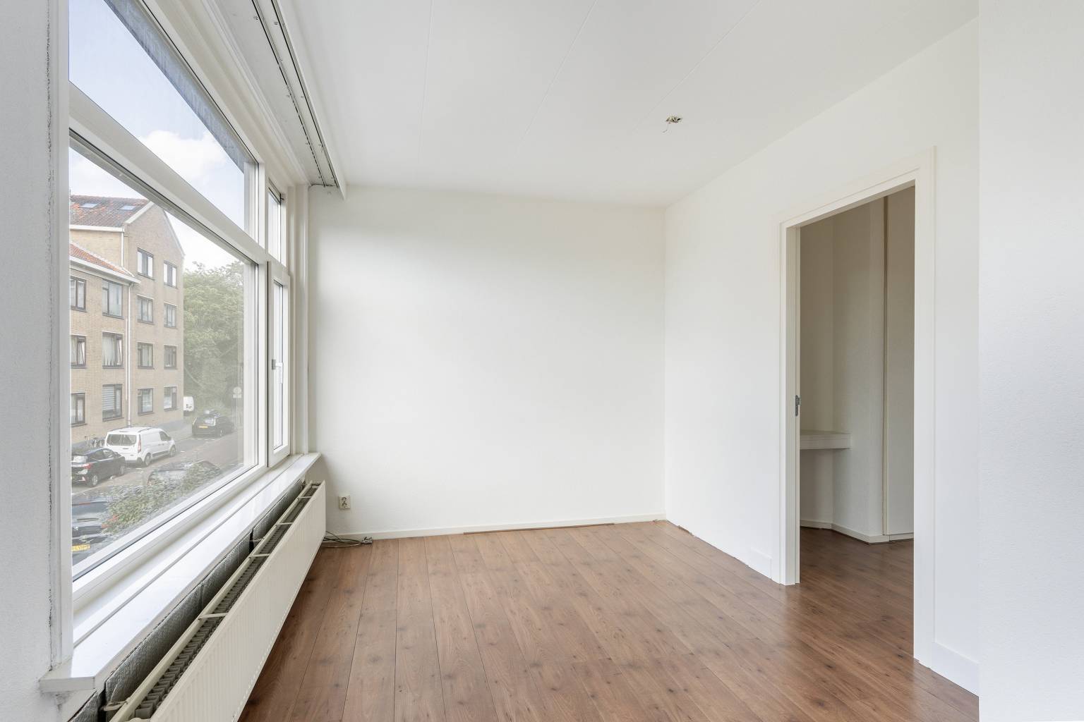De eerste slaapkamer is gelegen aan de voorzijde en heeft een mooi uitzicht over de straat. De kozijnen zijn uitgevoerd in kunststof met dubbel glas en desgewenst is deze kamer gemakkelijk op te splitsen in een slaapkamer en werk-/hobbykamer of een hoofdslaapkamer met een inloopkast. De wanden zijn glas afgewerkt en de vloer is doorlopend vanuit de woonkamer.