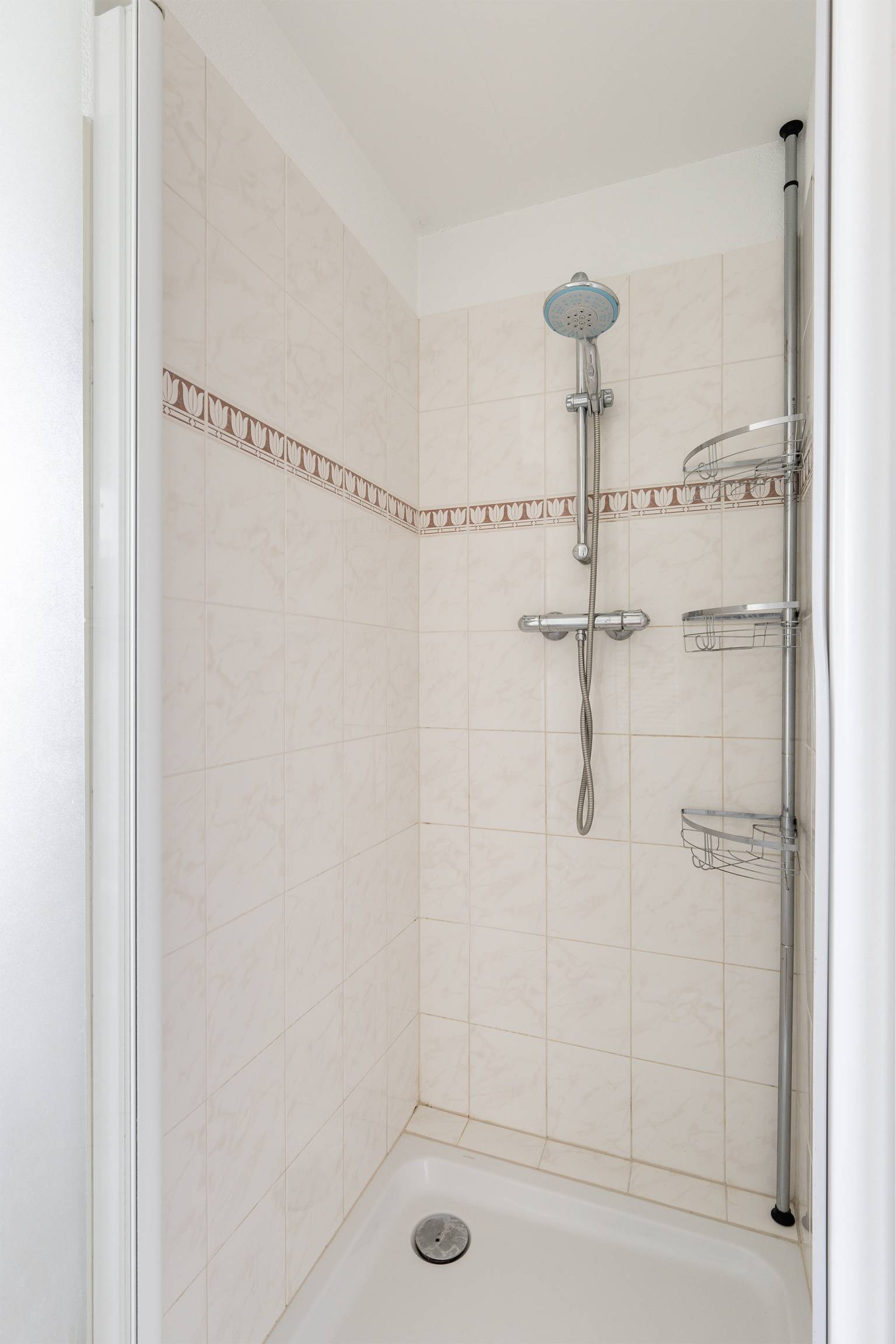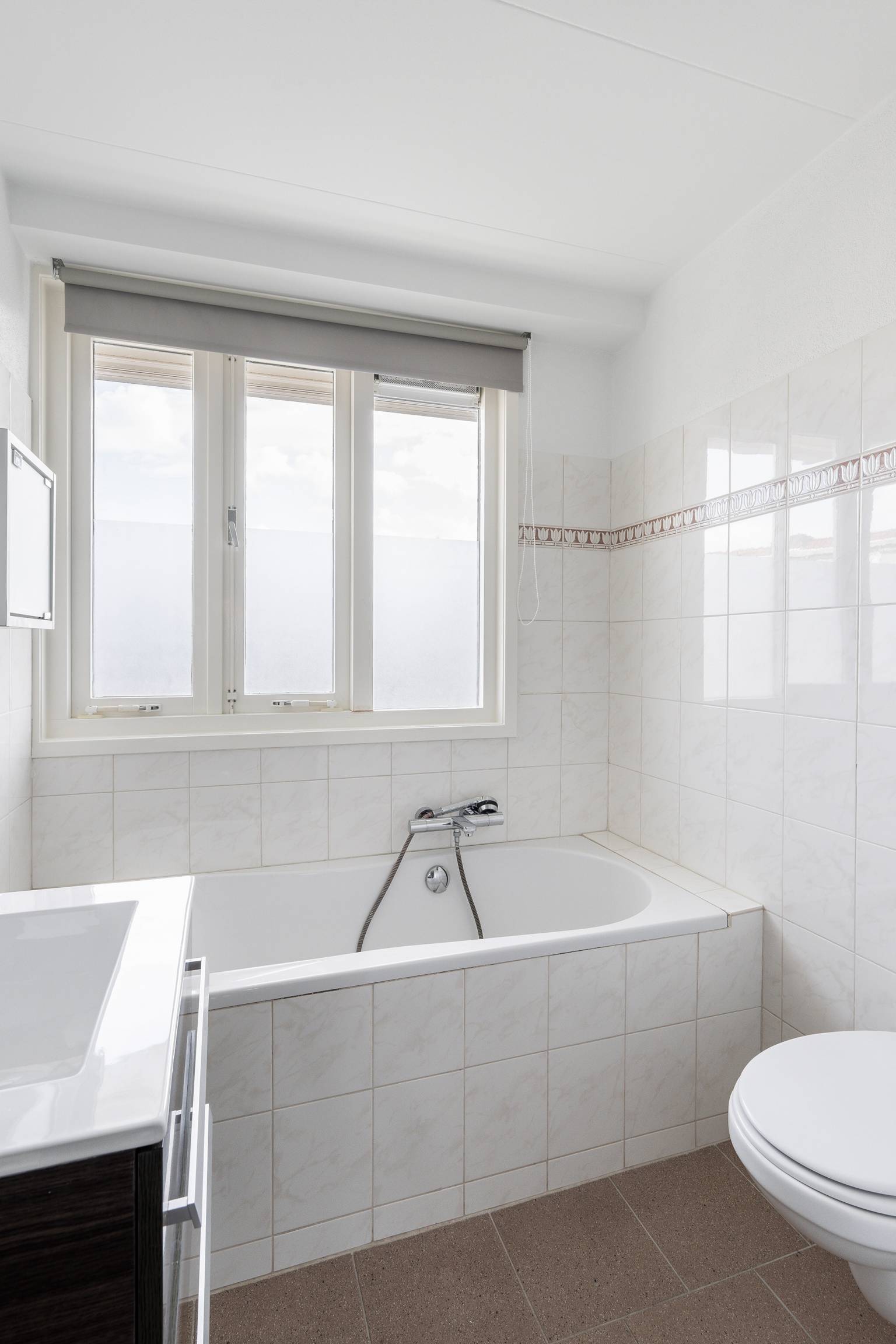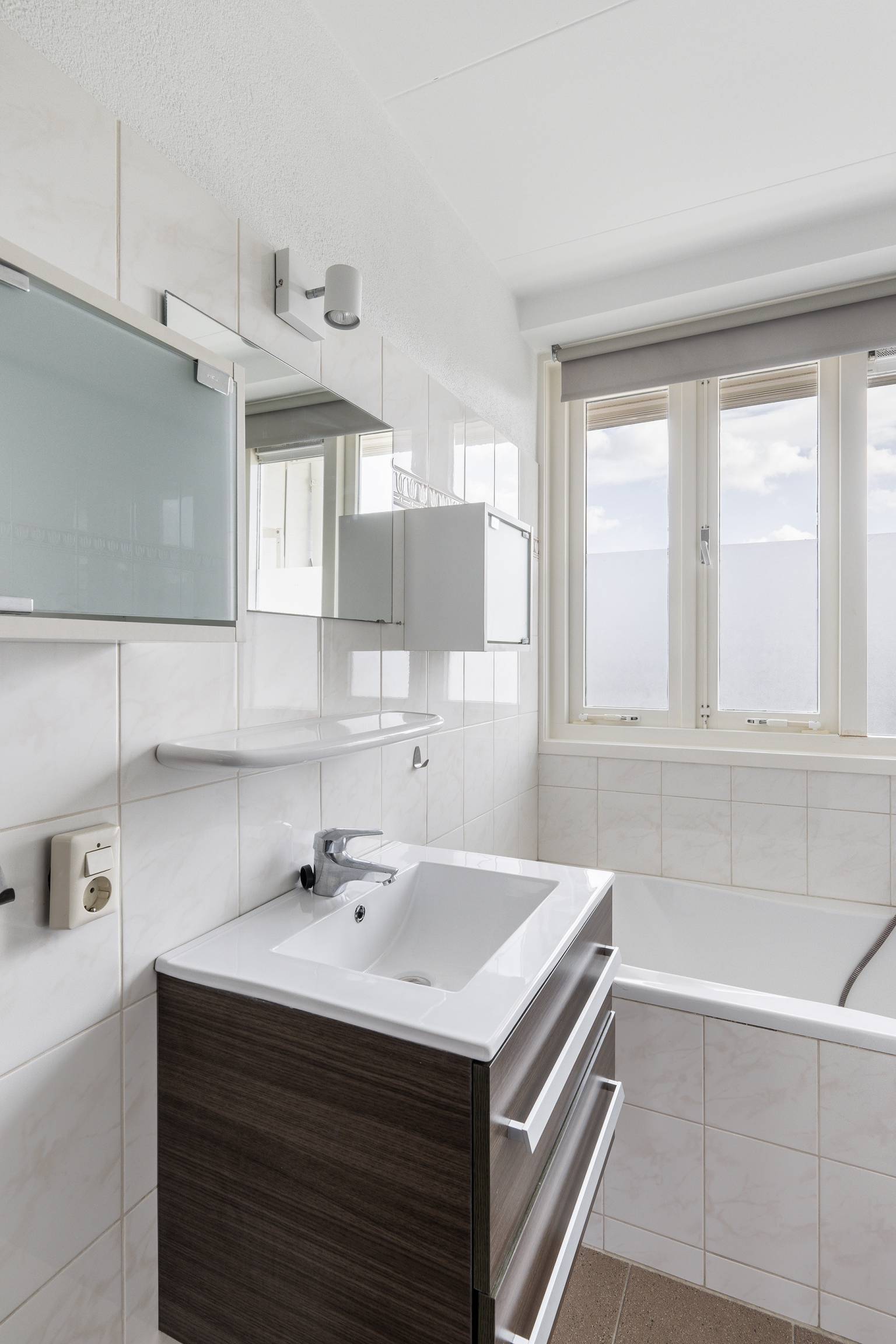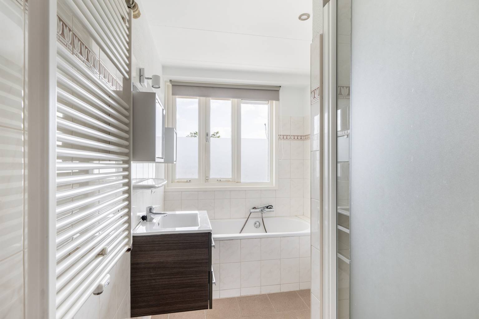 De badkamer is grotendeels betegeld en compleet uitgerust met een douchecabine, een wastafelmeubel, een ligbad met een handdouche, een toilet en een handdoeken radiator. Er zijn te openen ramen en in het plafond bevindt zich een inbouw spots.