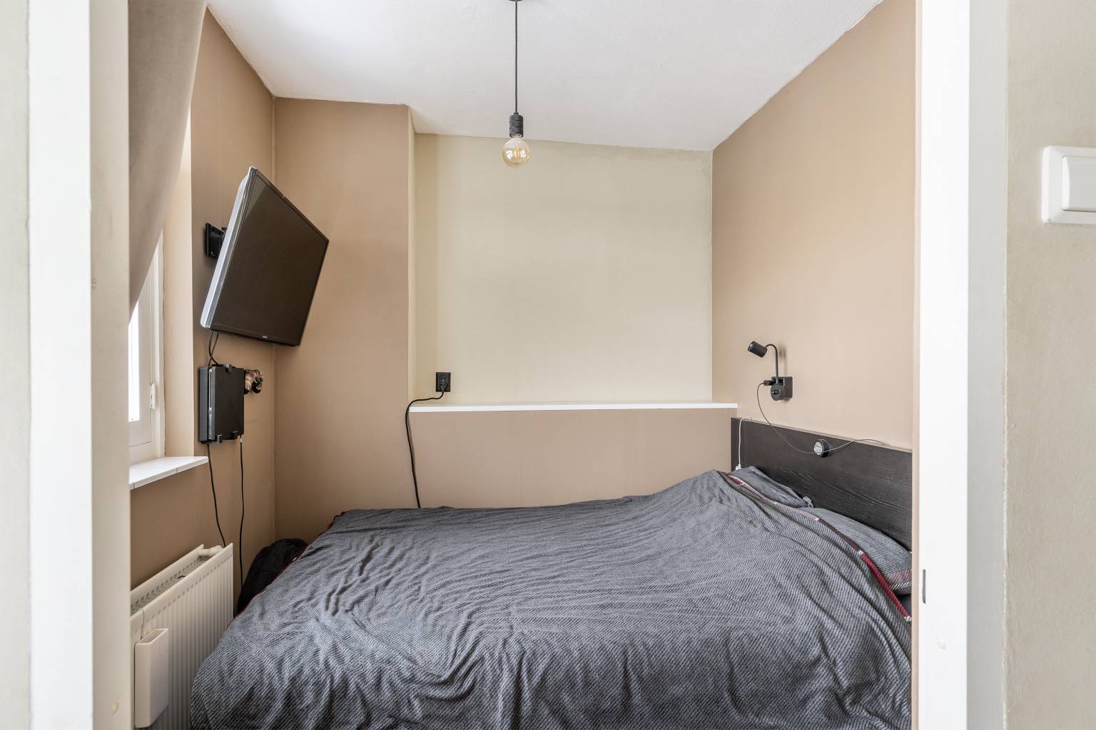 De slaapkamer is gelegen direct naast de hal en heeft ramen met zicht op de galerij.