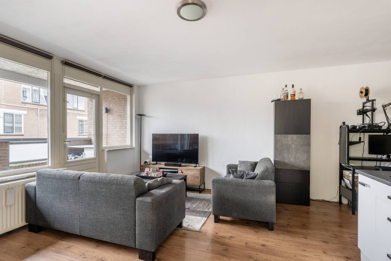 De woonkamer heeft dankzij de grote raampartij met een deur naar het balkon en het extra zijraam veel lichtinval. De open keuken is voorzien van een recht keukenblok met een vaatwasser, een koelkast, een magnetron, een 4-pits gaskookplaat en een in een bovenkast verwerkte afzuigkap. De achterwand is betegeld en de aanwezige bovenkasten zorgen voor extra opbergmogelijkheden.