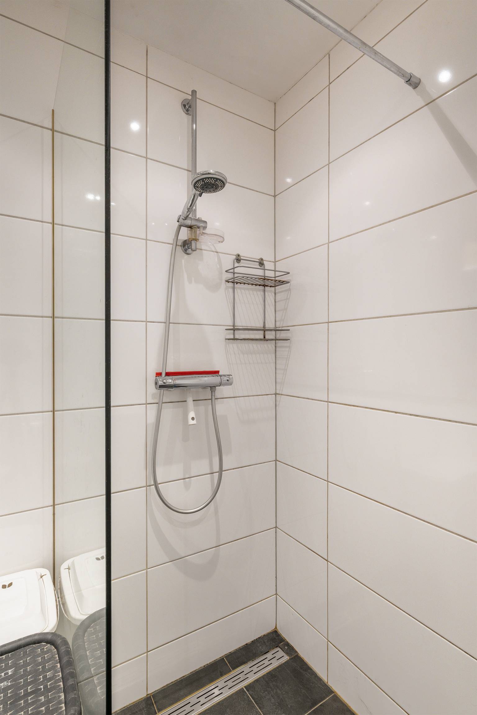 De badkamer is volledig betegeld en uitgerust met een wastafelmeubel met daarboven een spiegelkast, een inloopdouche en een zwevend toilet. In deze ruimte bevindt zich ook de aansluiting voor de wasmachine en is het plafond voorzien van inbouw spots en een afzuigpunt.