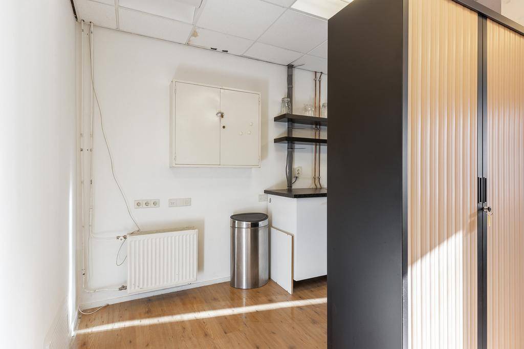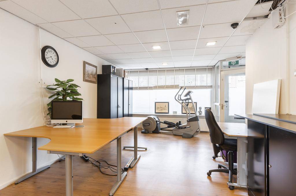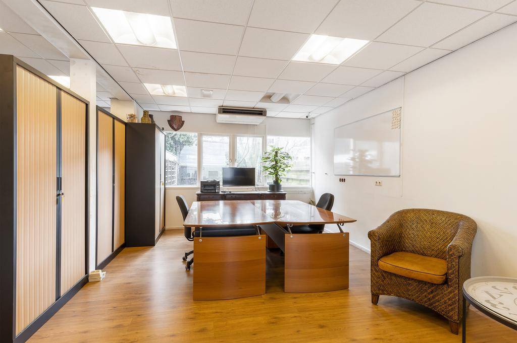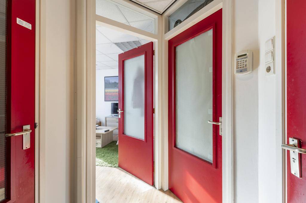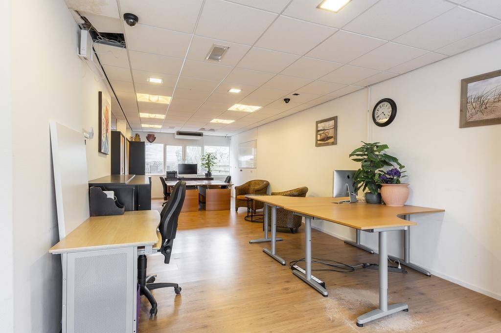 De entreehal is voorzien van de meterkast en geeft toegang tot de kantoorruimte en de trapopgang naar de eerste verdieping. De royale open kantoorruimte geeft toegang tot de keuken en is voorzien van een systeemplafond, een laminaatvloer, airconditioning en grote raampartijen. De keuken is ingericht met een elektrische kookplaat, afzuigkap, oven, de wasmachine-aansluiting en een deur naar de tweede hal. De tweede hal is voorzien van meerdere vaste kasten en geeft toegang tot de achtertuin en de berging. De riante berging biedt veel opbergmogelijkheden.