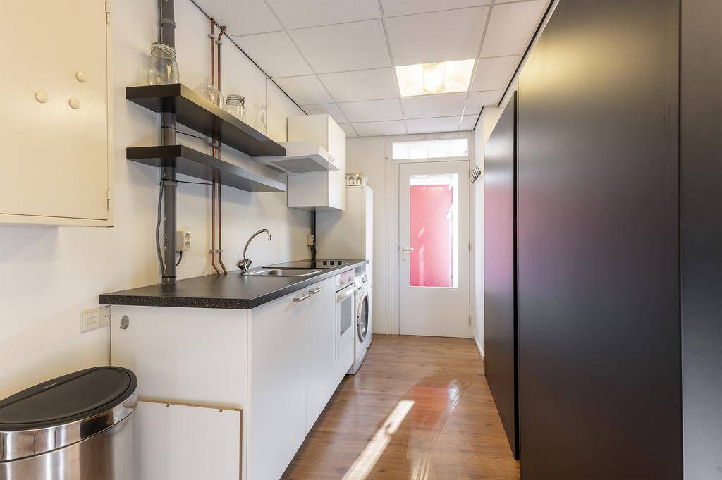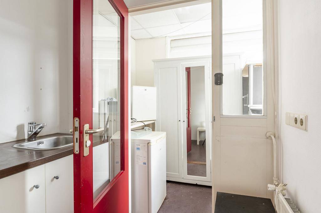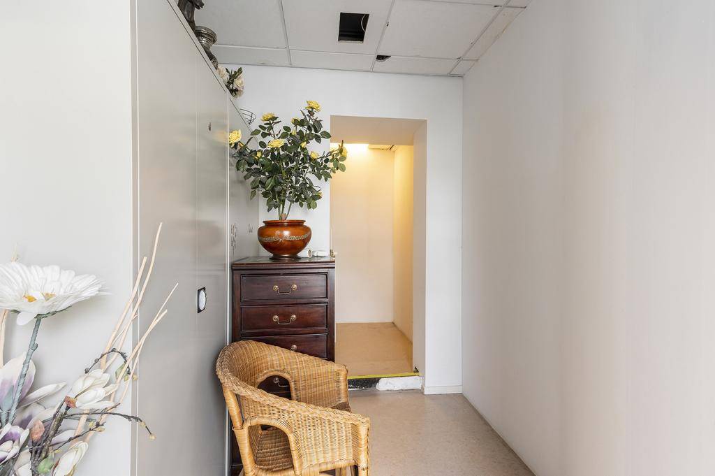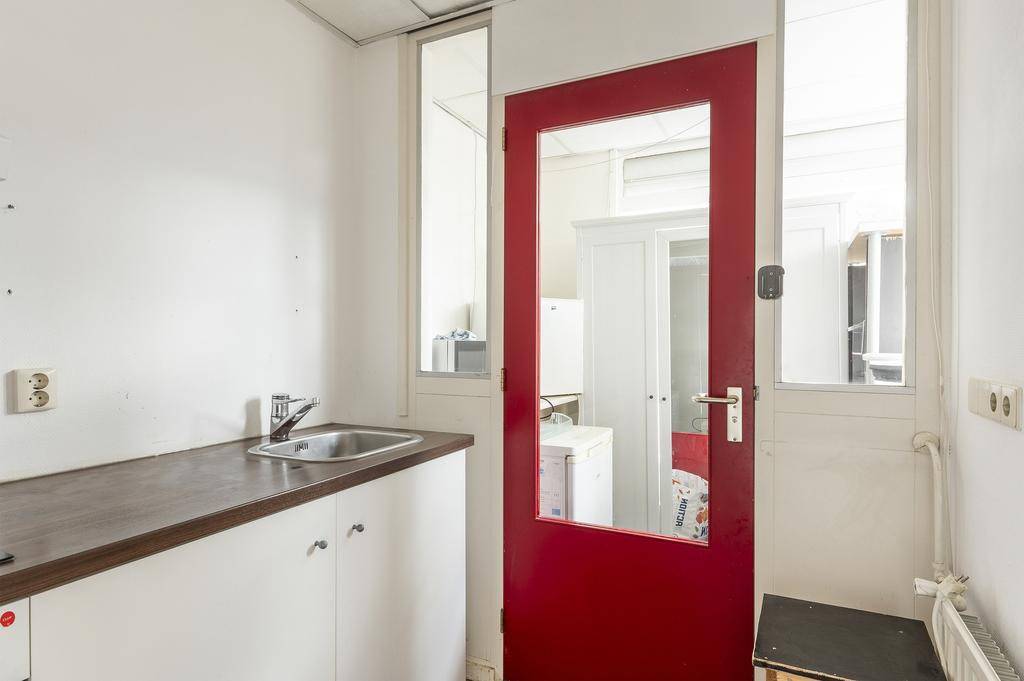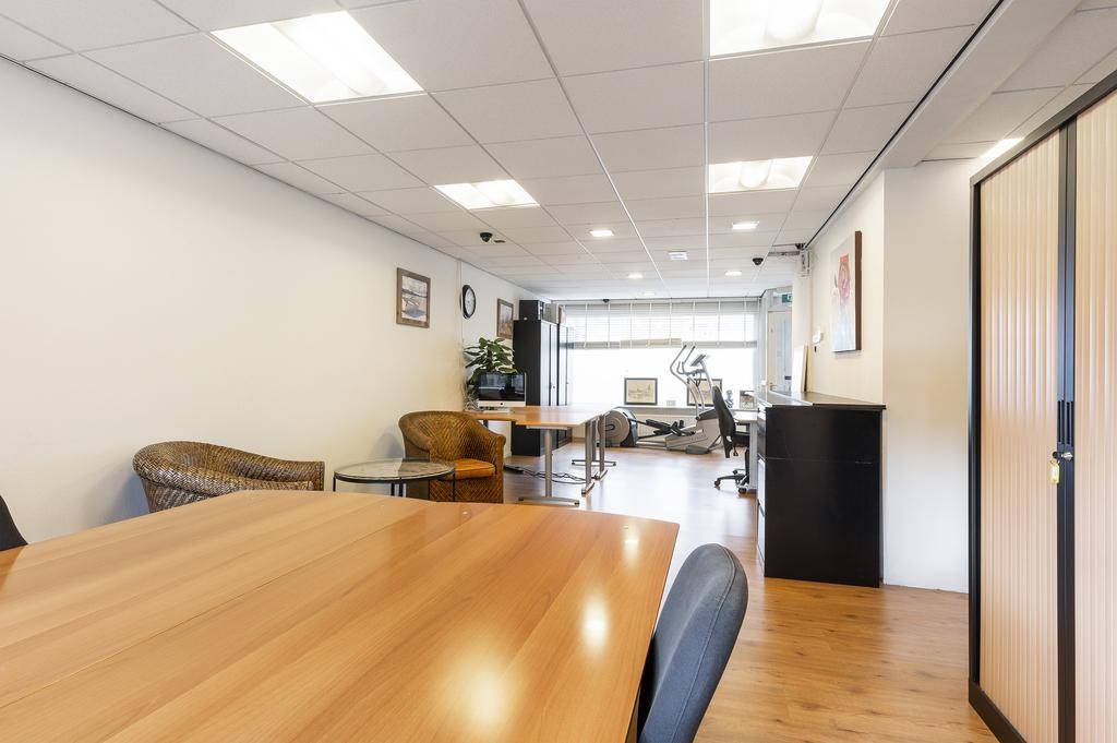 De entreehal is voorzien van de meterkast en geeft toegang tot de kantoorruimte en de trapopgang naar de eerste verdieping. De royale open kantoorruimte geeft toegang tot de keuken en is voorzien van een systeemplafond, een laminaatvloer, airconditioning en grote raampartijen. De keuken is ingericht met een elektrische kookplaat, afzuigkap, oven, de wasmachine-aansluiting en een deur naar de tweede hal. De tweede hal is voorzien van meerdere vaste kasten en geeft toegang tot de achtertuin en de berging. De riante berging biedt veel opbergmogelijkheden.