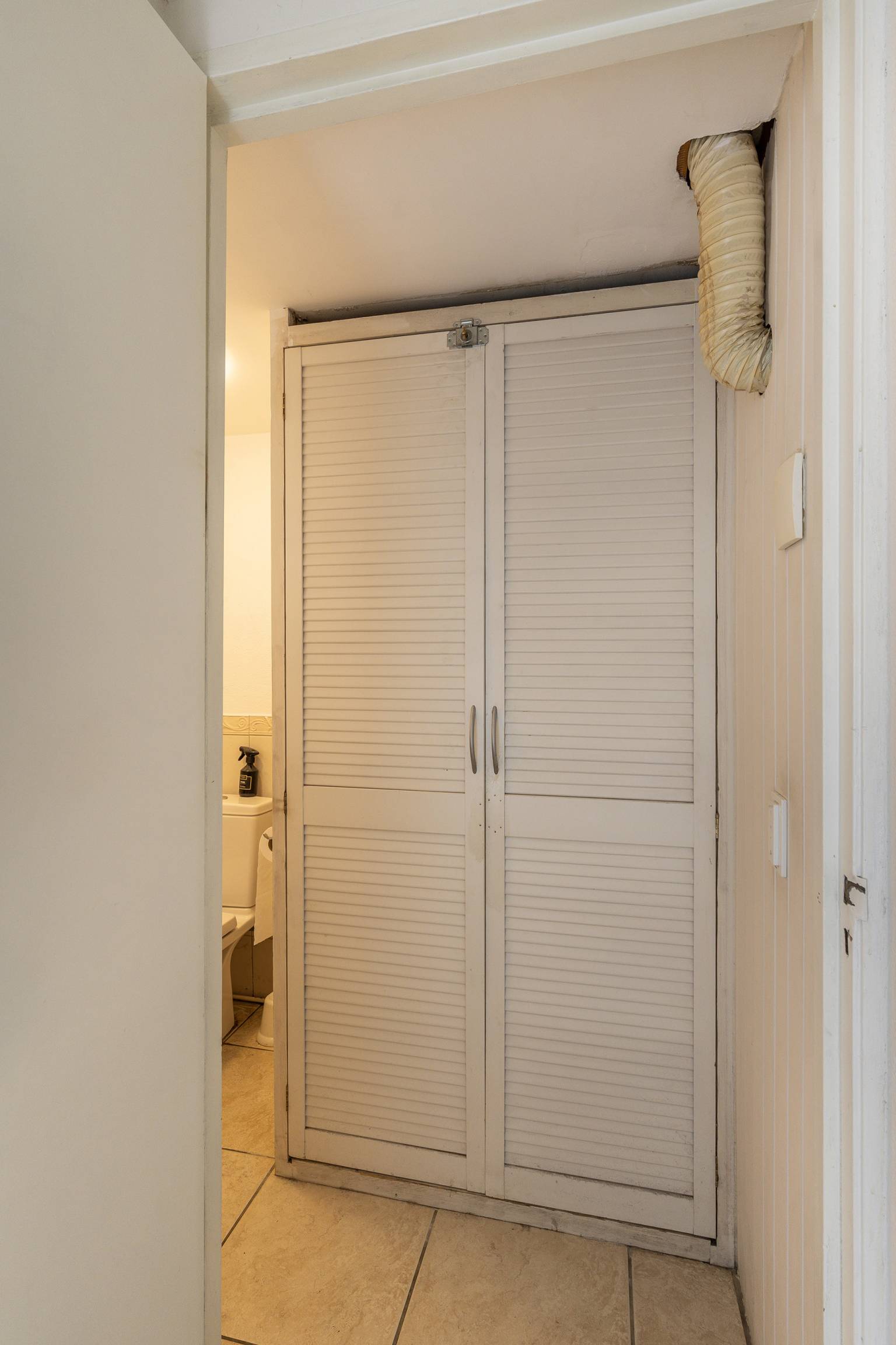 Het toilet is ruim van opzet en beschikt over een fonteintje en een vaste kast met louvredeurtjes met daarin de opstelling van de Cv-ketel en de aansluitingen voor de wasmachine en de droger.