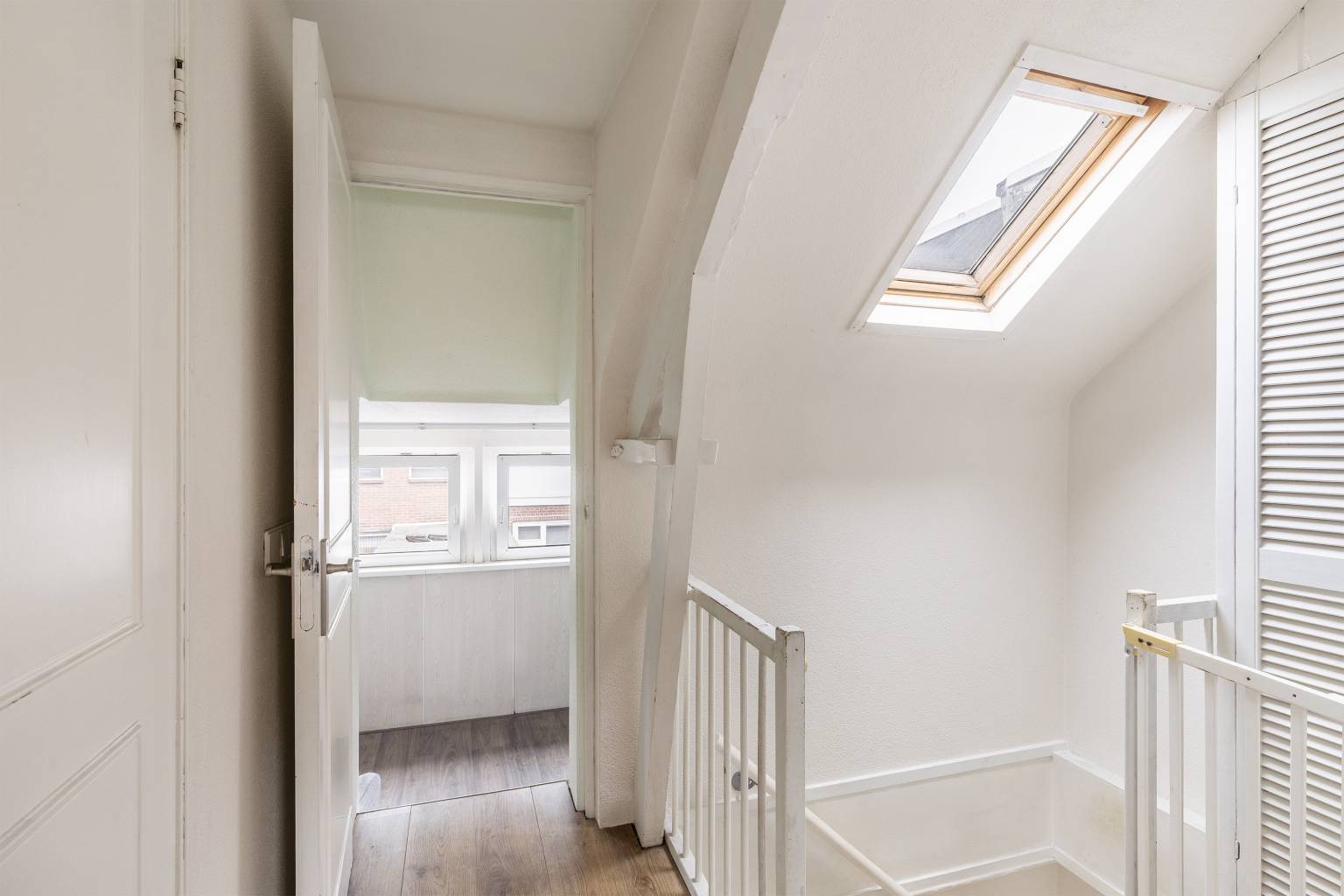 De trapopgang is in de schuine kap voorzien van dakraam en na de trapopgang is de overloop bereikbaar. Hier zijn de wanden afgewerkt met granol en ligt er een laminaatvloer, die is doorgetrokken naar de twee aanwezige slaapkamers. Daarnaast is er op de overloop een vaste kast aanwezig met louvredeurtjes en er is toegang tot de badkamer.