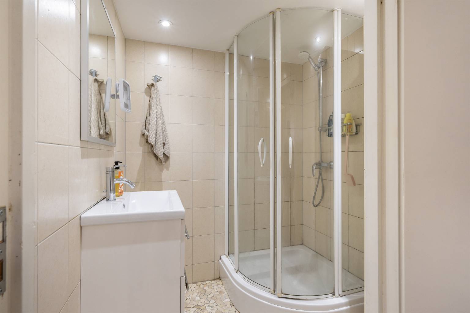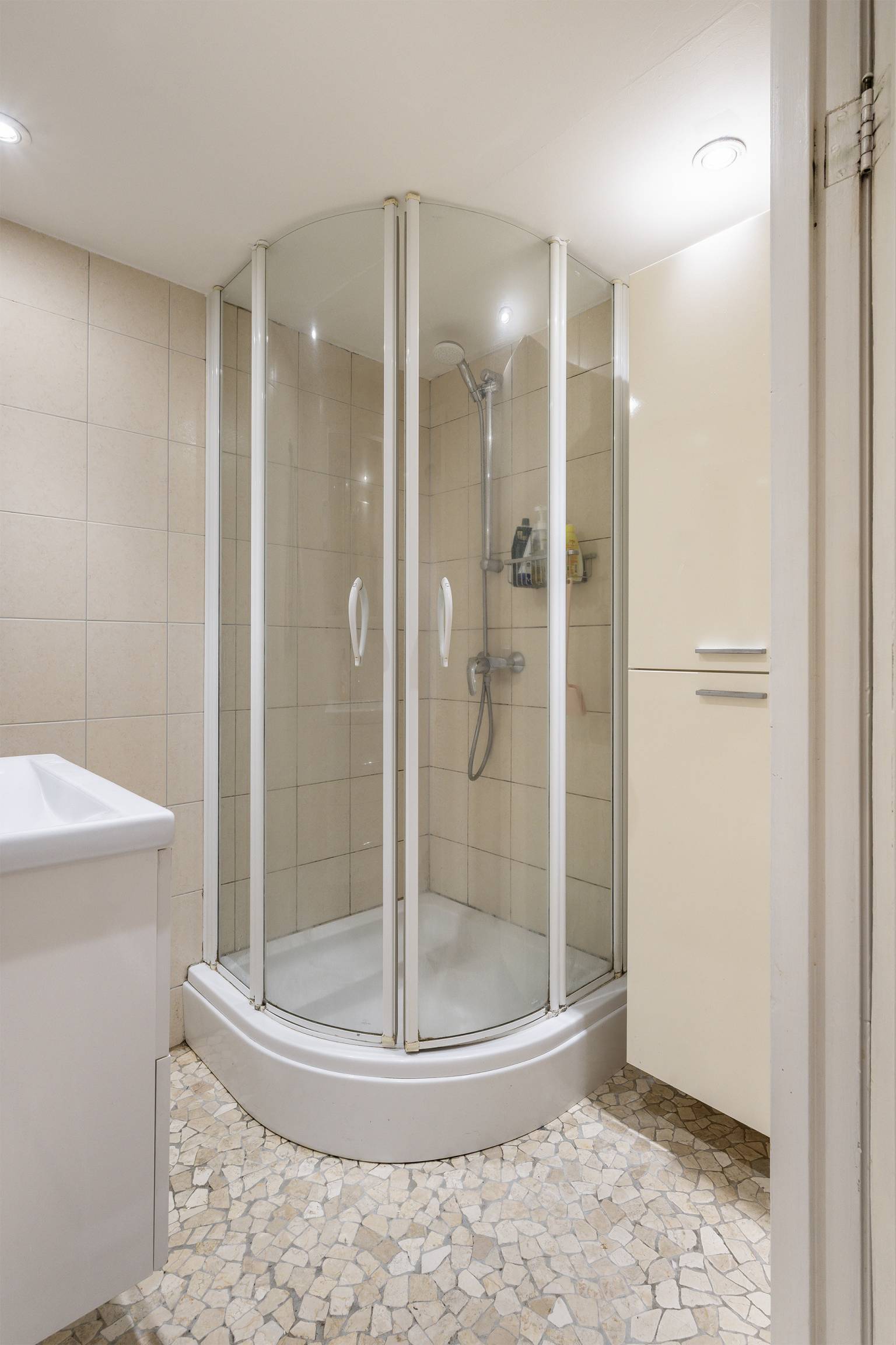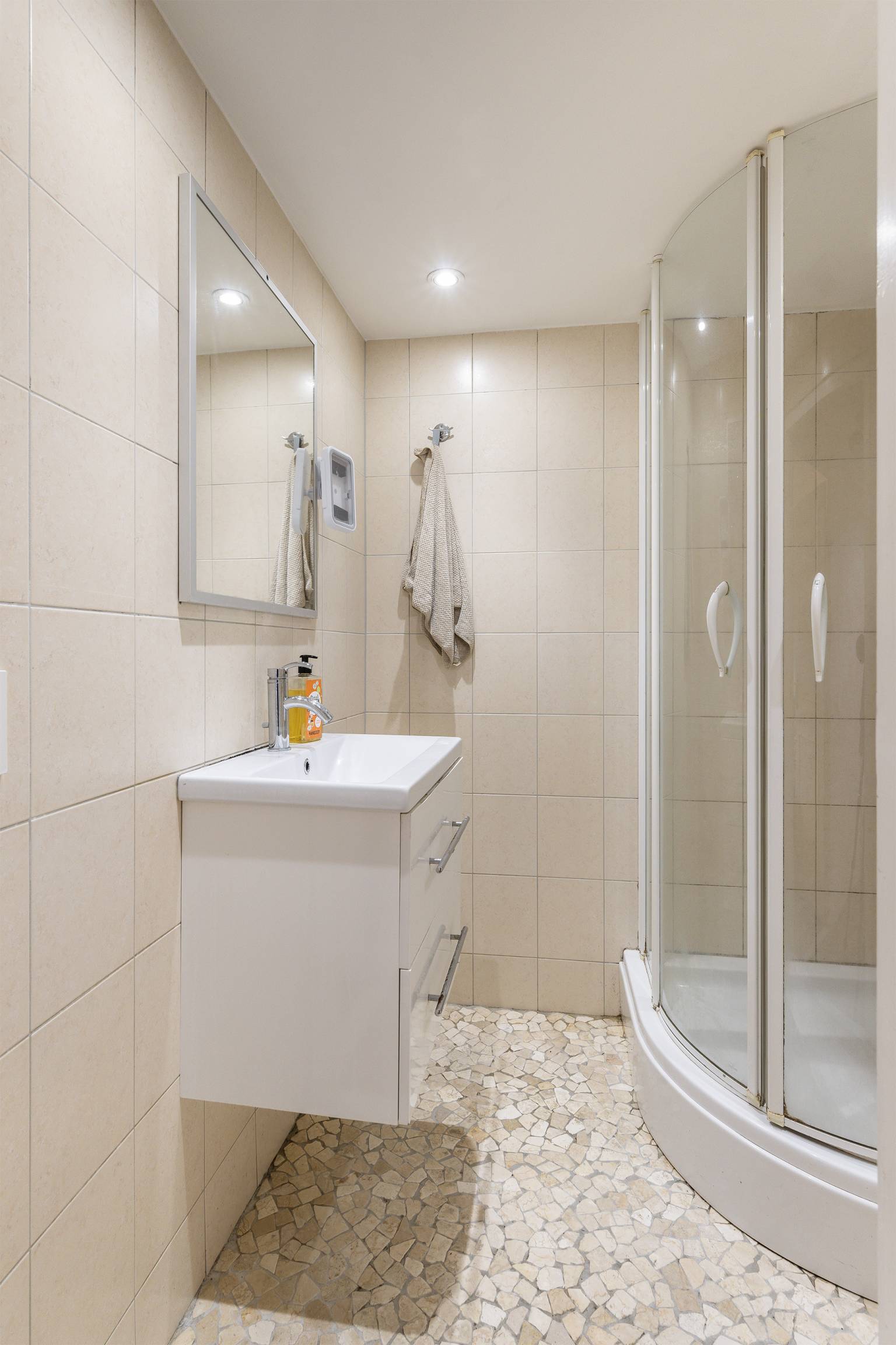 De inpandige badkamer is volledig betegeld en uitgerust met een douchecabine en een wastafelmeubel. Ook hangt er een hoge kast en is het plafond voorzien van inbouw spots.