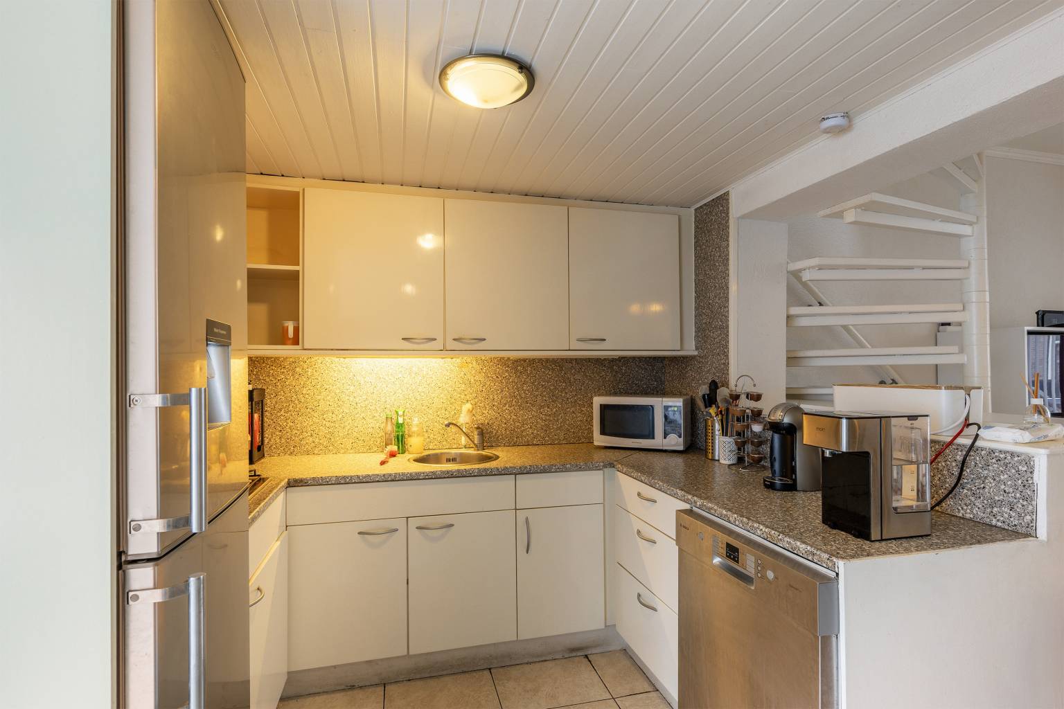 De open keuken in geplaatst in een U-vorm, waarbij het aanrechtblad doorloopt naar de achterwand. Er is een 4-pits gaskookplaat en een afzuigkap in de keuken verwerkt en er zijn bovenkasten met verlichting aanwezig. Het plafond is afgewerkt met houten schroten en de wanden zijn afgewerkt met granol.