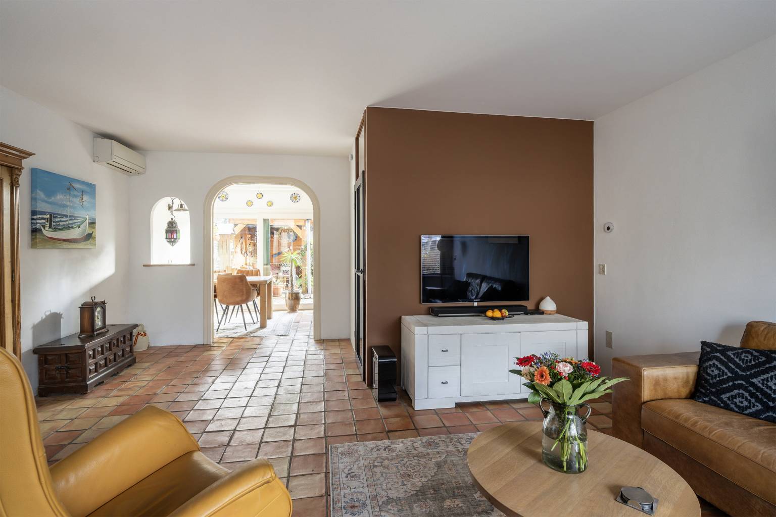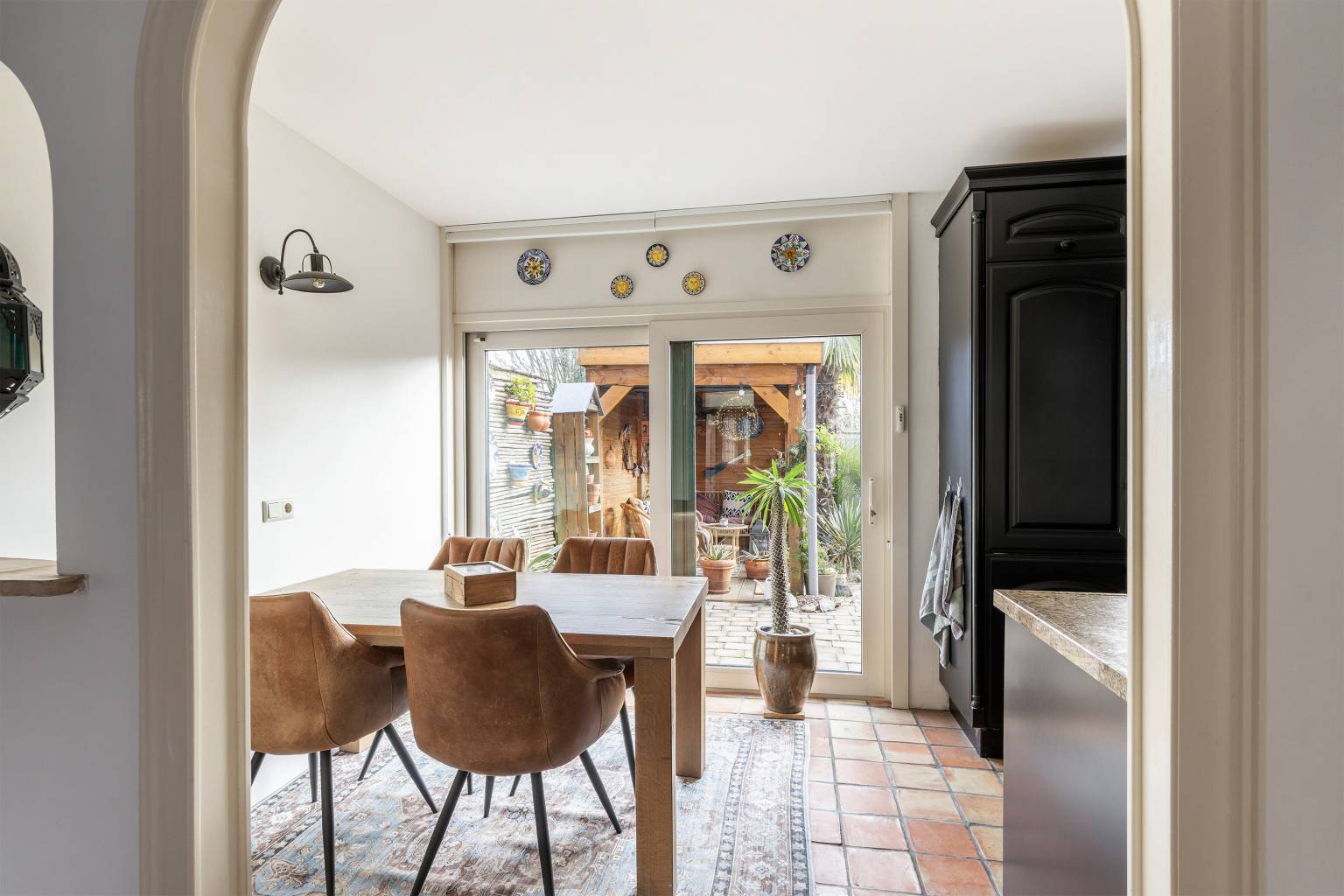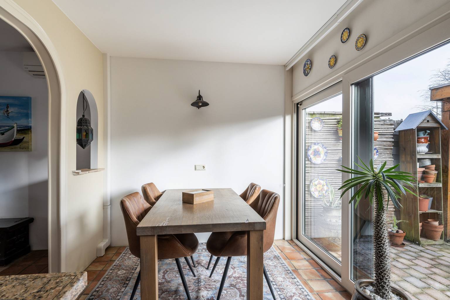 Tussen het vele groen van de wijk Holy, in een rustige straat staat deze fijne eengezinswoning die meteen een warm vakantiegevoel oproept. Nog voordat je binnen bent, maakt de zonnige voortuin met mediterrane planten en een palmboom al duidelijk dat dit een plek is waar je elke dag een beetje kunt genieten alsof je op vakantie bent. De omgeving is net zo prettig. Scholen, winkels, sportvoorzieningen en recreatiegebieden liggen allemaal op korte afstand en dankzij de vele wandel- en fietsroutes voelt het buitenleven hier altijd dichtbij. Binnen word je verwelkomd in een sfeervolle woning. De terracotta handgebakken vloertegels lopen door over de gehele begane grond en geven de woning direct karakter. De woonkamer met vloerverwarming en airconditioning vormt een heerlijke plek om te ontspannen, terwijl de open verbinding met de eetkamer zorgt voor een fijne, lichte leefruimte. De keuken sluit daar perfect op aan. Een praktische L-opstelling met veel kastruimte, een betegelde achterwand en complete uitrusting met onder andere een oven, magnetron, vaatwasser, koelkast, vriezer, gaskookplaat en afzuigkap. Dankzij de brede schuifpui én de extra deur vanuit de keuken staat de leefruimte mooi in verbinding met de achtertuin.