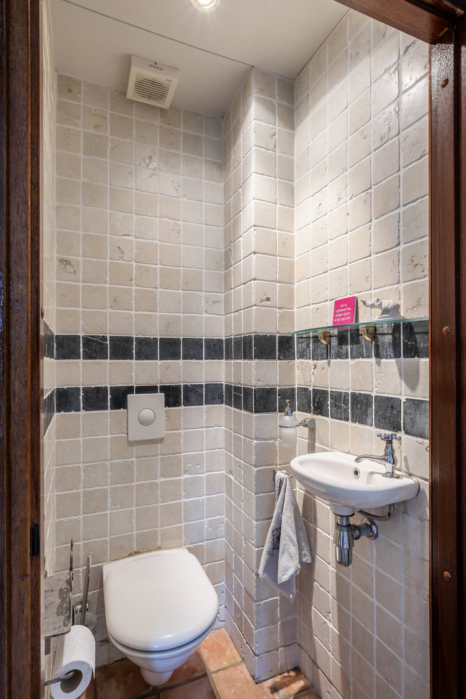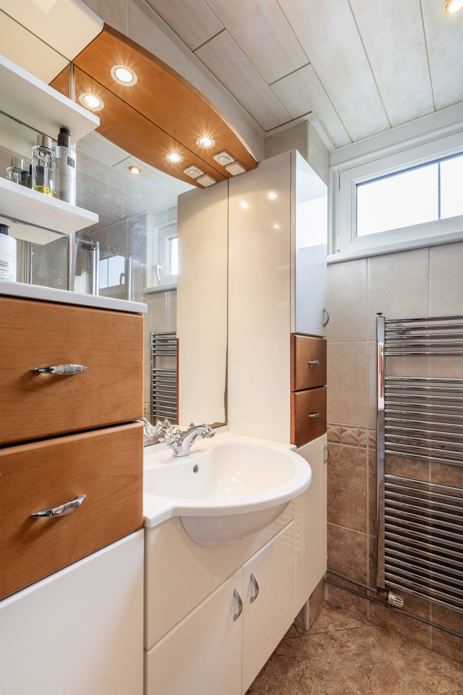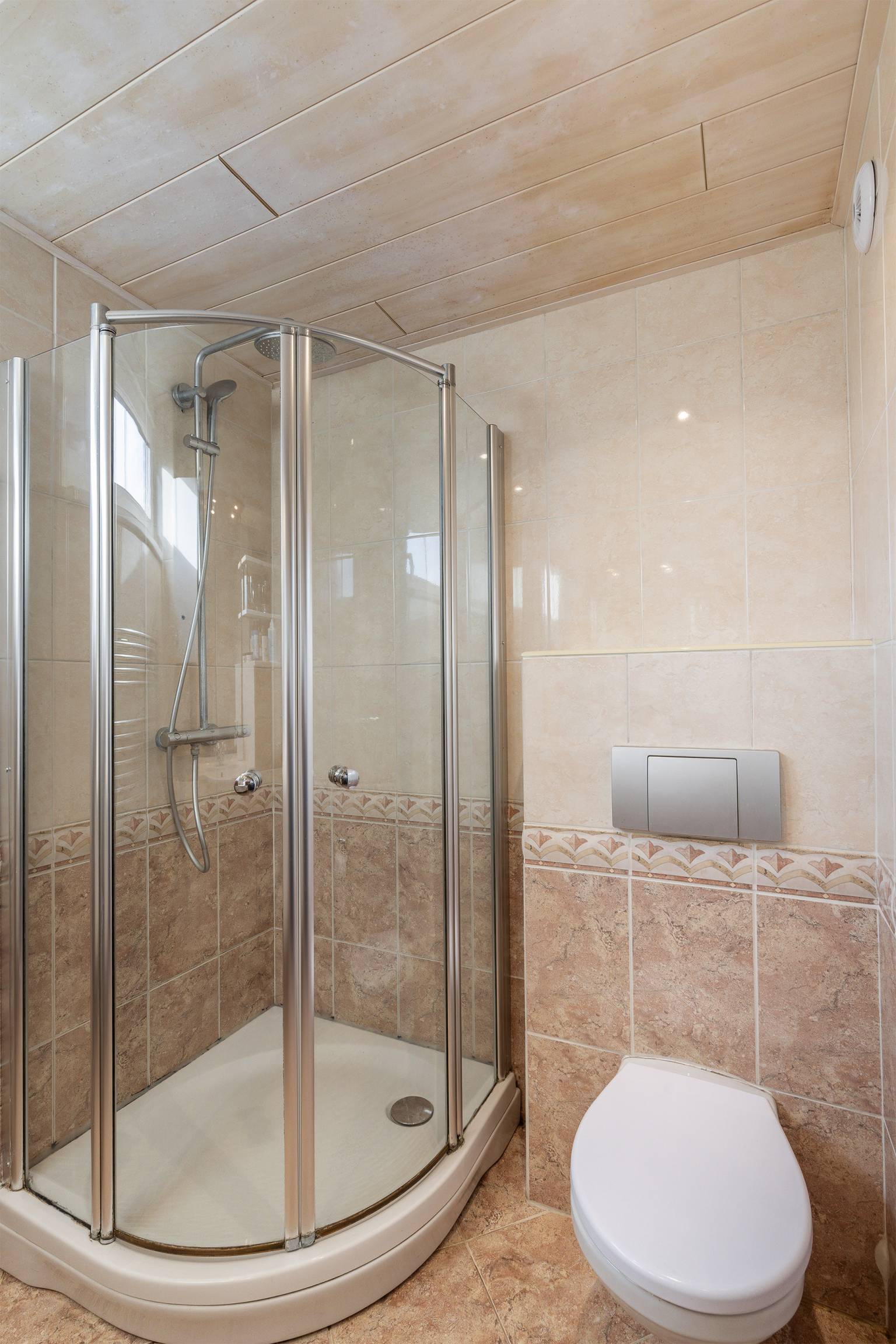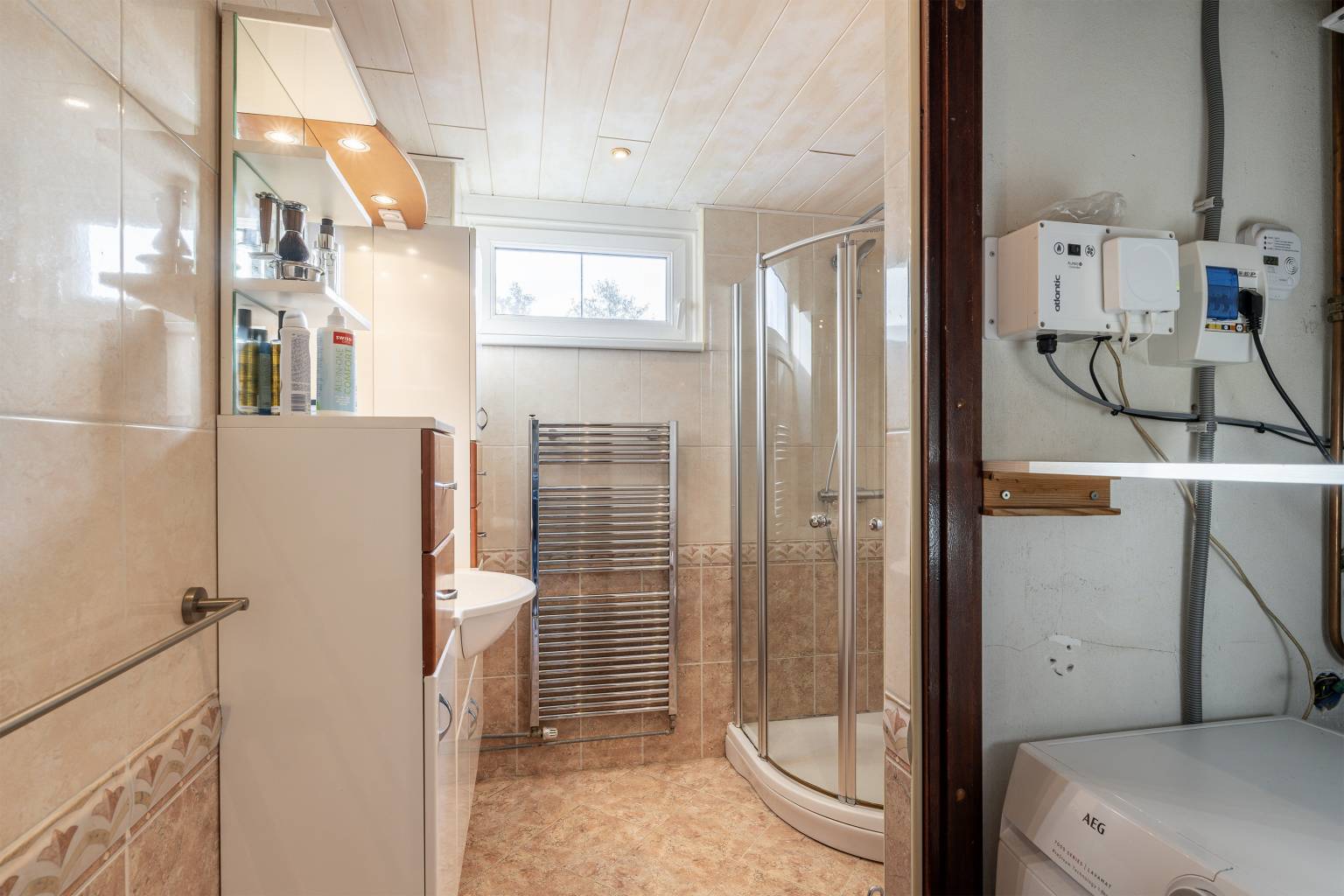 De badkamer is volledig betegeld en uitgerust met een douchecabine, een zwevend toilet en een wastafelmeubel met een spiegel en verlichting. Ook hangt er een handdoeken radiator en is er een open kast met daarin de aansluiting van de wasmachine en de opstelling van de Cv-ketel. Het plafond is voorzien van inbouw spots en er is een te openen raam aanwezig.