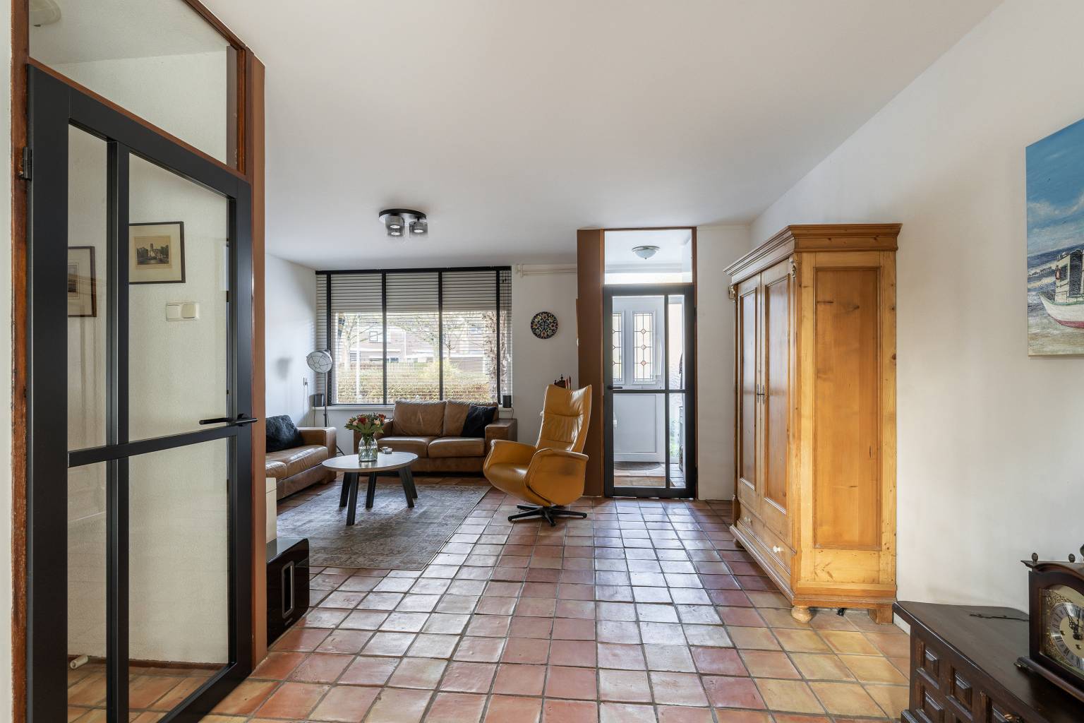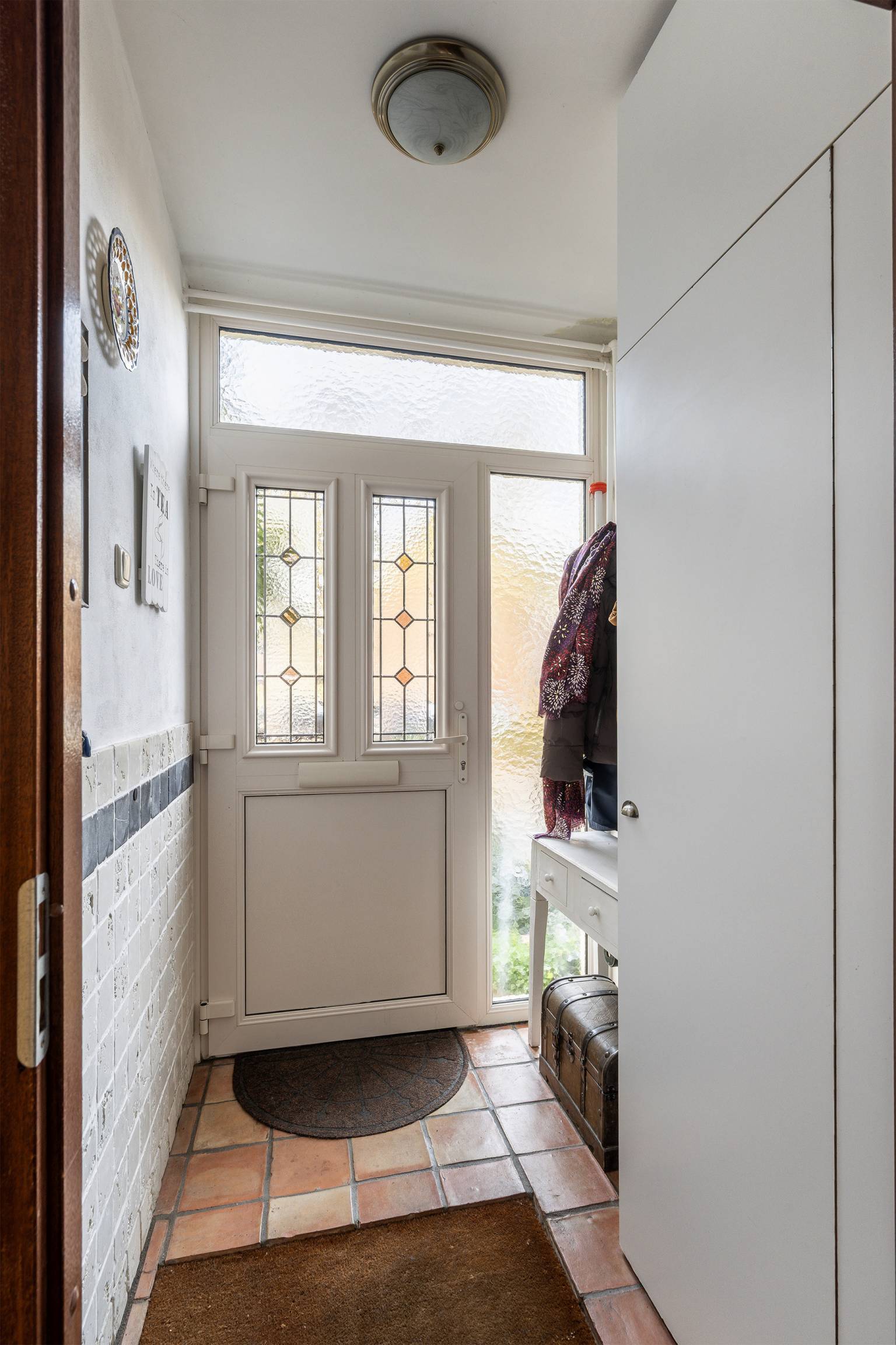 Na de voordeur is er een binnenkomst in de afsluitbare entreehal. Deze is voorzien van de meterkast en er is een deur naar de woonkamer. De wanden zijn deels afgewerkt met tegeltjes en de vloer is voorzien van terracotta handgebakken vloertegels, wat is doorgetrokken over de gehele begane grond.
