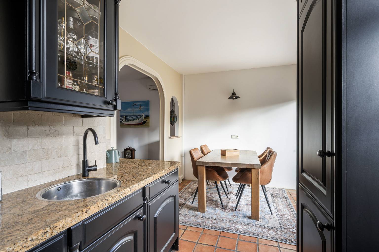 De eetkamer heeft een brede schuifpui naar de achtertuin en de keuken is opgesteld in een L-vorm met bovenkasten en een aparte hoge kast. De achterwand is betegeld en er is een oven, een magnetron, een vaatwasser, een koelkast, een vriezer, een gaskookplaat en een afzuigkap aanwezig. Tevens is er vanuit de keuken ook een deur naar de achtertuin.