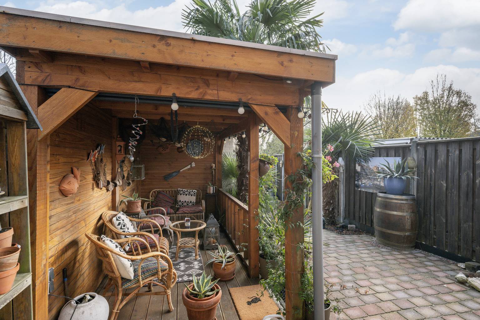 De achtertuin heeft hetzelfde mediterrane sfeertje als de voortuin en is afwisselend aangelegd met tegels en borders. Achterin de tuin staat een berging, die is voorzien van elektra en daaraan is een houten overkapping gemaakt met vlonderplanken als ondergrond. De tuin is volledig omheind door houten schuttingen en er is een achteruitgang. Ook hangt er aan de gevel een elektrisch bedienbaar zonnescherm.