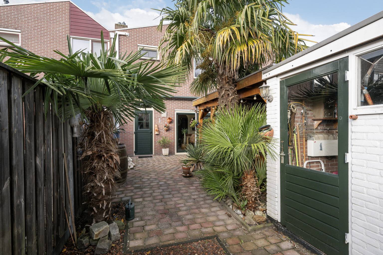 Vanaf de straat is er een brede open toegang tot de voortuin, die opvalt door de mediterrane planten en de grote palmboom. Het pad naar de voortuin is bestraat en aan de gevel van de woning hangt een markies.