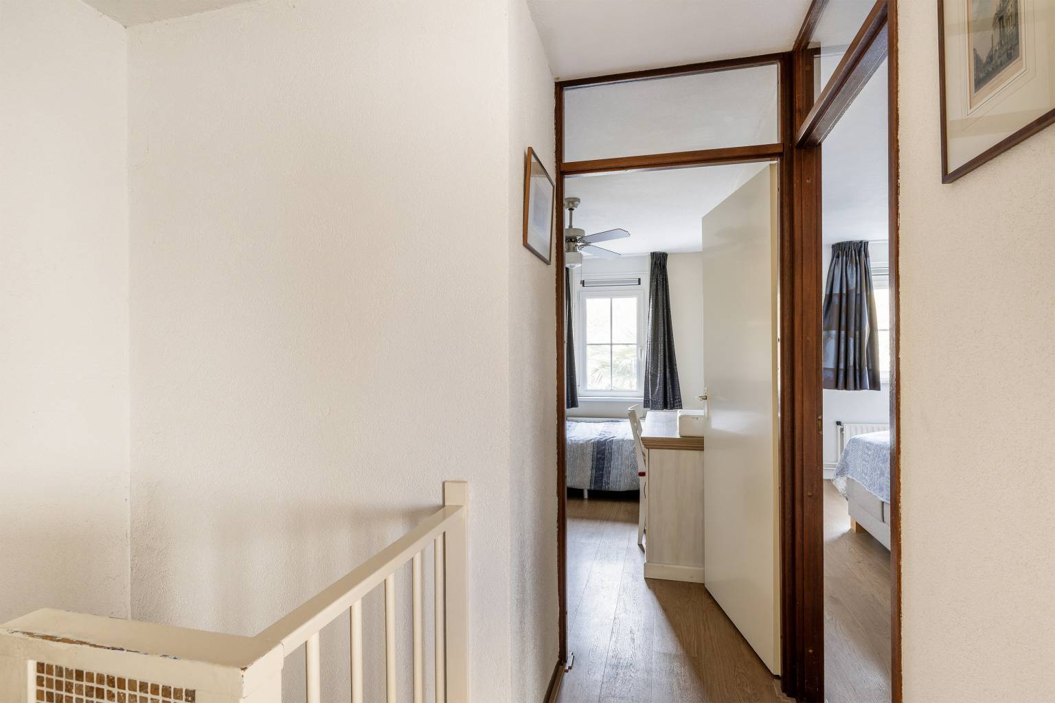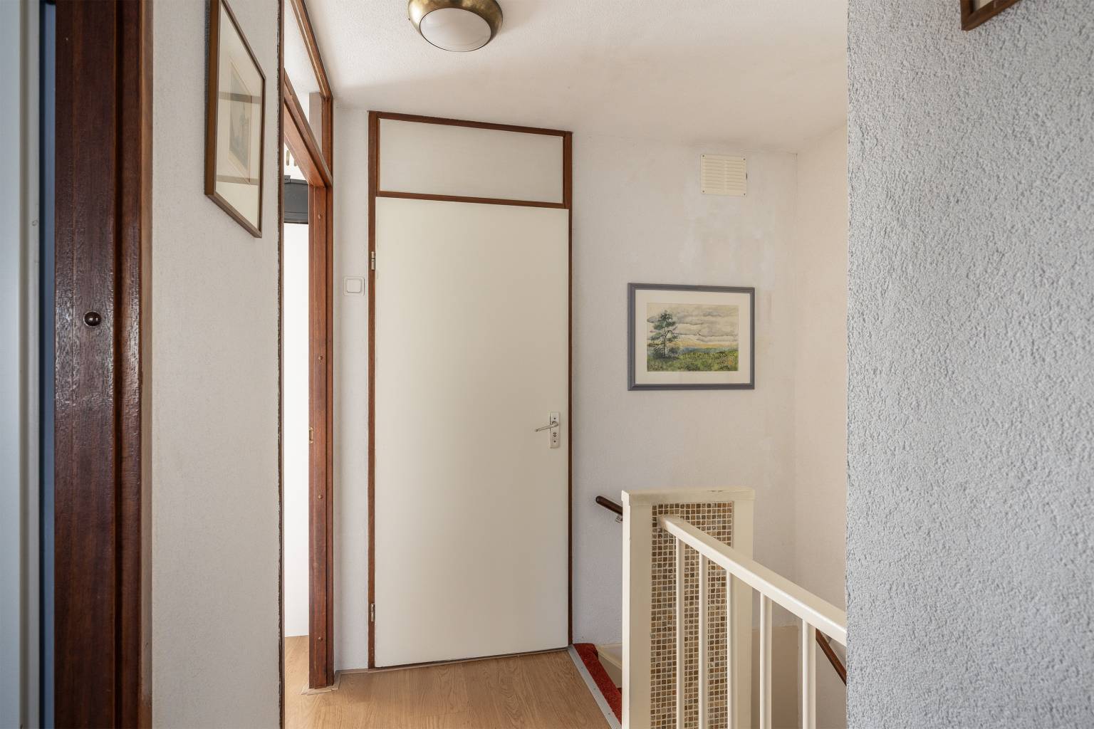 Na de trapopgang is de overloop bereikbaar. Deze geeft toegang tot drie slaapkamers, de badkamer en de vliering. Op de vloer ligt laminaat, dat drempelloos is doorgetrokken naar de slaapkamers.