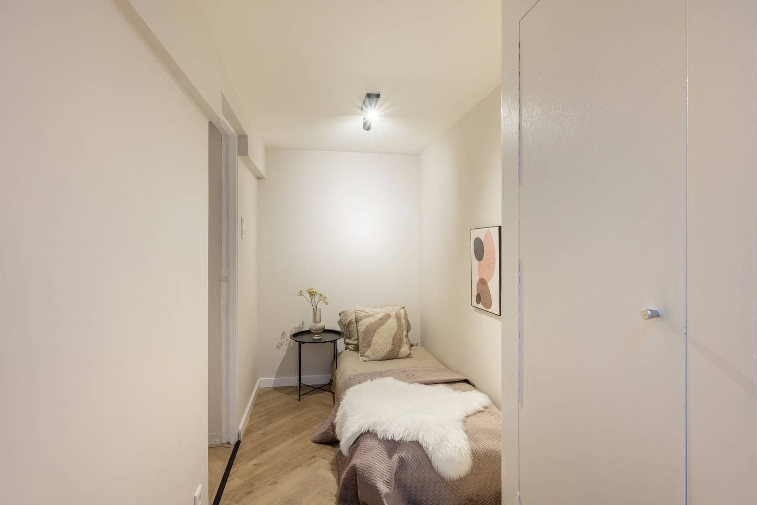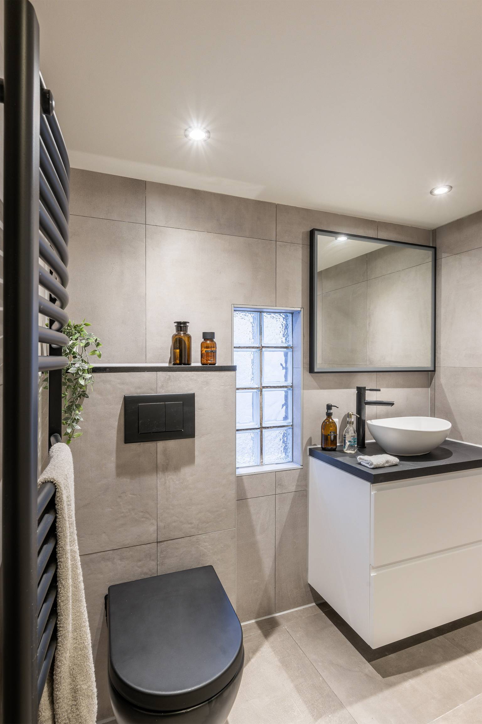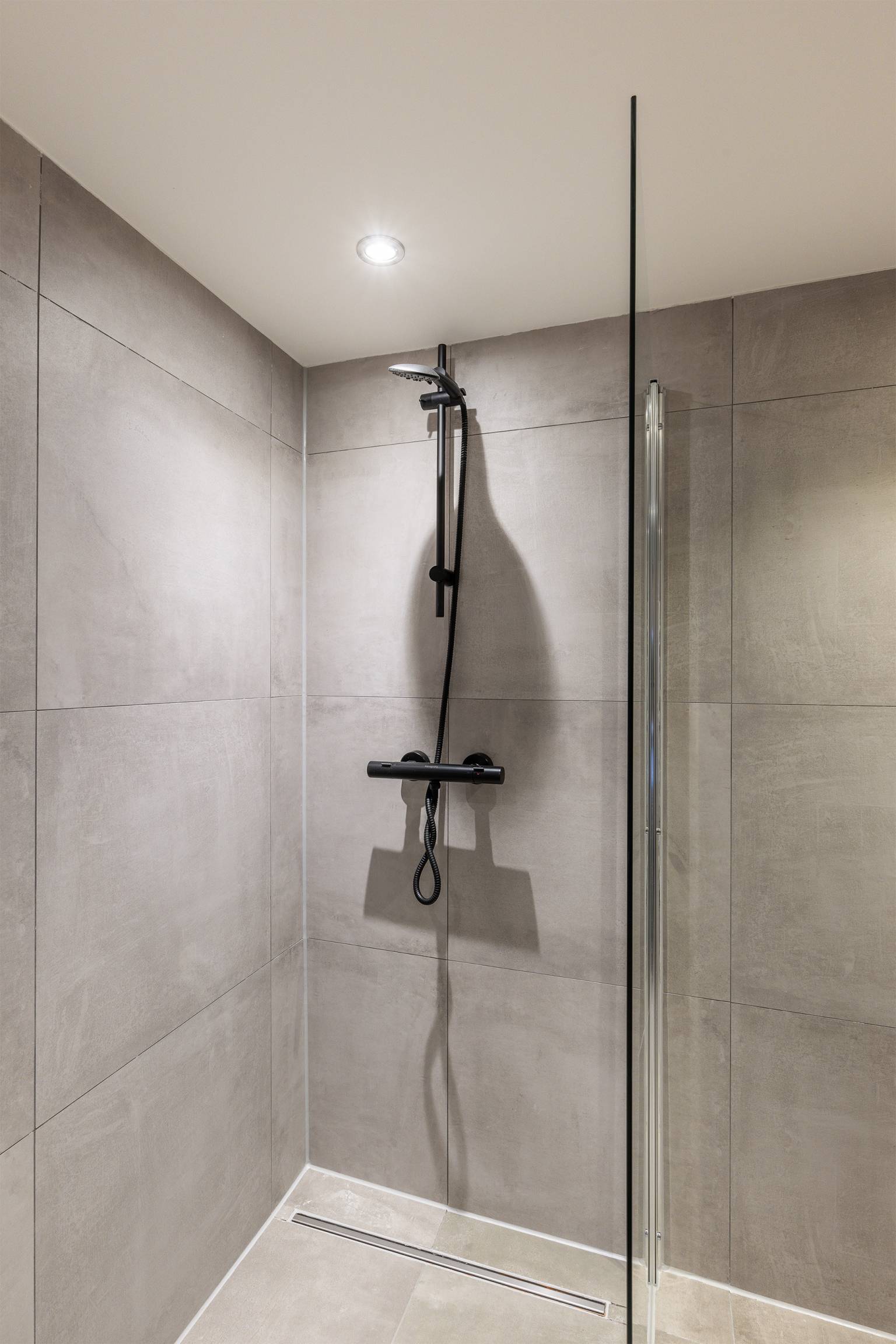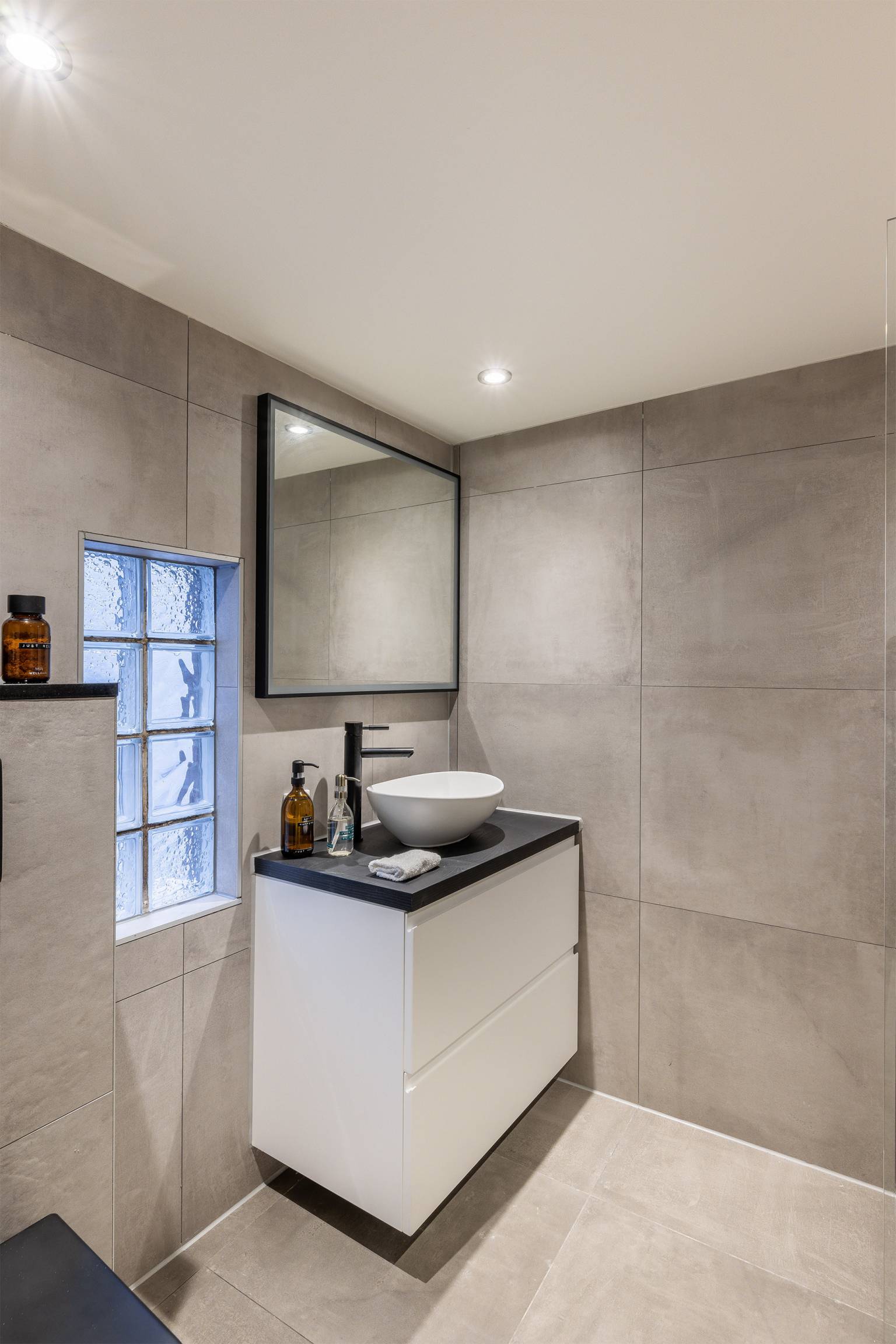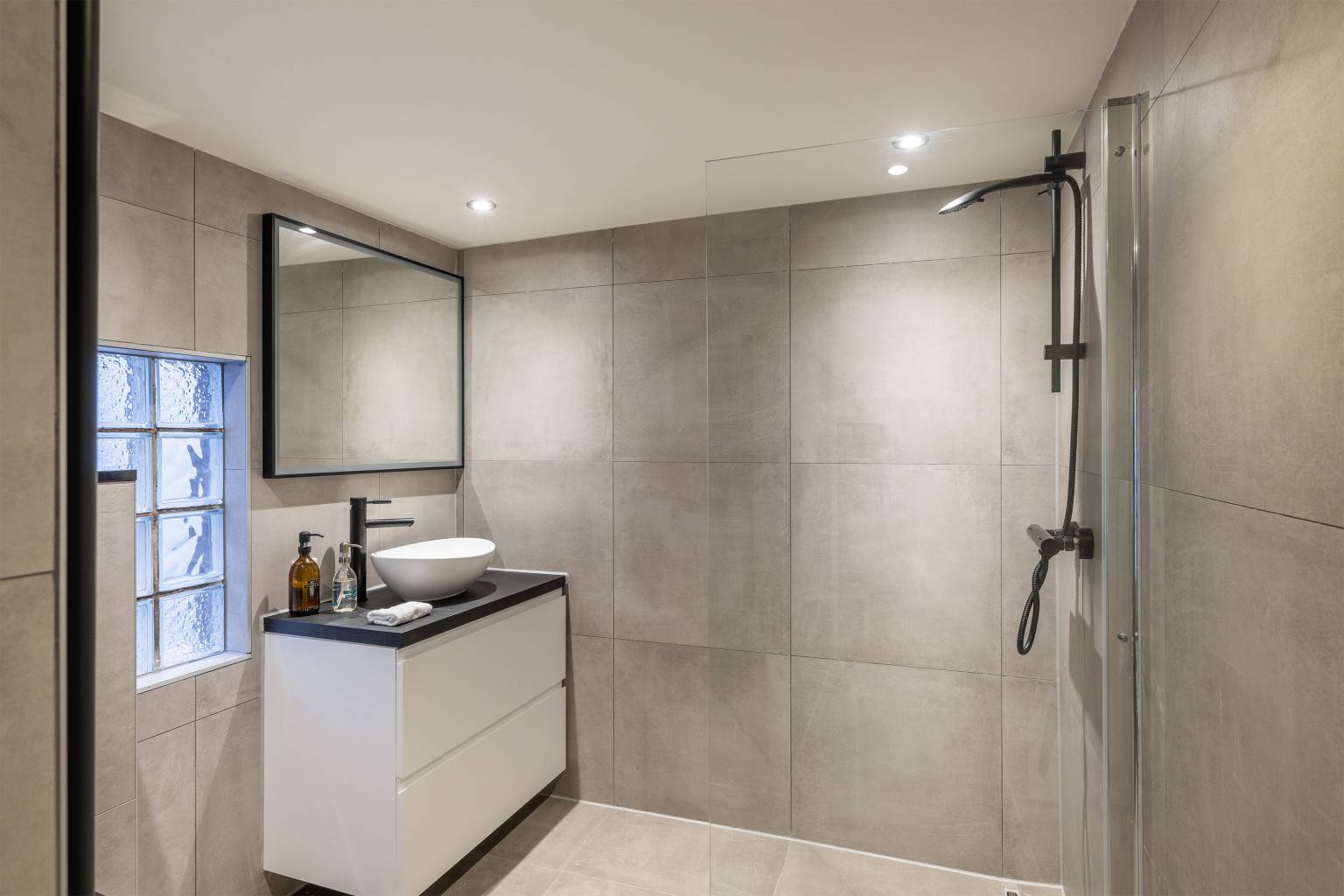 De moderne badkamer is volledig betegeld en uitgerust met een inloopdouche, een toilet, een wastafelmeubel en een handdoeken radiator. Het raam, bestaande uit glazen blokken, zorgt voor daglichttoetreding en het strak afgewerkt plafond is voorzien van inbouw spots.