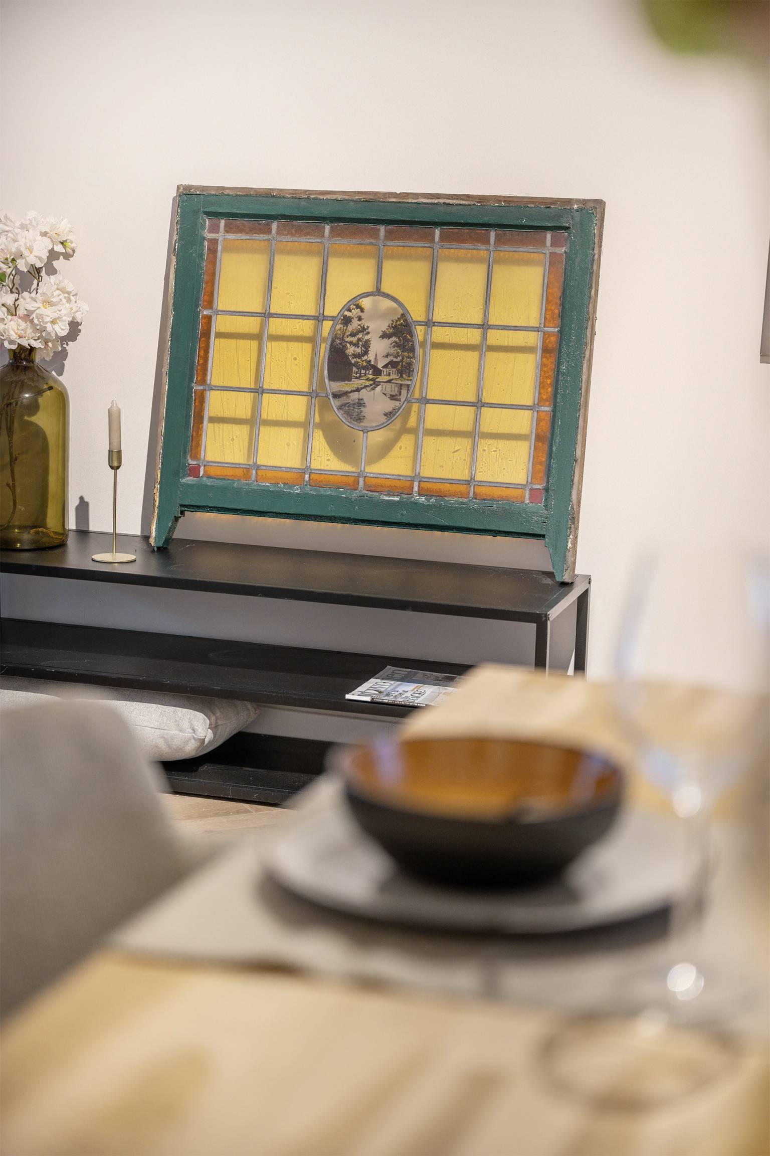 De sfeervolle woonkamer is gesitueerd aan de voorzijde en heeft twee hoge ramen met glas-in-lood bovenlichten en de meterkast is netjes weggewerkt naast de raampartij. De woonkamer staat in open verbinding met de eetkamer, wat zorgt voor een sfeervol geheel. Vanuit de eetkamer is er een open toegang tot de keuken.