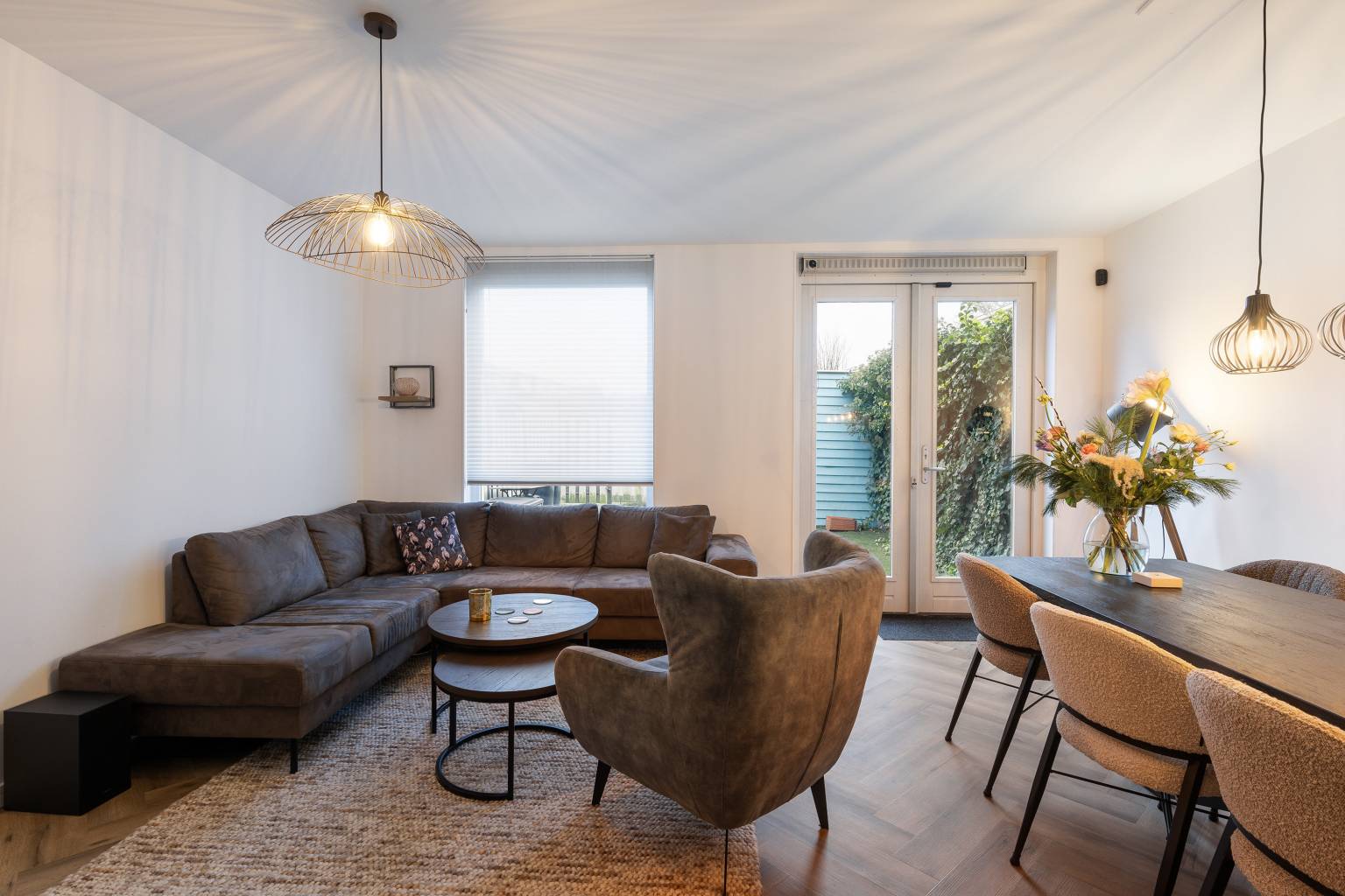 De woonkamer heeft een gezellige zithoek aan de achterzijde en beschikt over openslaande deuren naar de tuin. In het verlengde, richting de open keuken is er ruimte voor een eethoek en ook hier zijn alle wanden gestuukt. De keuken is opgesteld in een L-vorm en staat gedeeltelijk vrij. De bovenkasten zijn voorzien van verlichting en de achterwand is voorzien van een gladde, makkelijk afneembare plaat. Daarnaast is er diverse apparatuur aanwezig, zoals een vaatwasser, een een Quooker en te midden van het aanrechtblad staat er een Smeg gasfornuis met oven. Daarboven hangt een afzuigkap en de Amerikaanse koelkast is ter overname.