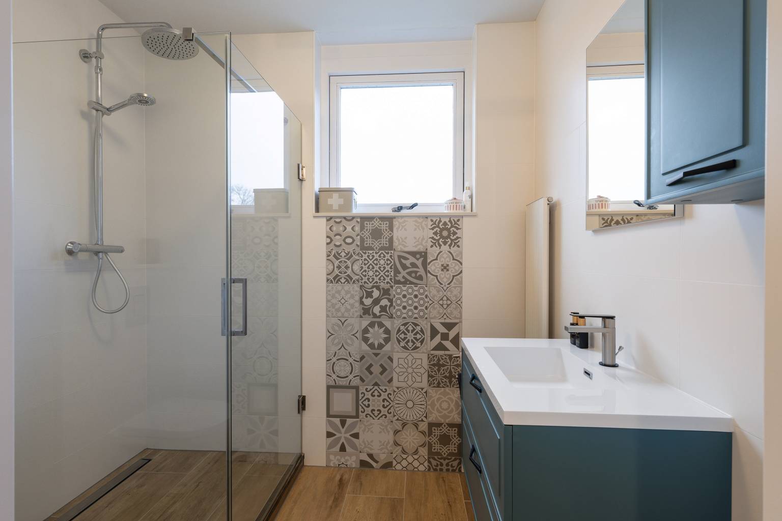 De badkamer is grotendeels betegeld en uitgerust met een douche, een zwevend toilet en een wastafelmeubel. Het te openen raam zorgt naast daglicht ook voor natuurlijke ventilatie en daarnaast is er ook mechanische ventilatie aanwezig.