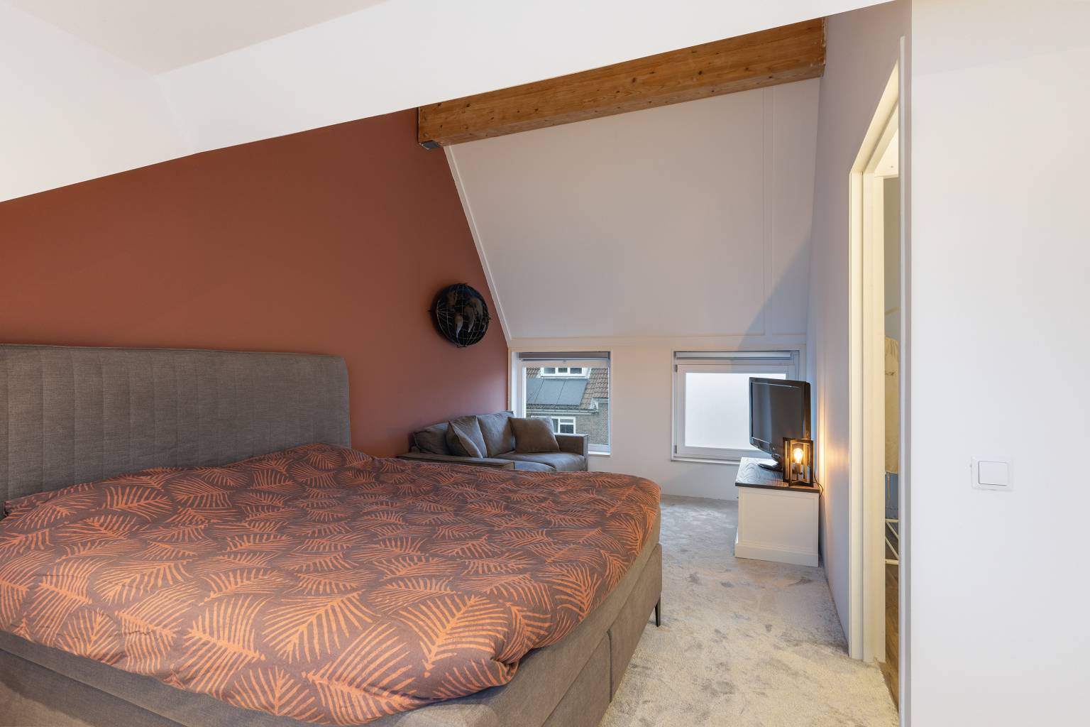 Deze ruime slaapkamer beschikt over een grote dakkapel met daaronder knieschotten voor extra opbergmogelijkheden. De houten balk is een fraai detail, op de vloer ligt vloerbedekking en alle wanden zijn gestuukt.