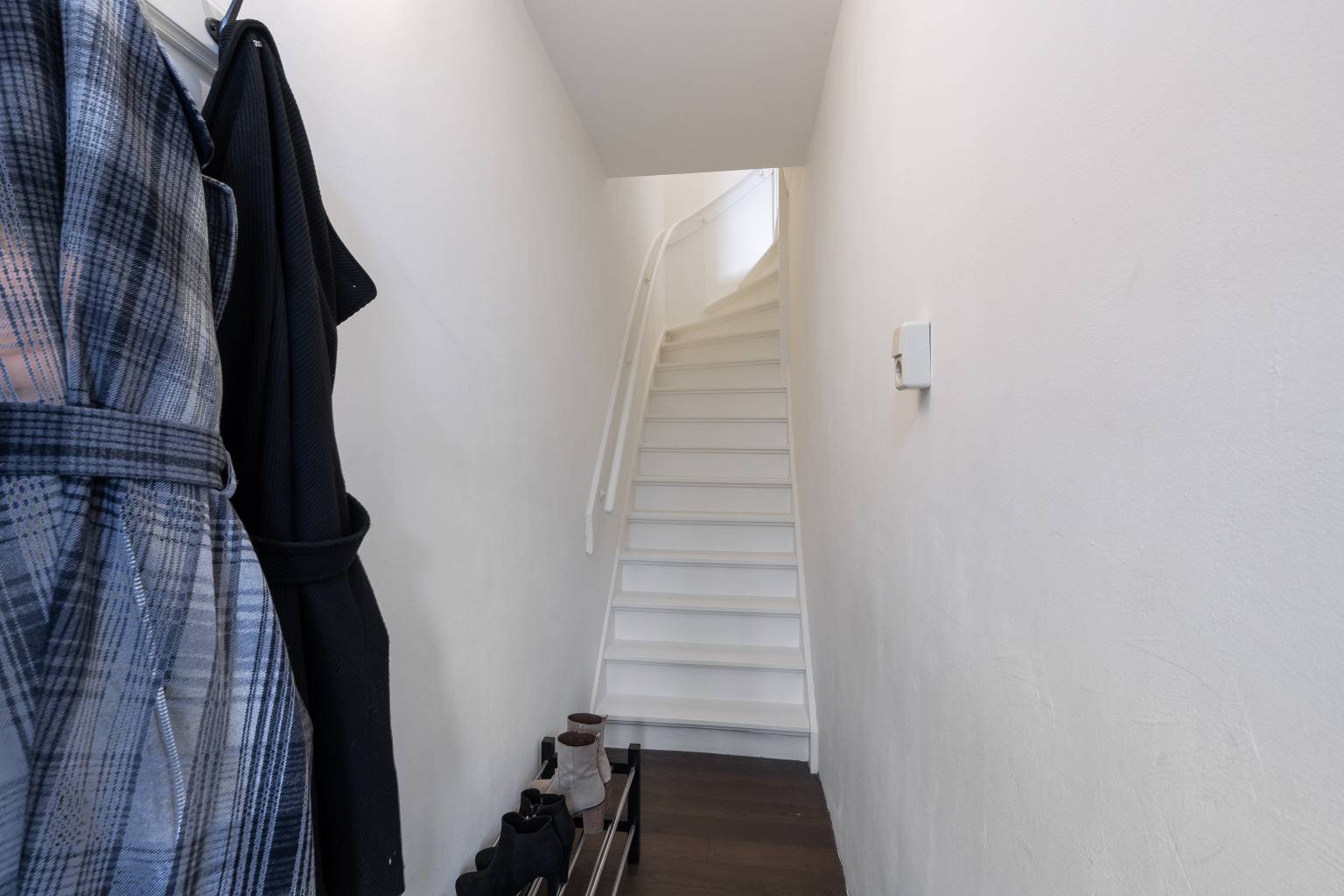 De voordeur is direct bereikbaar vanaf de straat en zorgt voor een binnenkomst in de entreehal met de trap naar de 1e verdieping. De hal heeft gestuukte wanden, achter de voordeur ligt een schoonloopmat en de rest van de vloer is voorzien van laminaat.