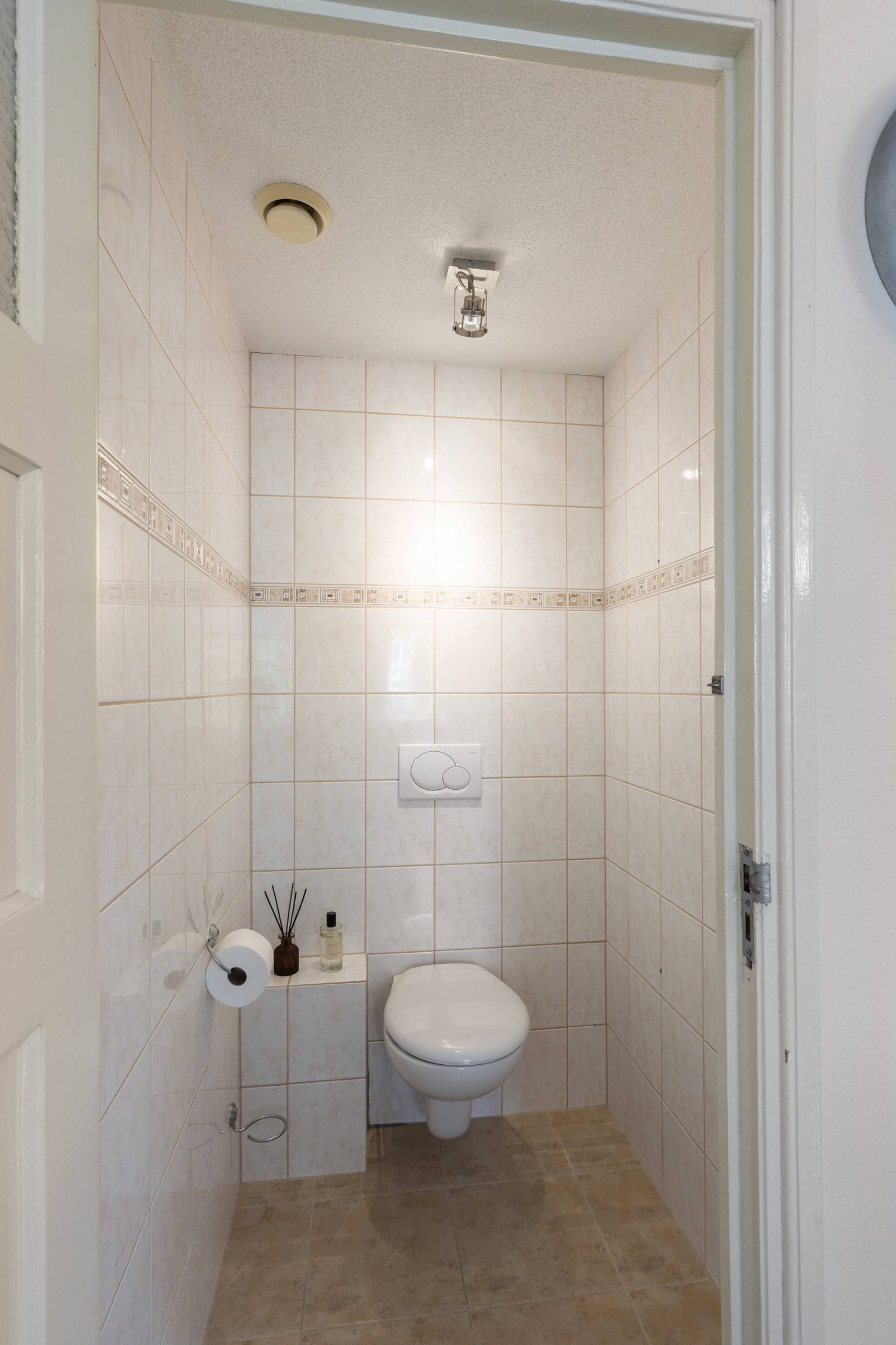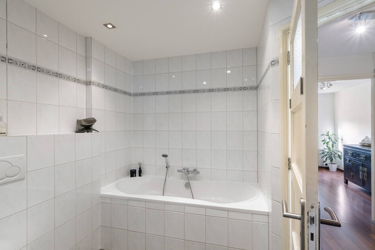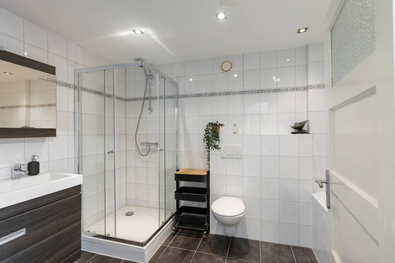 De inpandige badkamer is volledig betegeld, voorzien van vloerverwarming en uitgerust met een ligbad met een handdouche, een douchecabine, een toilet en een wastafelmeubel met een hoge kast en een spiegelkast. Daarnaast is er ventilatie aanwezig en is het plafond voorzien van inbouwspots.