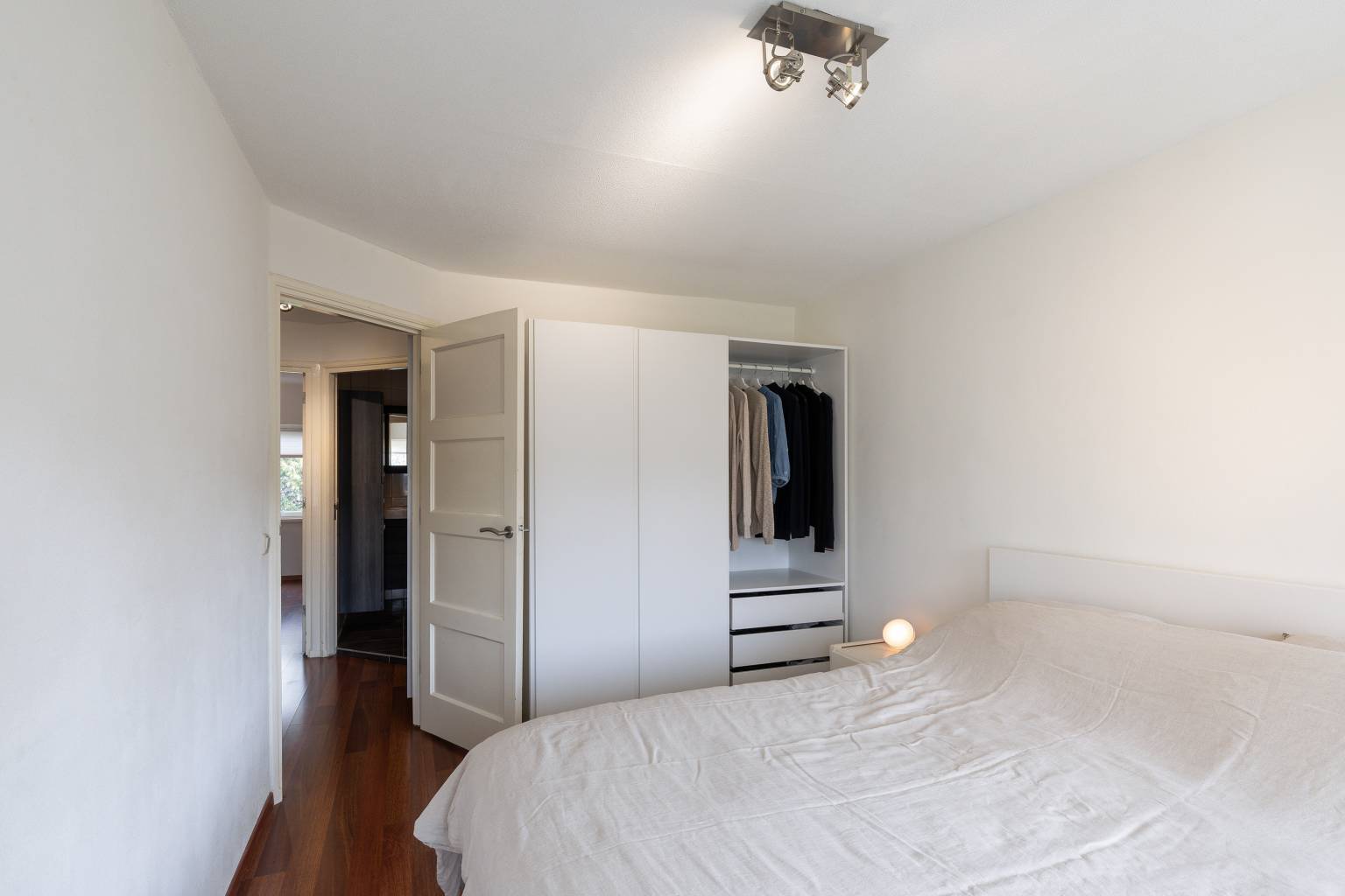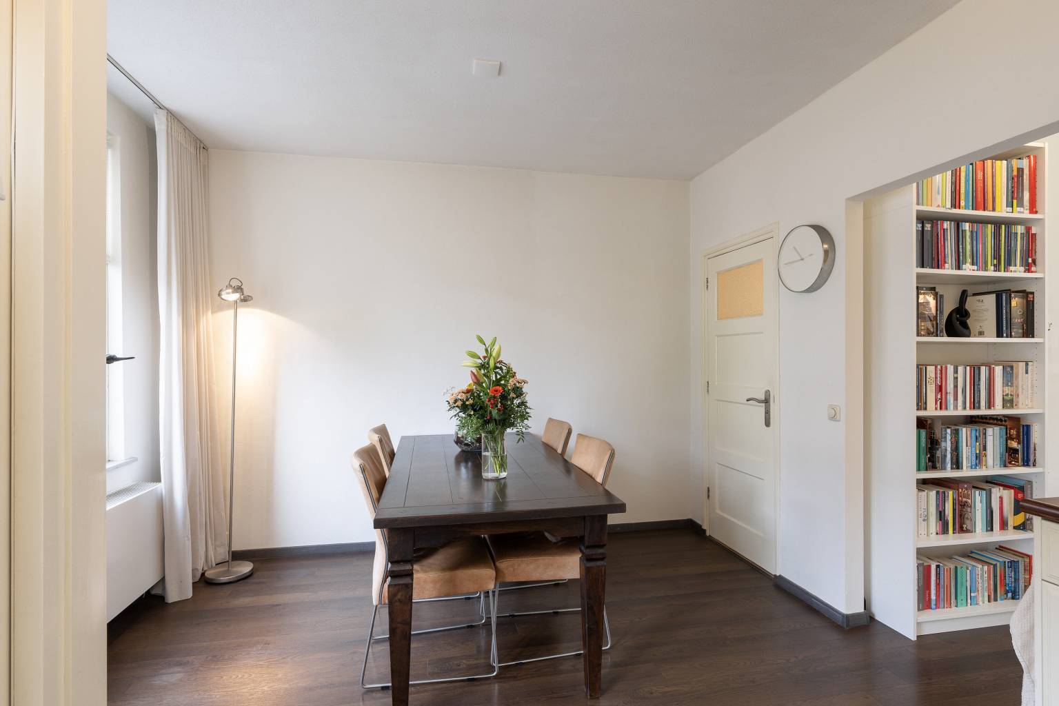 De woonkamer is gesitueerd aan de voorzijde en heeft een grote raampartij met zicht over de straat. In de hoek is er een schouw aanwezig en er is een vaste kast.