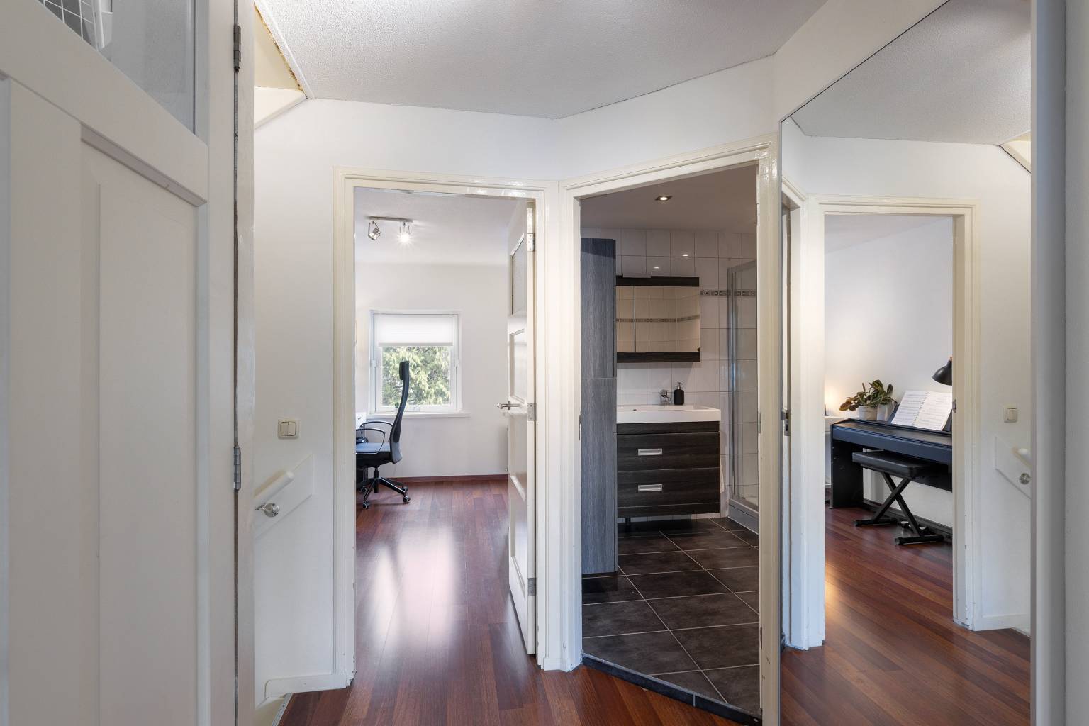 De overloop geeft toegang tot drie slaapkamers, de badkamer en de trap naar de zolder. Alle wanden zijn gestuukt en er ligt een laminaatvloer (met uitzondering van de badkamer).