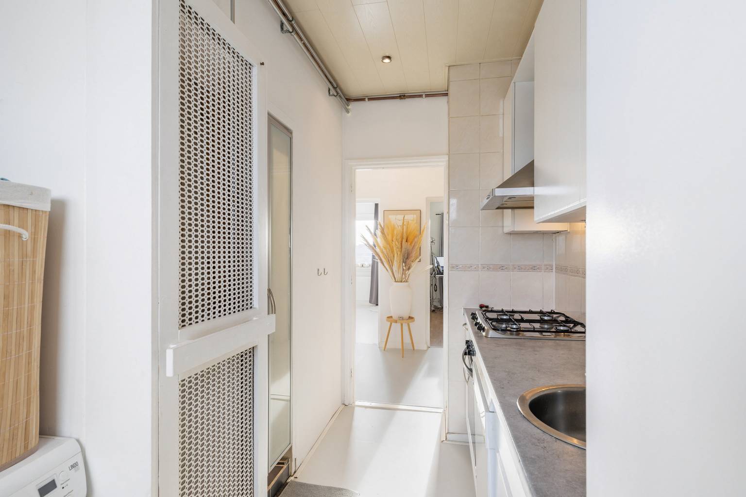 De keuken beschikt over een recht keukenblok met bovenkasten, een hoge kast en een betegelde achterwand. In de keuken is diverse apparatuur aanwezig, zoals een oven, een gaskookplaat en een afzuigkap. Daarnaast bevindt zich in de keuken ook de aansluiting voor de wasmachine, de opstelling van de Cv-ketel en is er via openslaande deuren toegang tot de badkamer. Tevens is het plafond voorzien van inbouw spots.