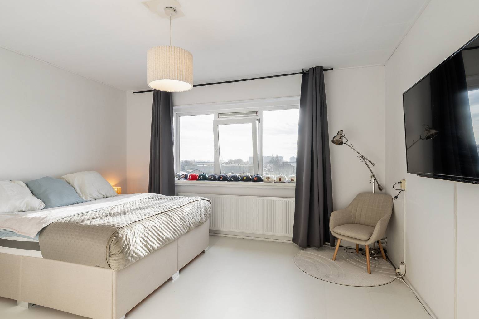 Wonen met karakter, licht en levendigheid. Dit fijne driekamerappartement op de bovenste verdieping combineert het beste van stads wonen met een verrassend rustig thuisgevoel. Op loopafstand van het gezellige centrum van Schiedam vind je hier alles wat het dagelijks leven prettig maakt, van winkels, horeca en cultuur tot het openbaar vervoer en uitvalswegen richting Rotterdam. De omgeving is levendig en divers, terwijl je thuis juist geniet van privacy, vrijheid en een vrij uitzicht over de wijk. Het appartement zelf voelt direct licht en ruim aan dankzij de prettige indeling en grote raampartijen, waaronder een opvallend rond zijraam dat de woonkamer extra sfeer geeft. De open verbinding tussen woonkamer en eetkamer zorgt voor een speels geheel, waarbij de eetkamer ook uitstekend dienst kan doen als werkplek. De ingebouwde haard voegt warmte toe, terwijl de strak gestuukte wanden, houten wandpanelen en doorlopende lichte laminaatvloer zorgen voor een moderne en verzorgde uitstraling. Vanuit zowel de woonkamer als de hoofdslaapkamer is het overdekte balkon bereikbaar, een heerlijke plek om beschut buiten te zitten en van het uitzicht te genieten. Ook praktisch zit het hier goed. Er zijn twee slaapkamers, een nette badkamer, een functionele keuken met diverse apparatuur en ruimte voor de wasmachine. Tevens is er de beschikking over een eigen externe berging op de begane grond. Het complex is afgesloten en verzorgd, wat bijdraagt aan een veilig en prettig woongevoel. Met kunststof kozijnen en dubbel glas, een fijne topverdieping zonder bovenburen en een centrale ligging is dit een appartement waar comfort en stadse dynamiek mooi samenkomen.