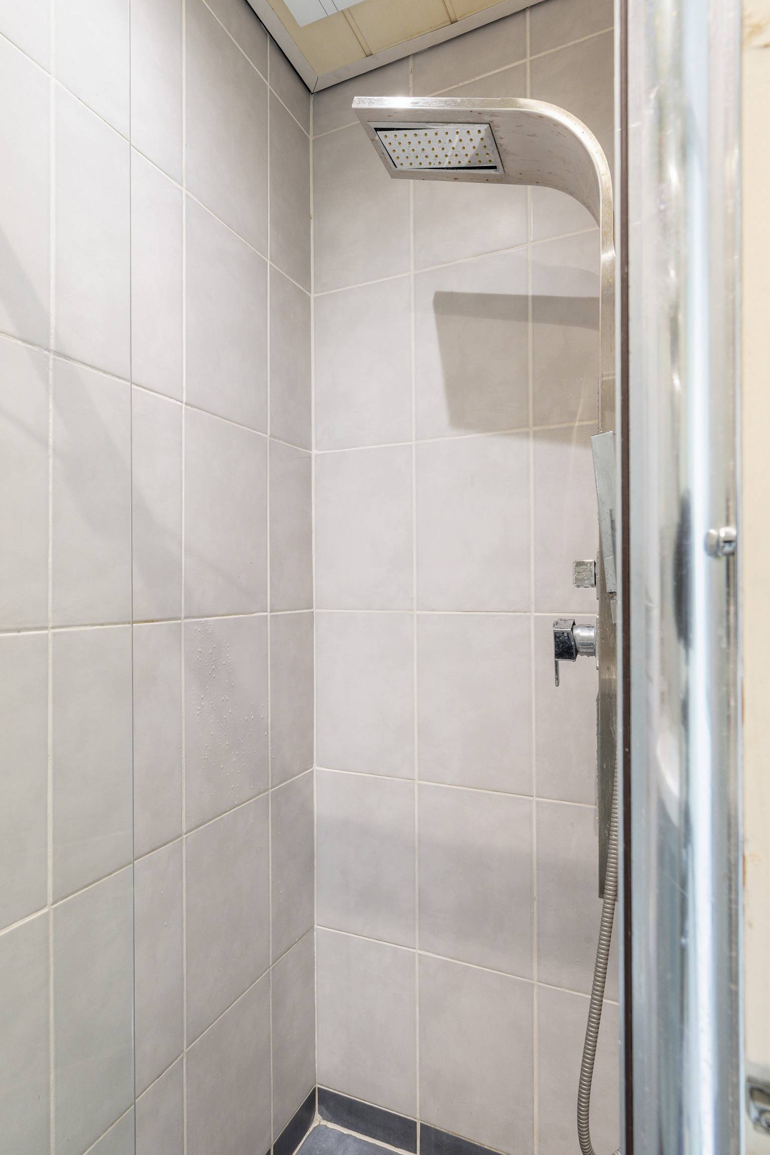 De inpandige badkamer is volledig betegeld en praktisch voorzien van een douche en een wastafel.