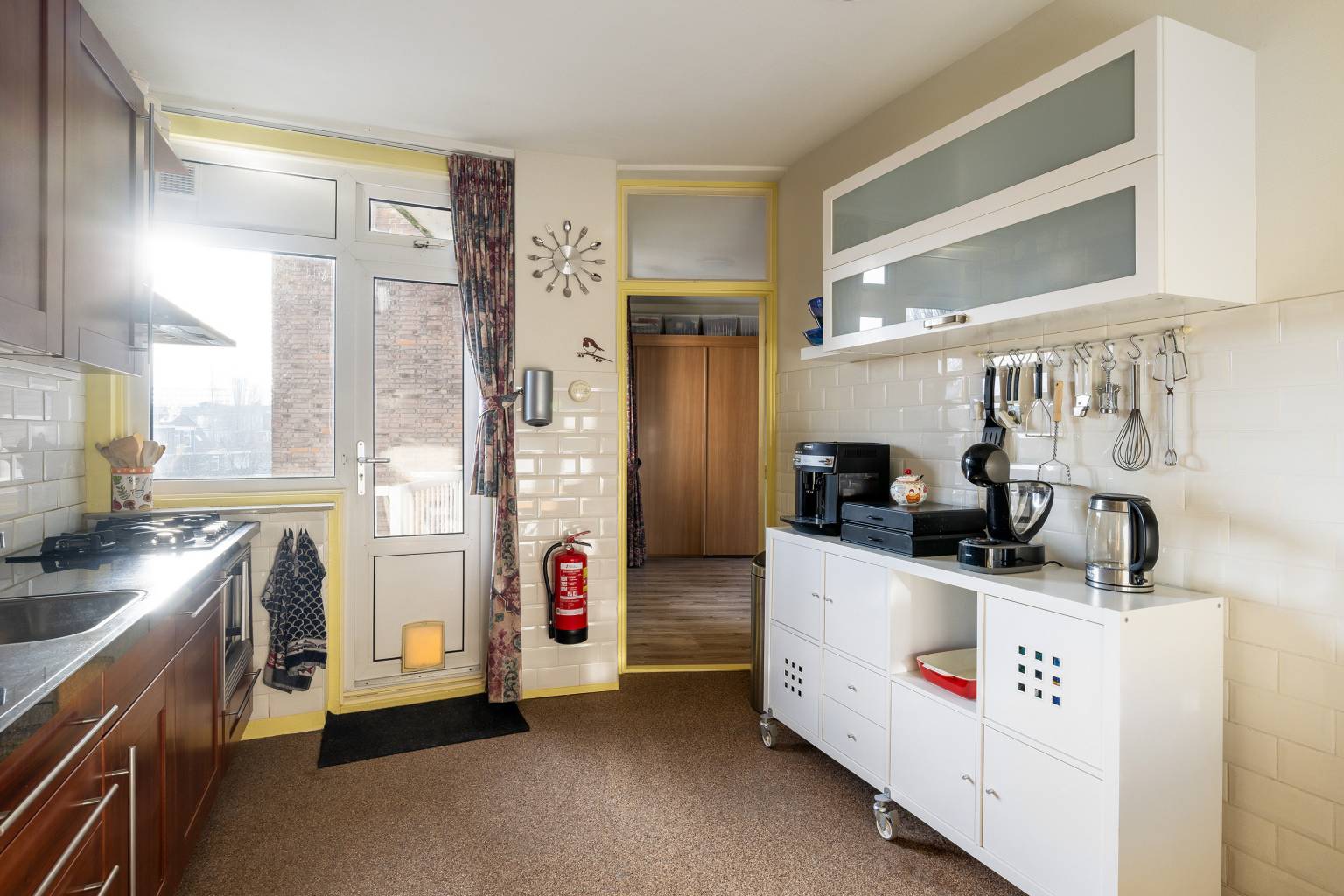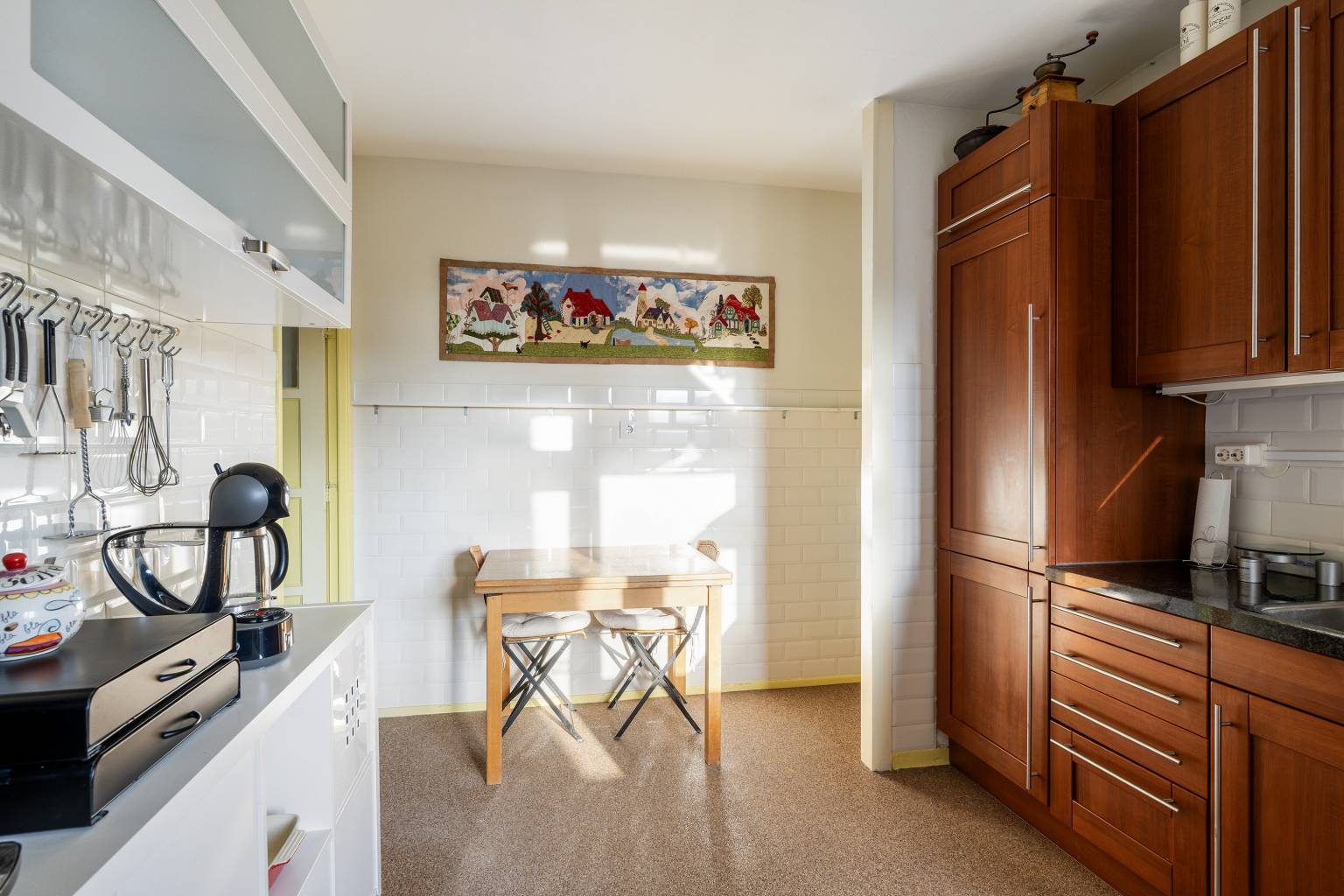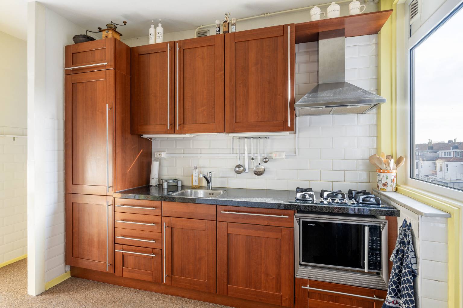 De keuken is de verbindingsruimte naar de overige twee slaapkamers en het balkon. De keuken beschikt over een recht keukenblok met bovenkasten en diverse inbouwapparatuur. De achterwand is volledig betegeld en de andere wanden zijn halfhoog betegeld. Door de ruime afmeting is er genoeg ruimte voor extra kasten en zelfs een eethoek.