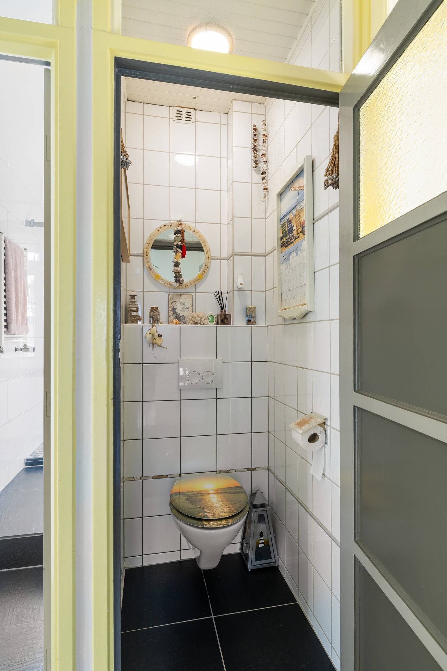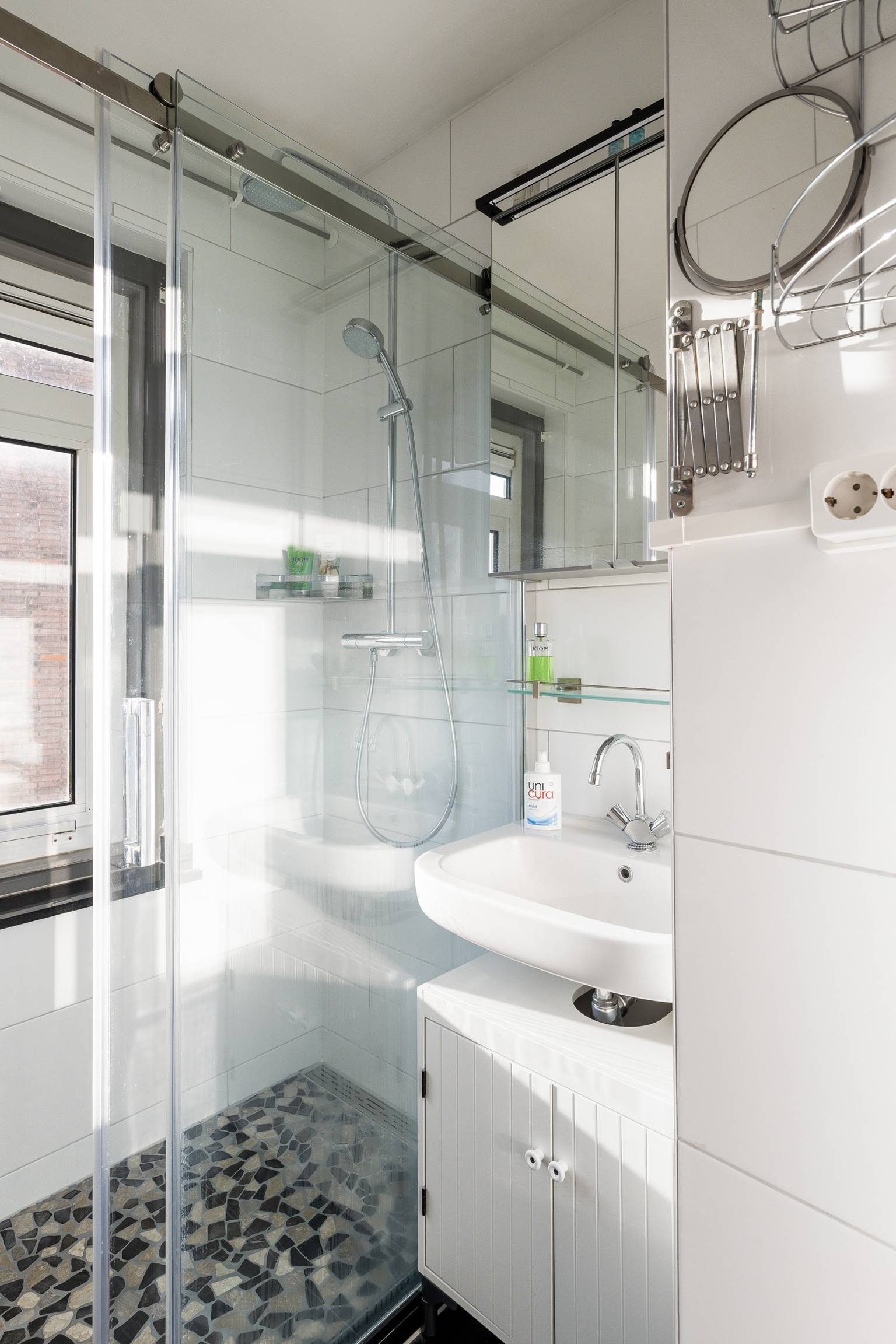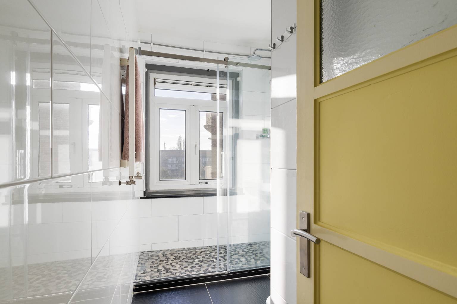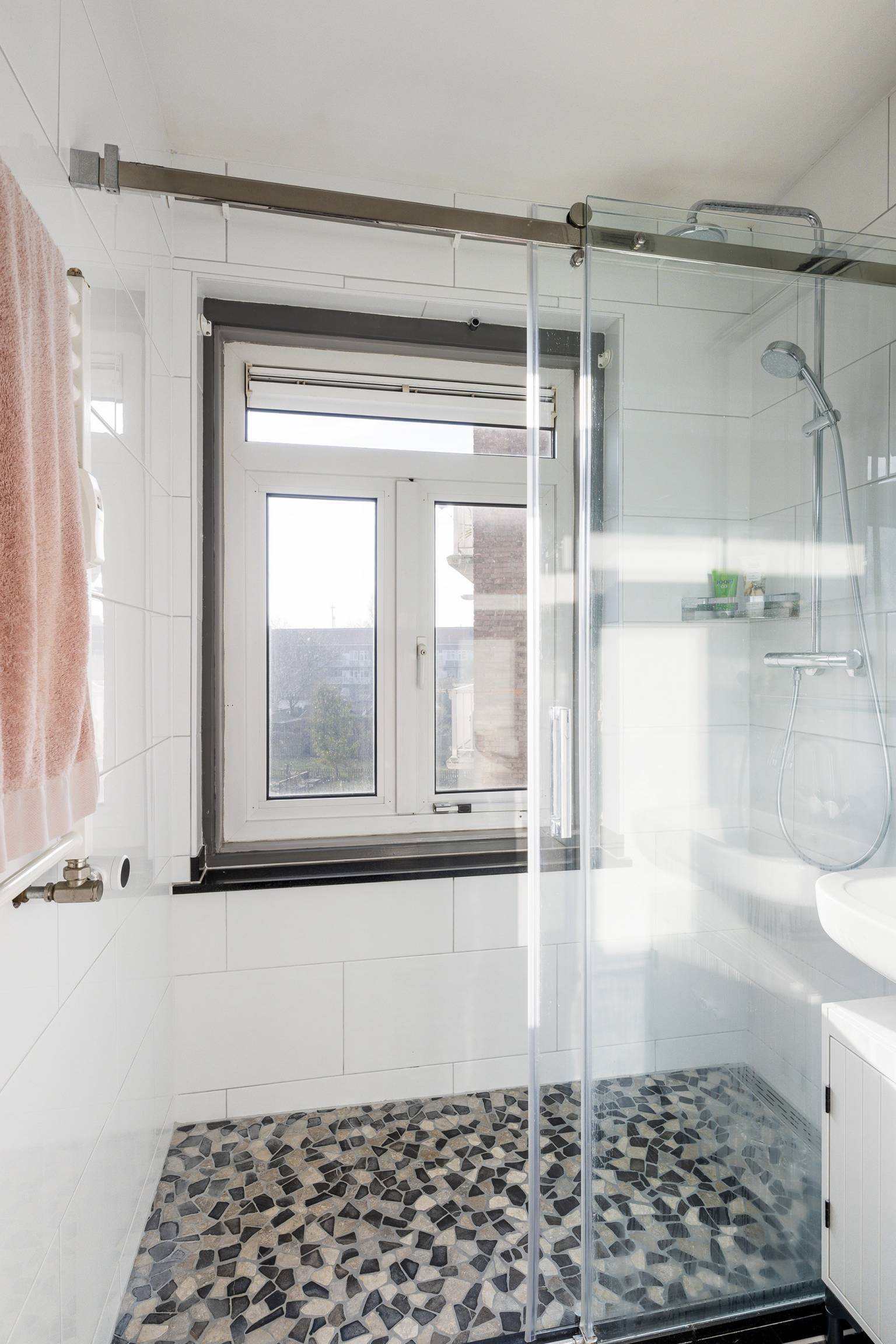 De volledig betegelde badkamer is uitgerust met een inloopdouche en een wastafel. Ook is er een te openen raam voor natuurlijke ventilatie en hangt er een handdoeken radiator.