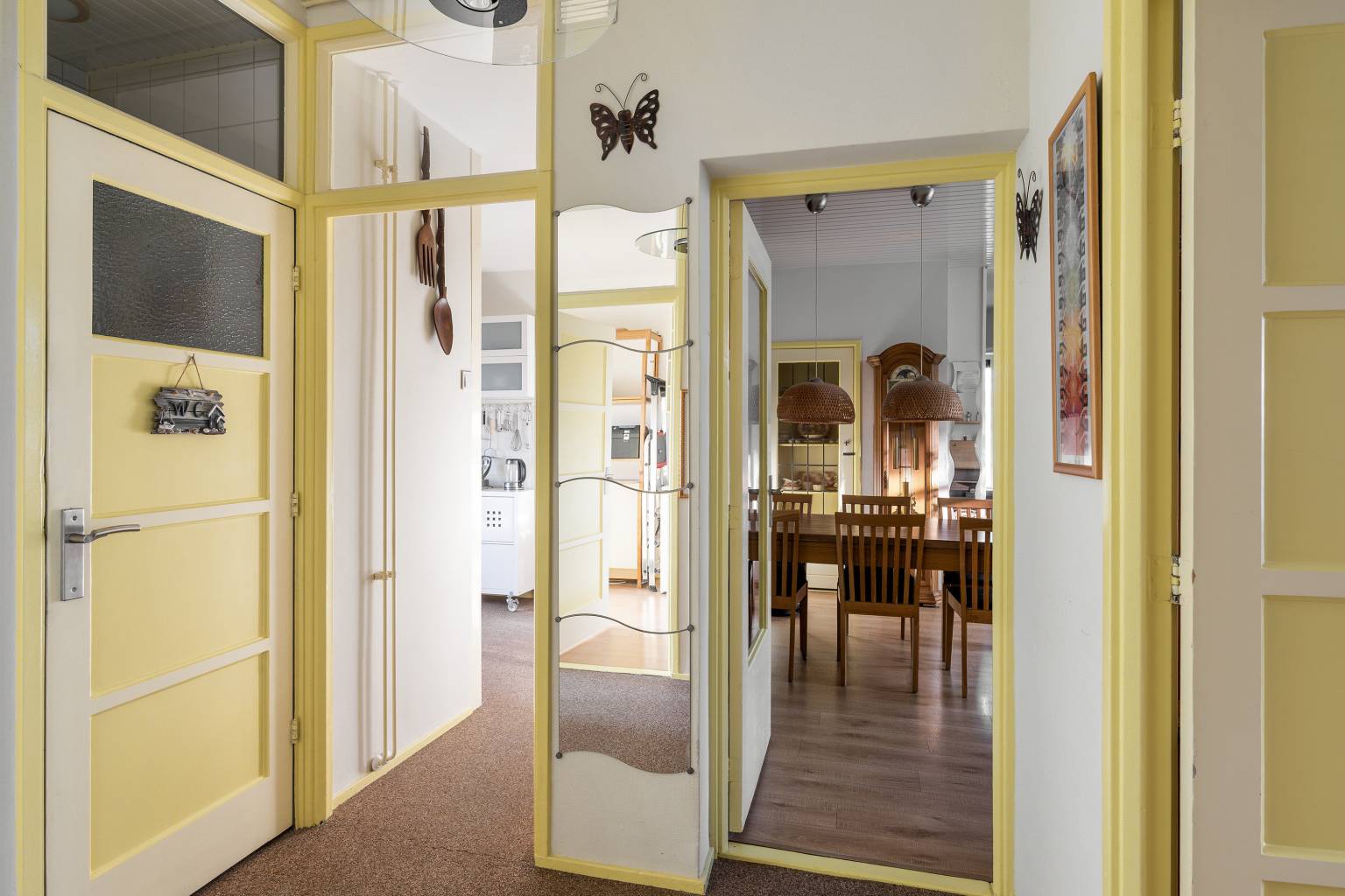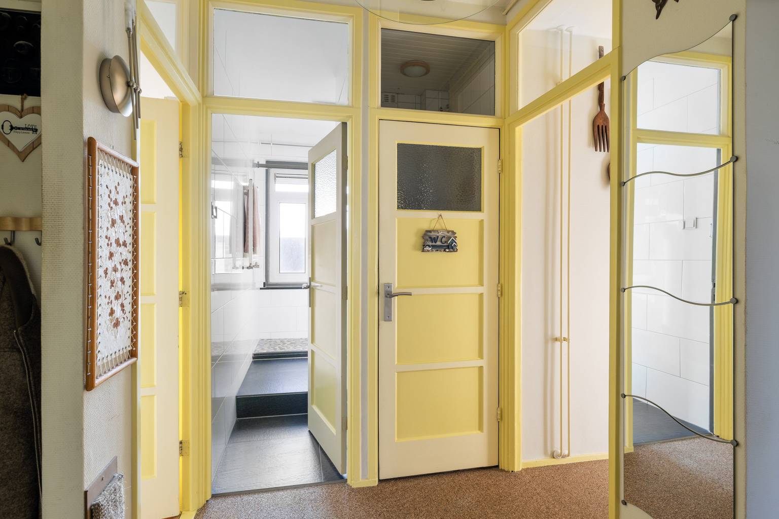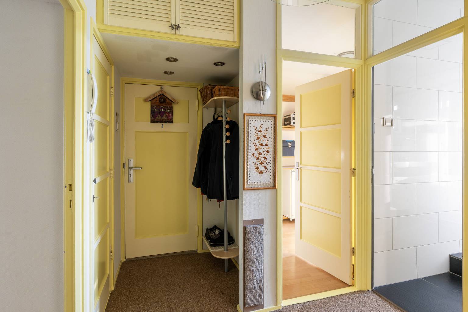 Na de voordeur is er een binnenkomst in de hal met een open voorportaal. Hier is ruimte voor de garderobe en zorgen de vaste kast en de kast boven het verlaagde plafond met inbouw spots, voor extra opbergmogelijkheden. Verder is er vanuit de hal toegang tot de wasruimte, de badkamer, het volledig betegelde toilet, de keuken, de woonkamer en de eerste slaapkamer. De wanden zijn afgewerkt met glasweefselbehang en op de vloer ligt siergrind dat is doorgetrokken naar de keuken.