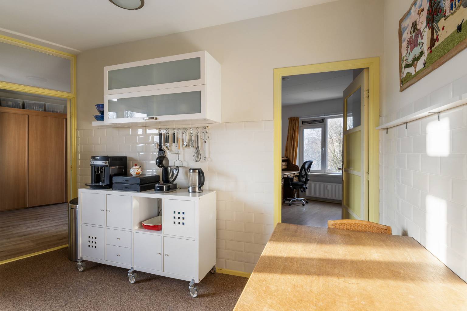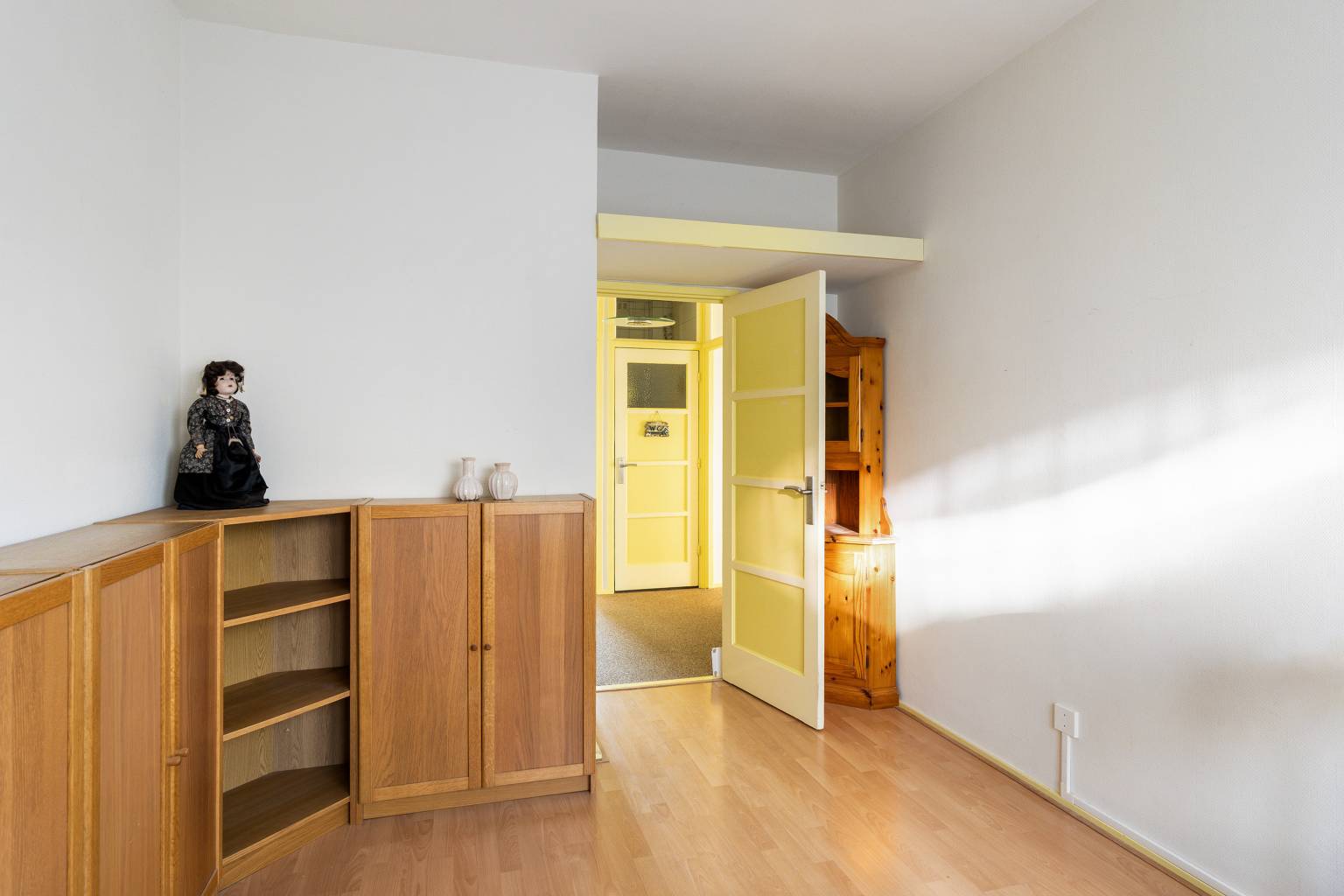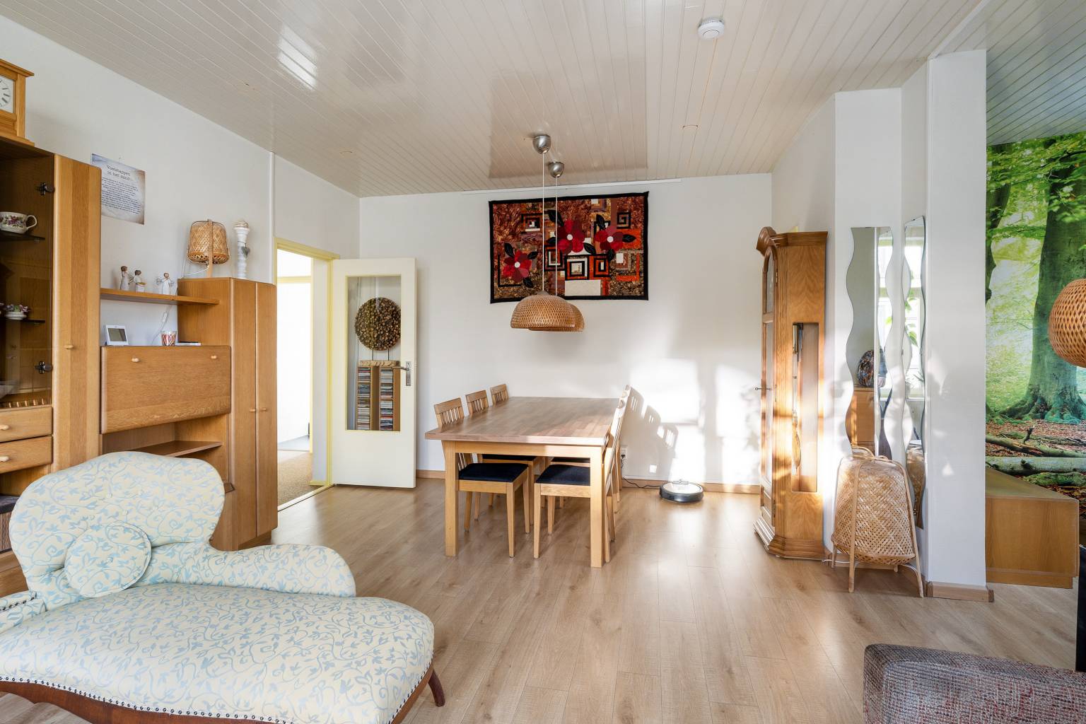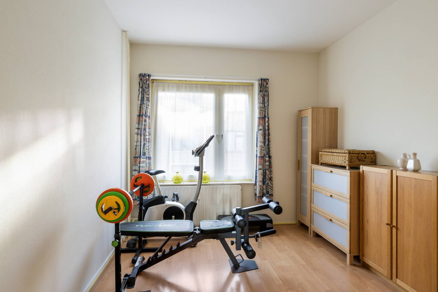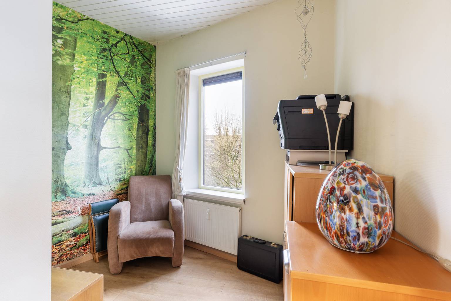 De woonkamer is heerlijk licht door het grote raam en het extra zijraam. De ruimte leent zich prima voor zowel een zit- als een eethoek en heeft een vaste kast met een deur die is voorzien van een glas-in-lood raam. Extra fijn is hier de aangrenzende zijkamer met speelse schuine wanden. Ook hier een raam voor daglicht en daardoor kan deze ruimte perfect worden gebruikt als werk-/hobbyruimte. Ook hier zijn de wanden afgewerkt met glasweefselbehang en is de vloer voorzien van laminaat.