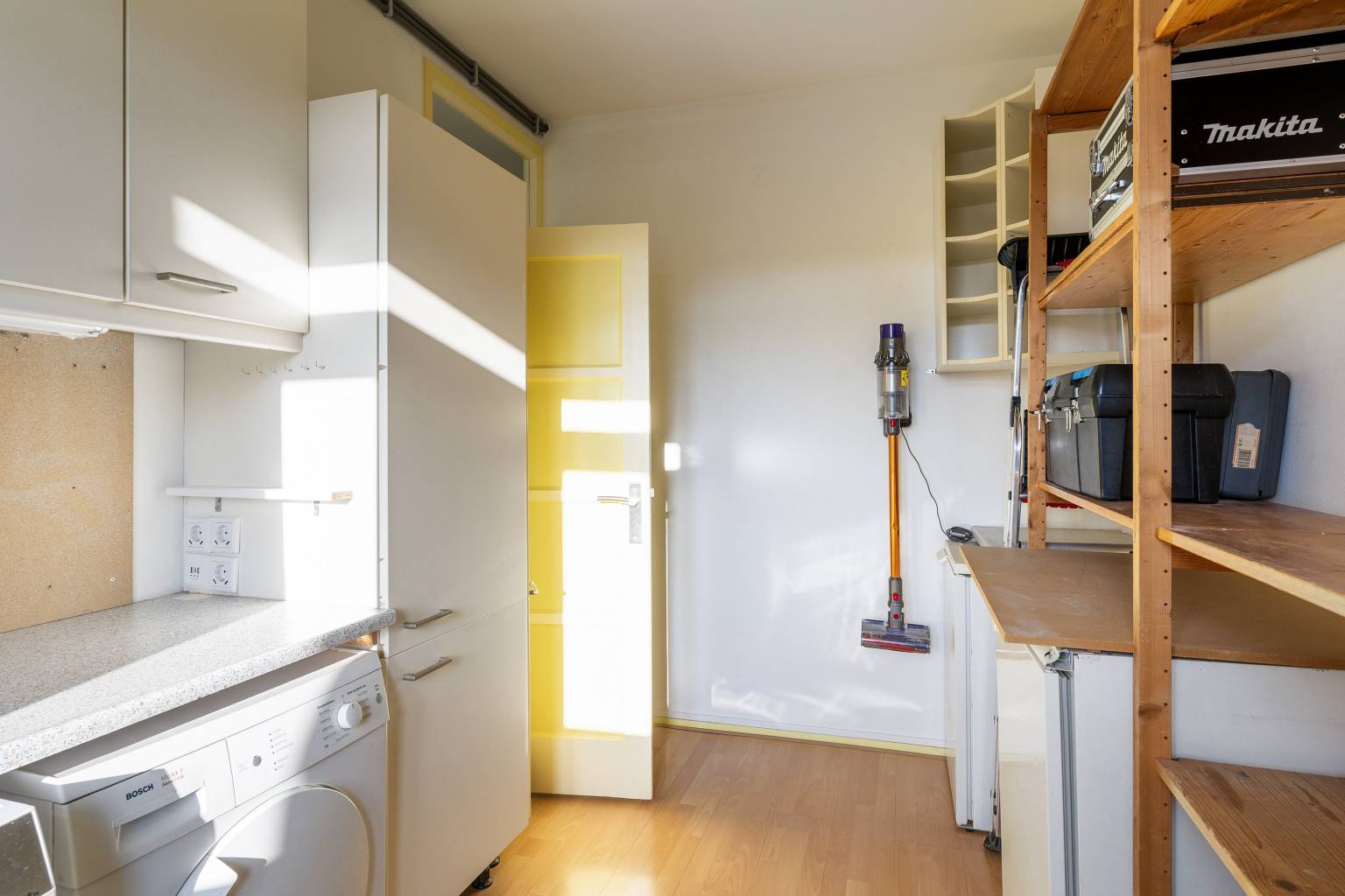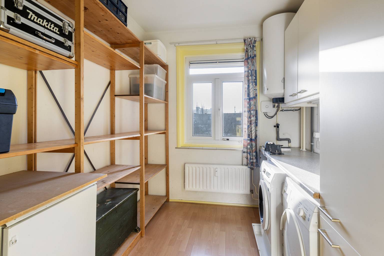 Een kamer die ingericht is als wasruimte, deze ruimte is voorzien van een werkblad met daaronder de aansluiting voor de wasmachine en de droger. Daarnaast hangt de boiler voor het warme water en is er voldoende plaats voor het opbergen van diverse spullen. De wanden zijn voorzien van glasweefselbehang en op de vloer ligt laminaat.